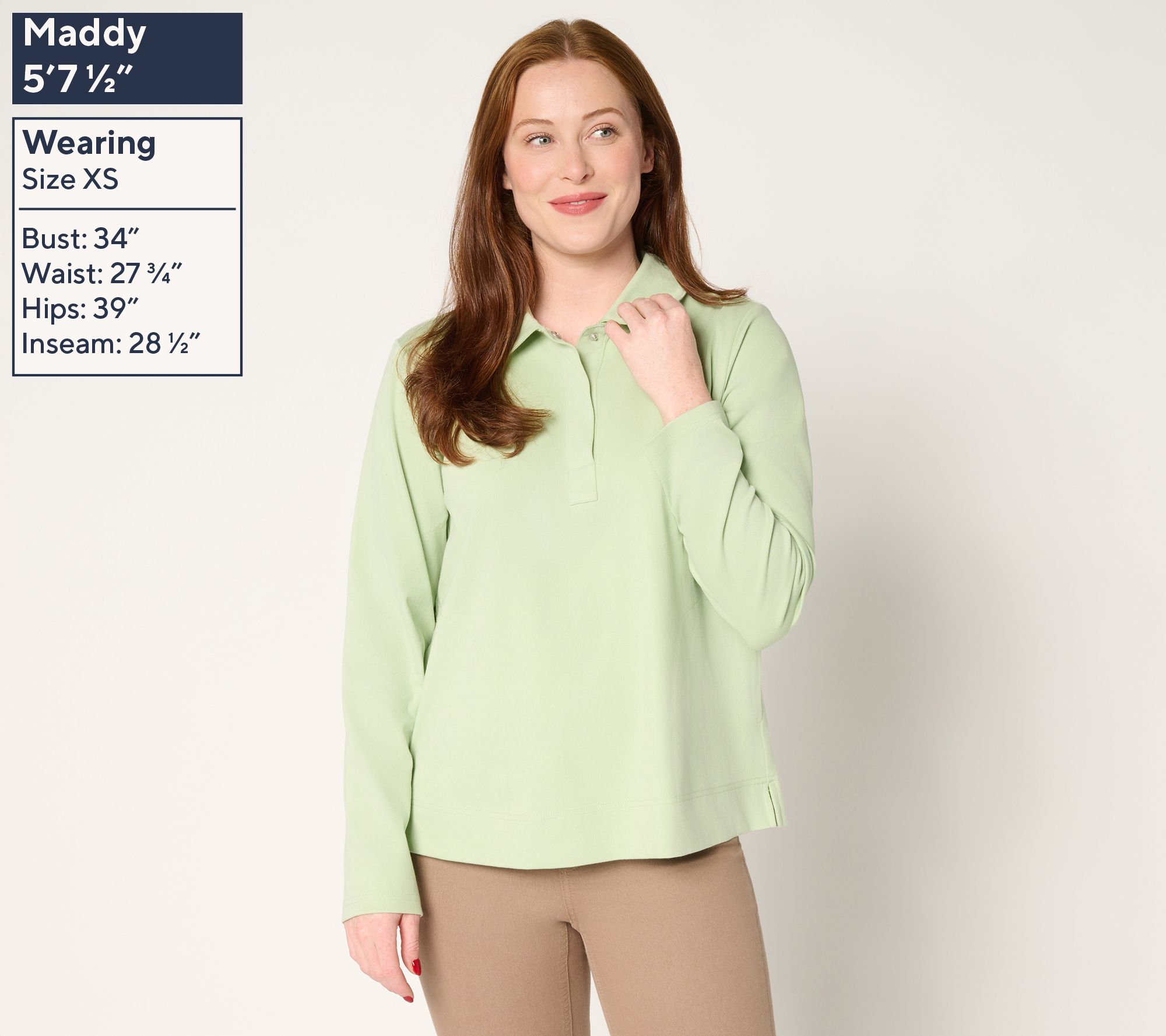 Start your morning coffee run or meet up with friends in the relaxed, modern style of this popover top, crafted in soft knit with a touch of stretch for added comfort. Snap it up at the collared placket for a polished feel, or leave a few open for a casual look -- thanks to roomy side seam pockets and gentle back pleats, it's ideal for everyday wear. From Denim & Co.® Fashions.