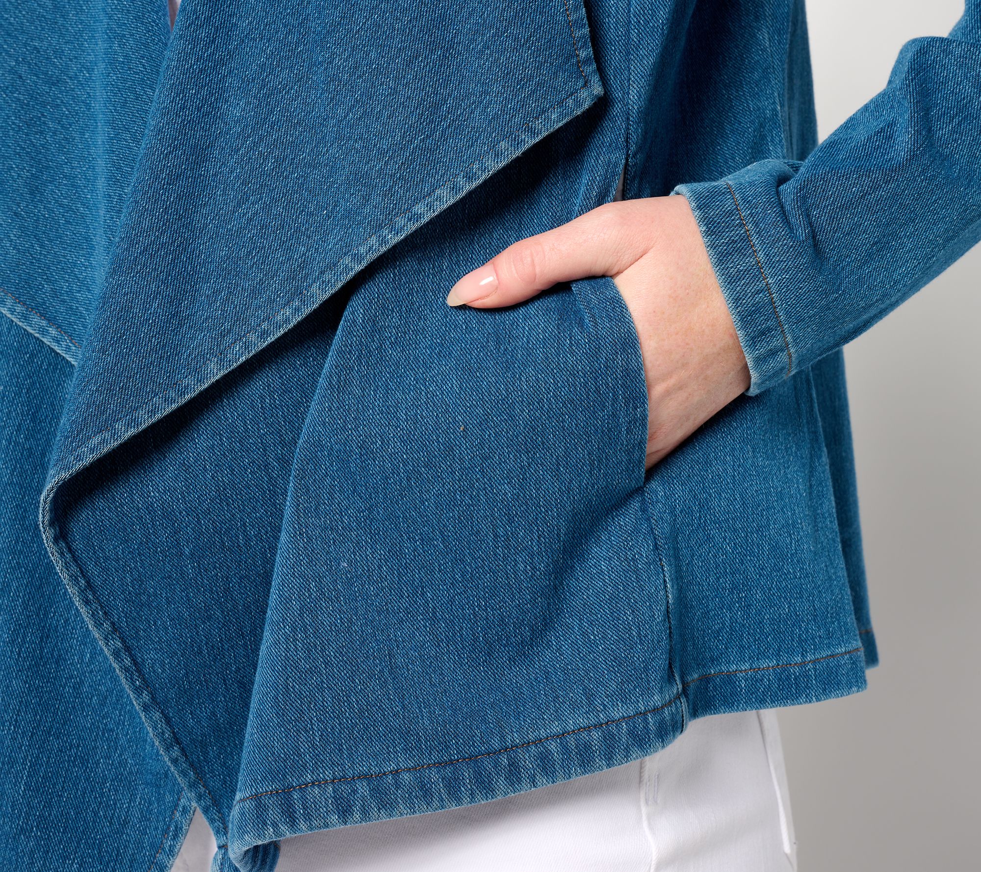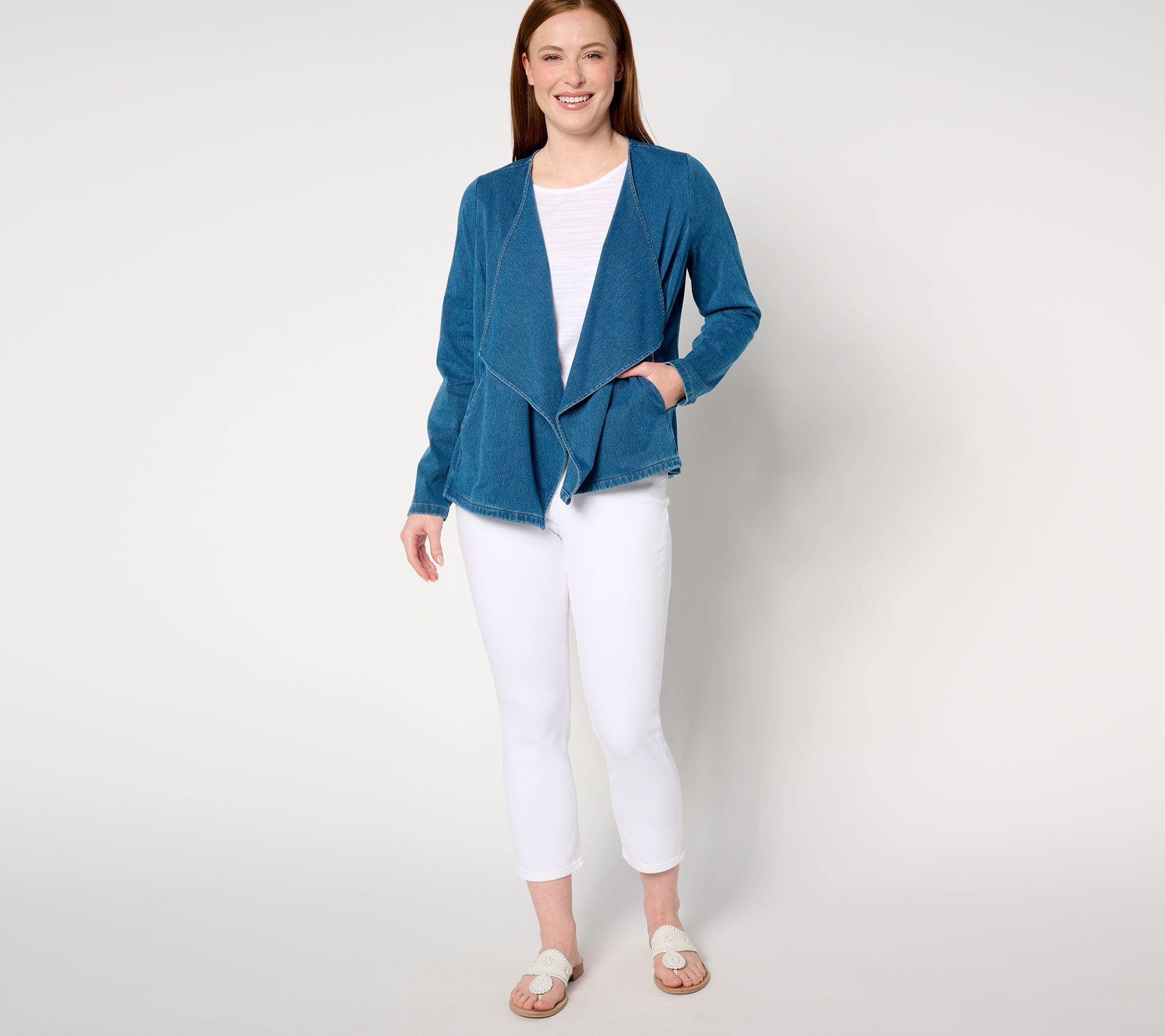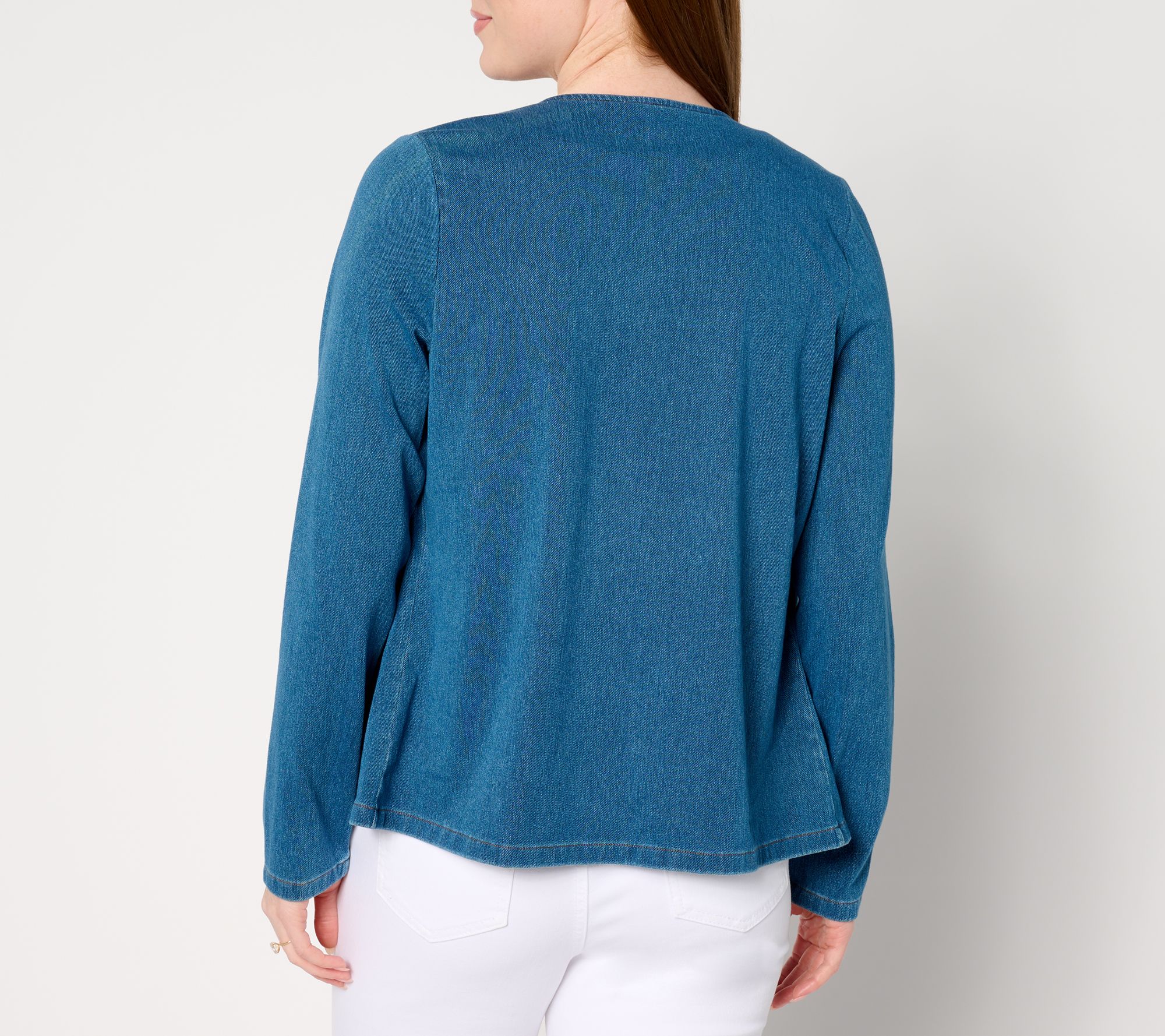 A comfy knit and as light as air -- sounds like the perfect combo for a summer-ready jacket! Reach for this drapey denim-look layer when heading outside in breezy weather, or take it along for overly air-conditioned restaurants and movie theaters. From Denim & Co.® Fashions.