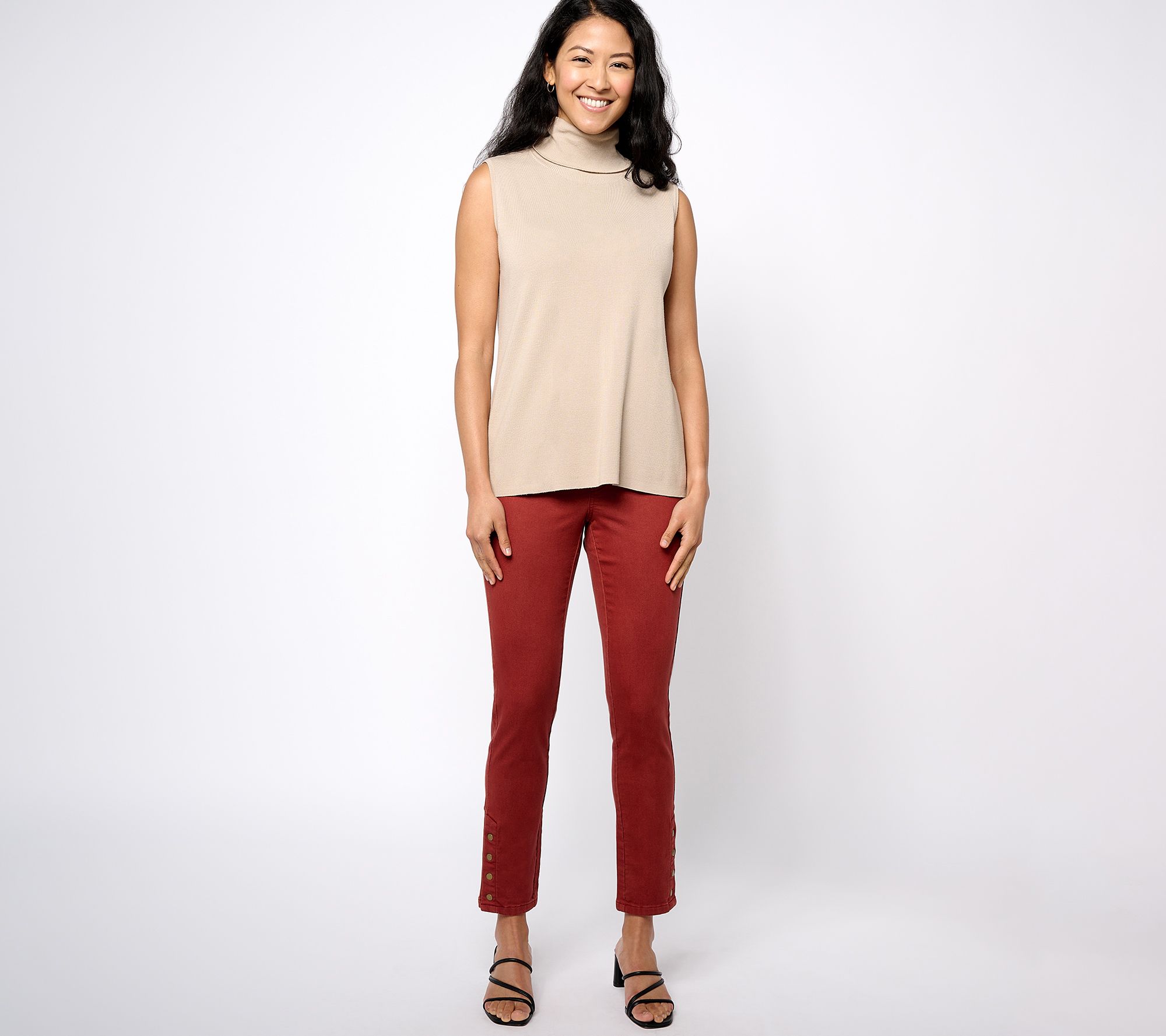 Flaunt your figure in these straight-leg pants -- the slim silhouette contours the lines of your body and accentuates your curves. A button placket at the hem creates a custom look that highlights your fabulous footwear. From Denim & Co.® Fashions.