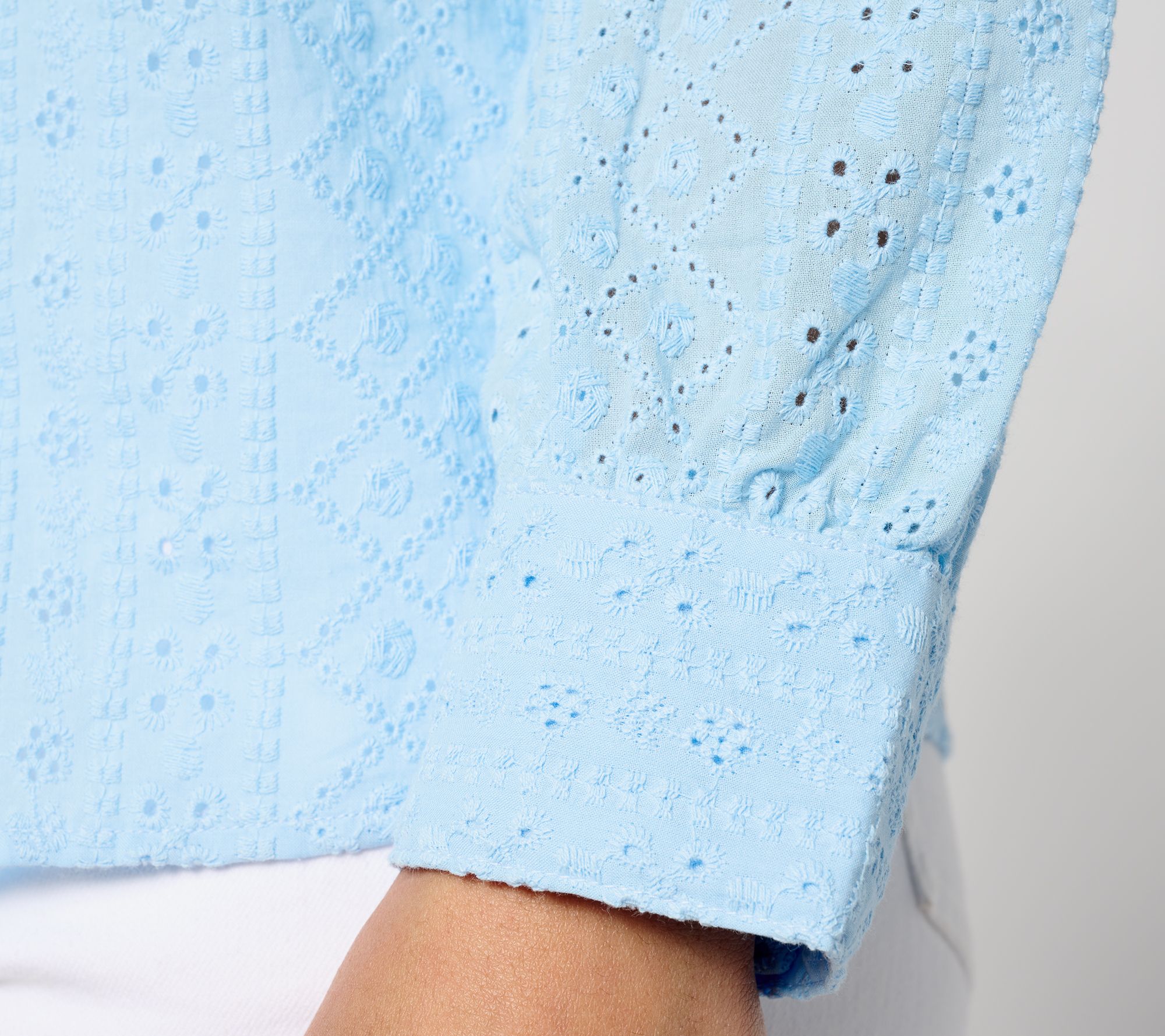 • Features: eyelet, center-front placket with button front, long sleeves with button cuffs, Y-neckline, bust darts, straight bottom hem with side slits