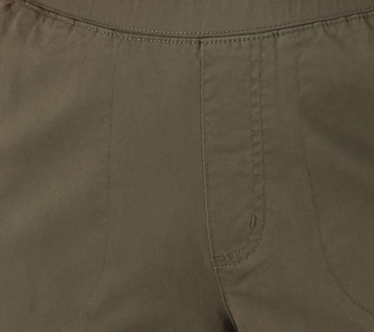 • Features: pull-on style, self-folded elastic waistband, faux fly, gathered back, front-slash pockets, side slits