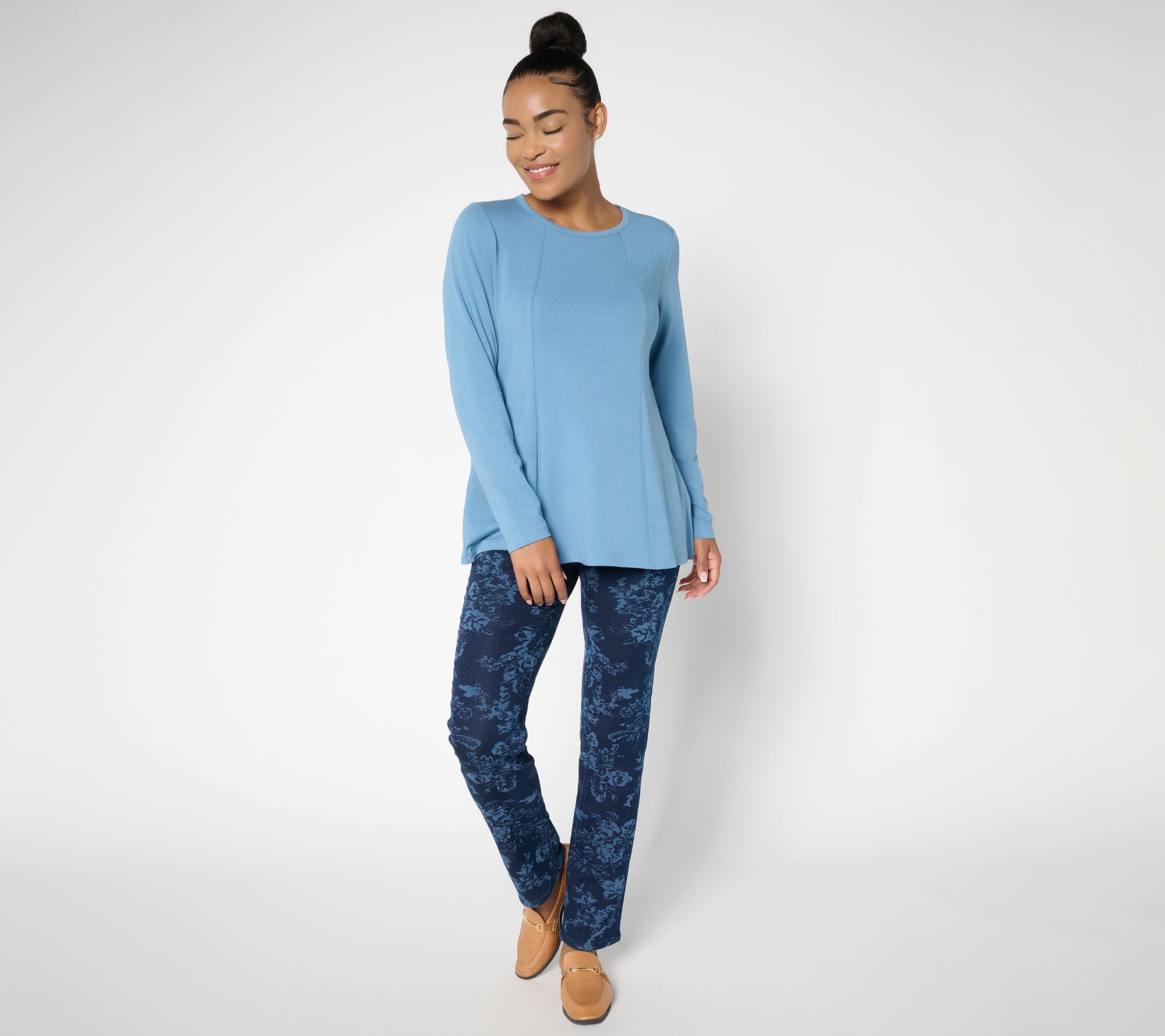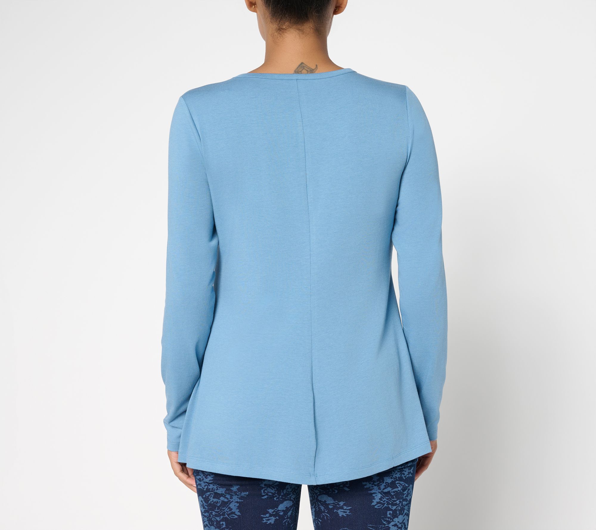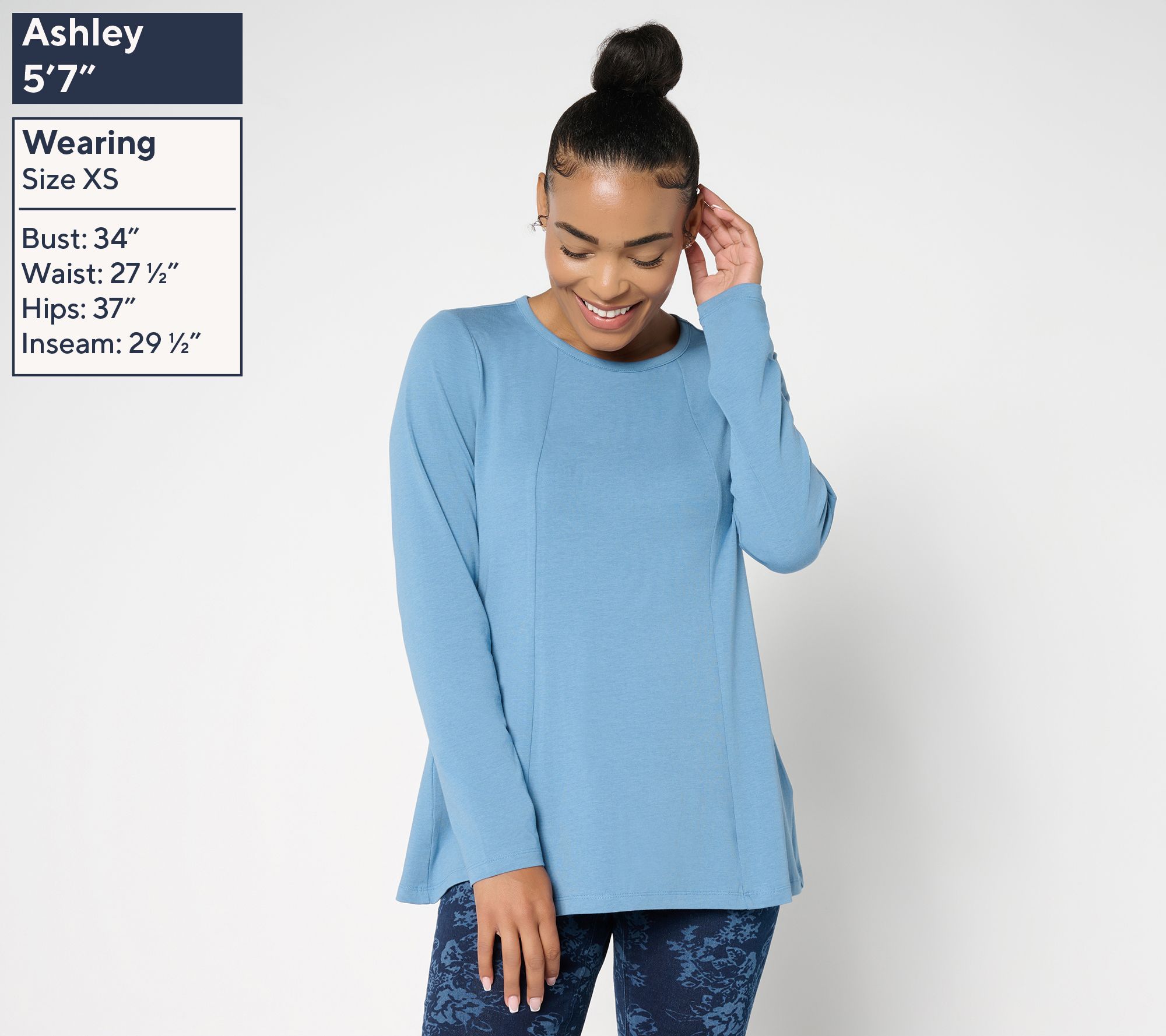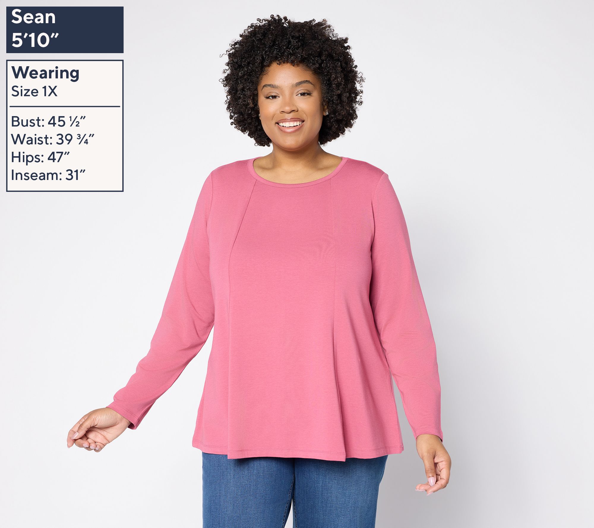 Update your everyday rotation with this knit top -- styled with a flattering fit-and-flare silhouette, round neckline, and long sleeves. Thoughtful seams and a trapeze turnback hem offer gentle shaping, while side slits give added comfort and movement for busy days or relaxed moments. From Denim & Co.® Fashions.