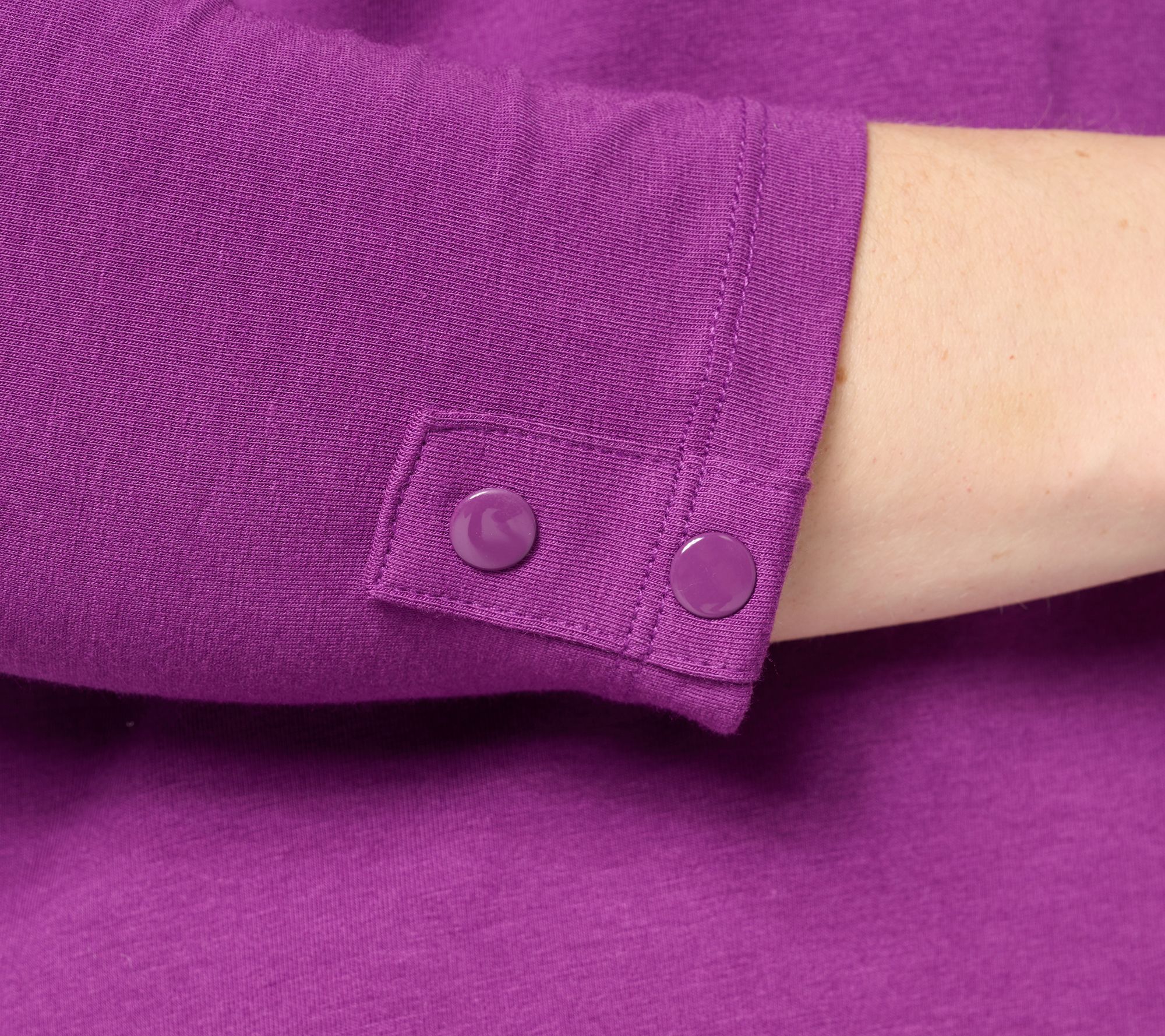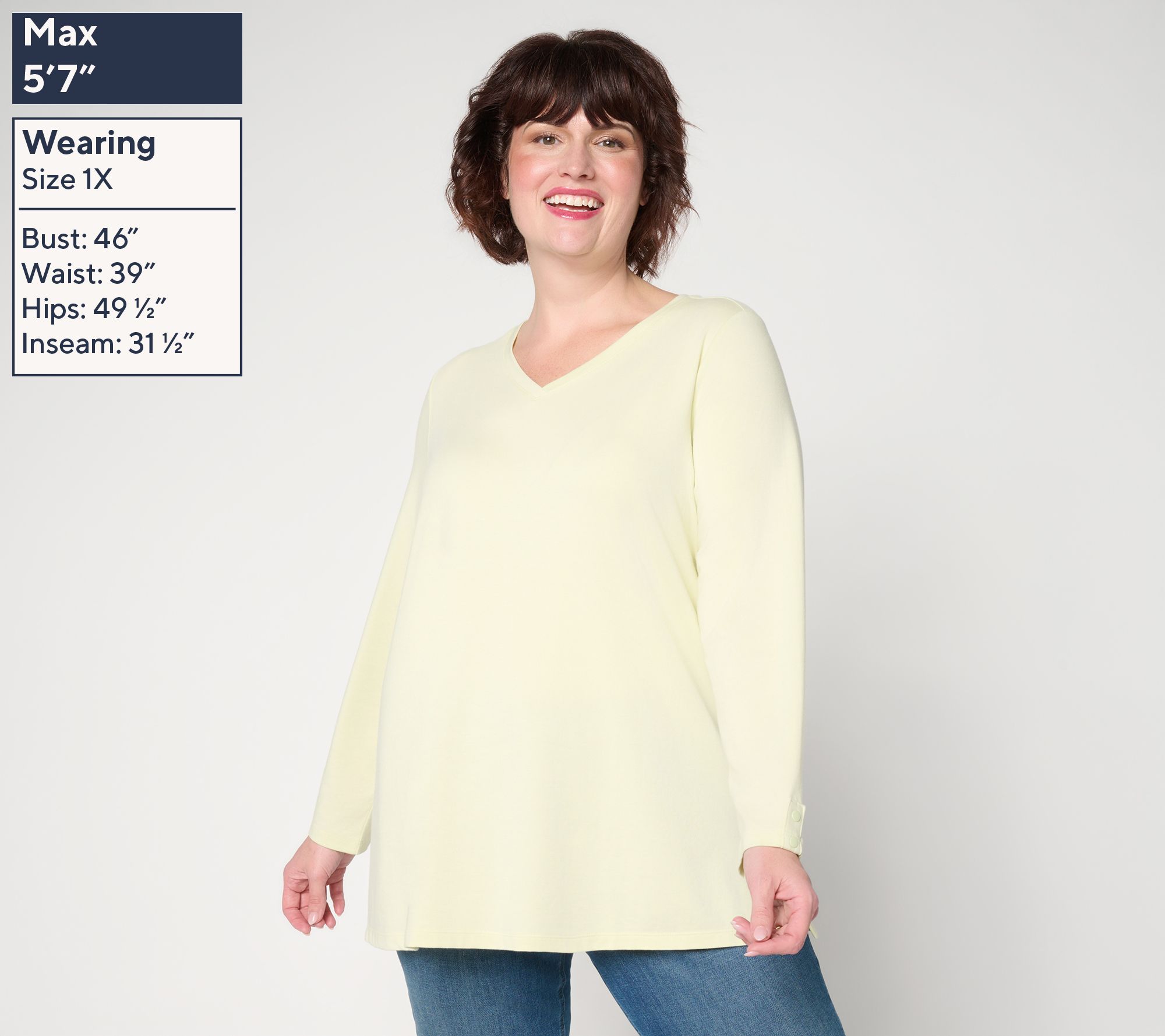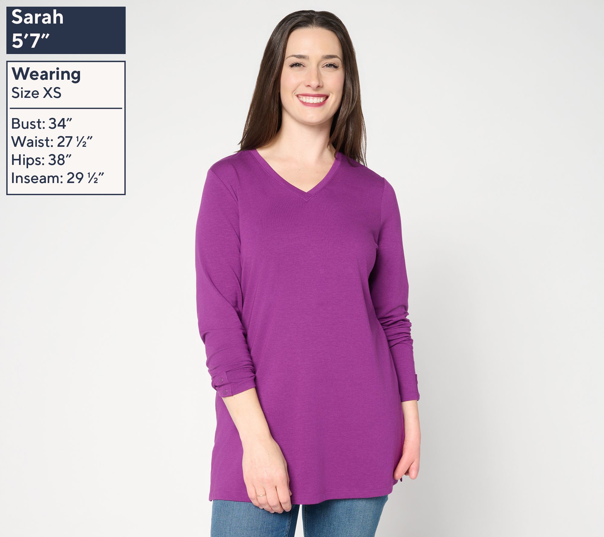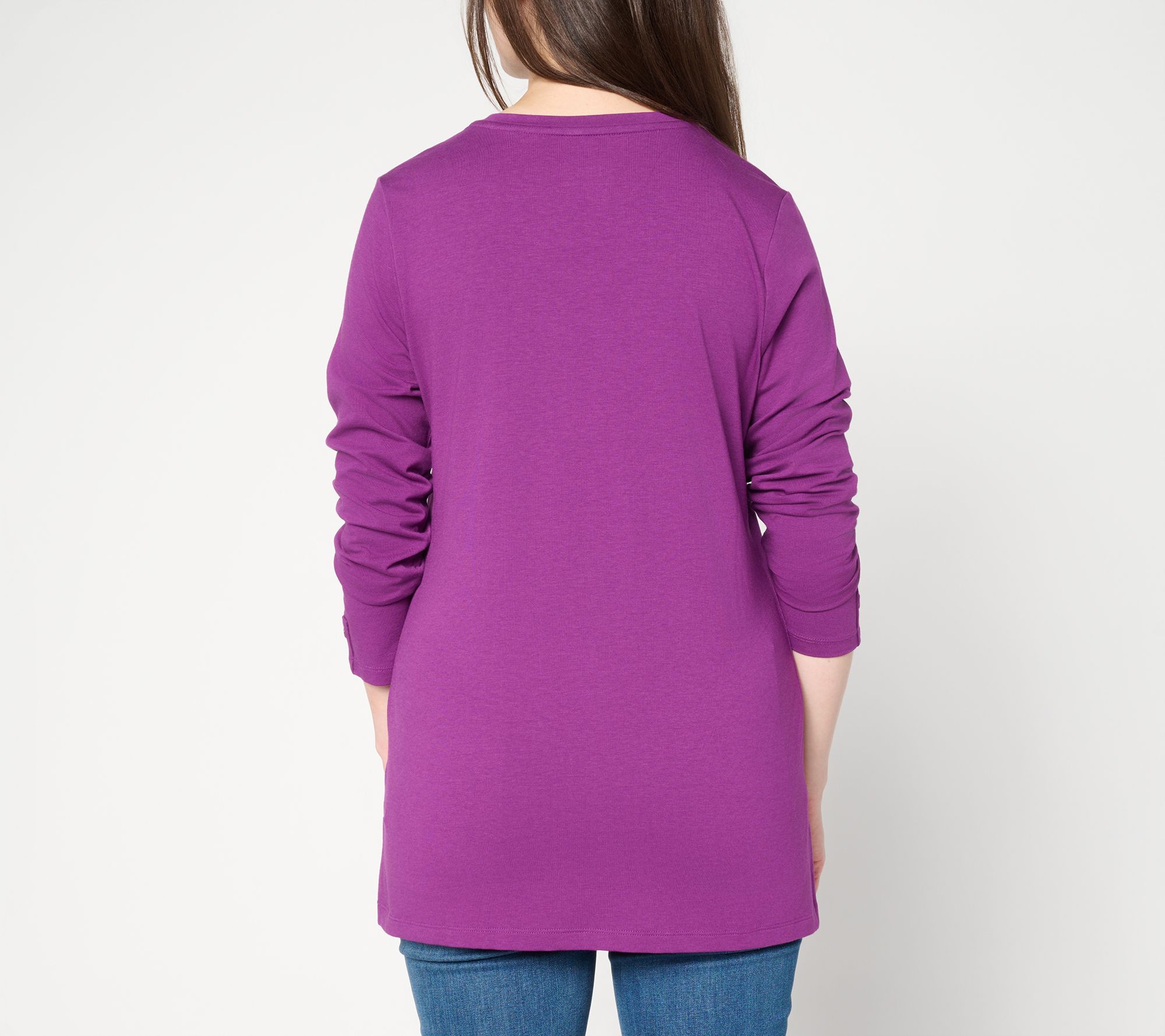 Enjoy a cozy evening in or head out to meet-and-greet friends in this knit tunic that brings comfort and polish to everyday plans. The soft jersey fabric, V-neckline, and chic button details at the sleeves add a touch of style, while side slits offer easy movement and versatility. From Denim & Co.® Fashions.