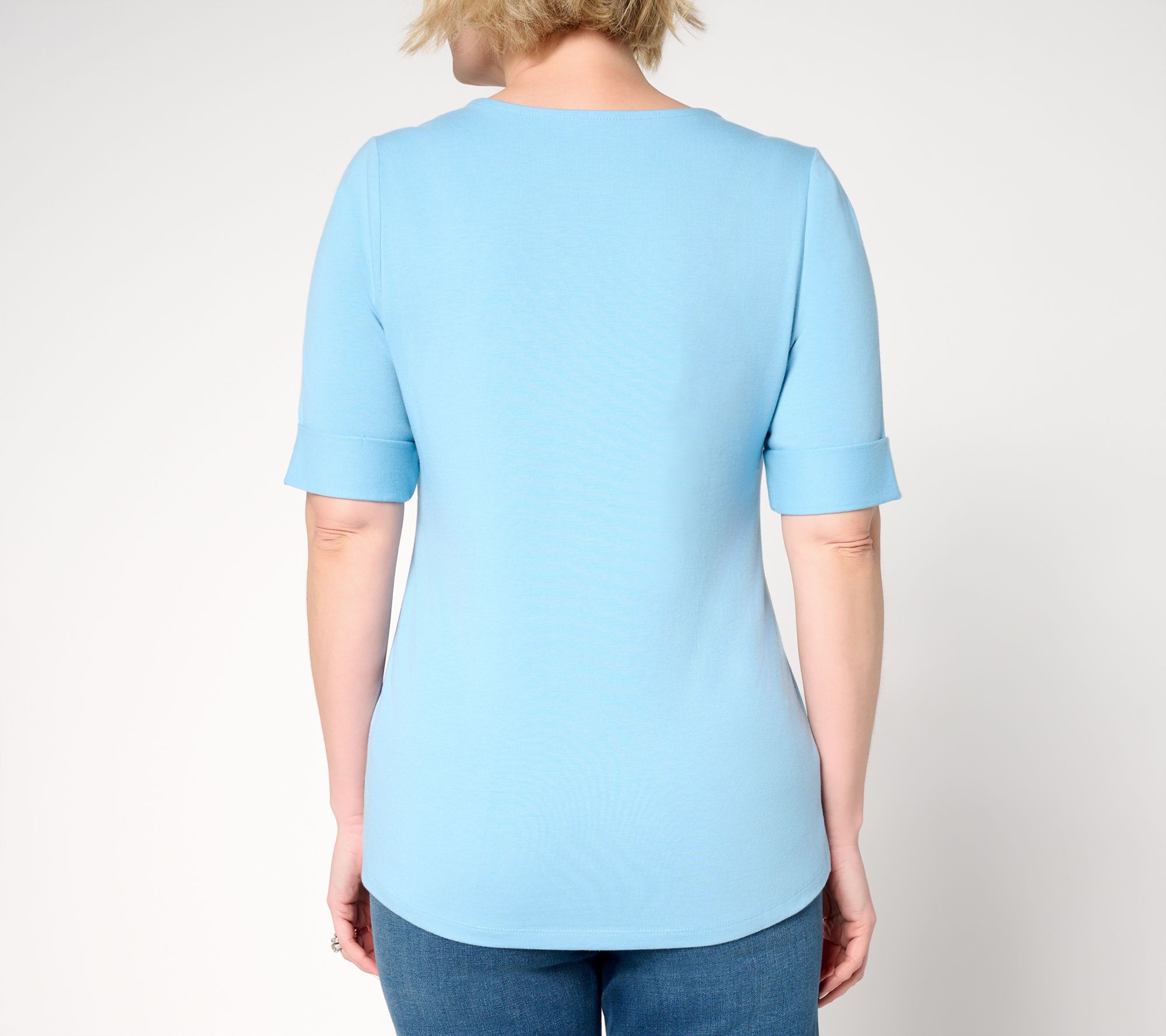 Ready for a fresh take on your favorite basics? Yes, please! This elbow-sleeve top has go-anywhere vibes with its neatly rolled cuffs, Perfect Jersey comfort, and versatile style that works just as well with jeans as it does with midi skirts. The shape flatters without feeling tight -- a true closet essential you'll want to reach for on repeat. From Denim & Co.® Fashions.