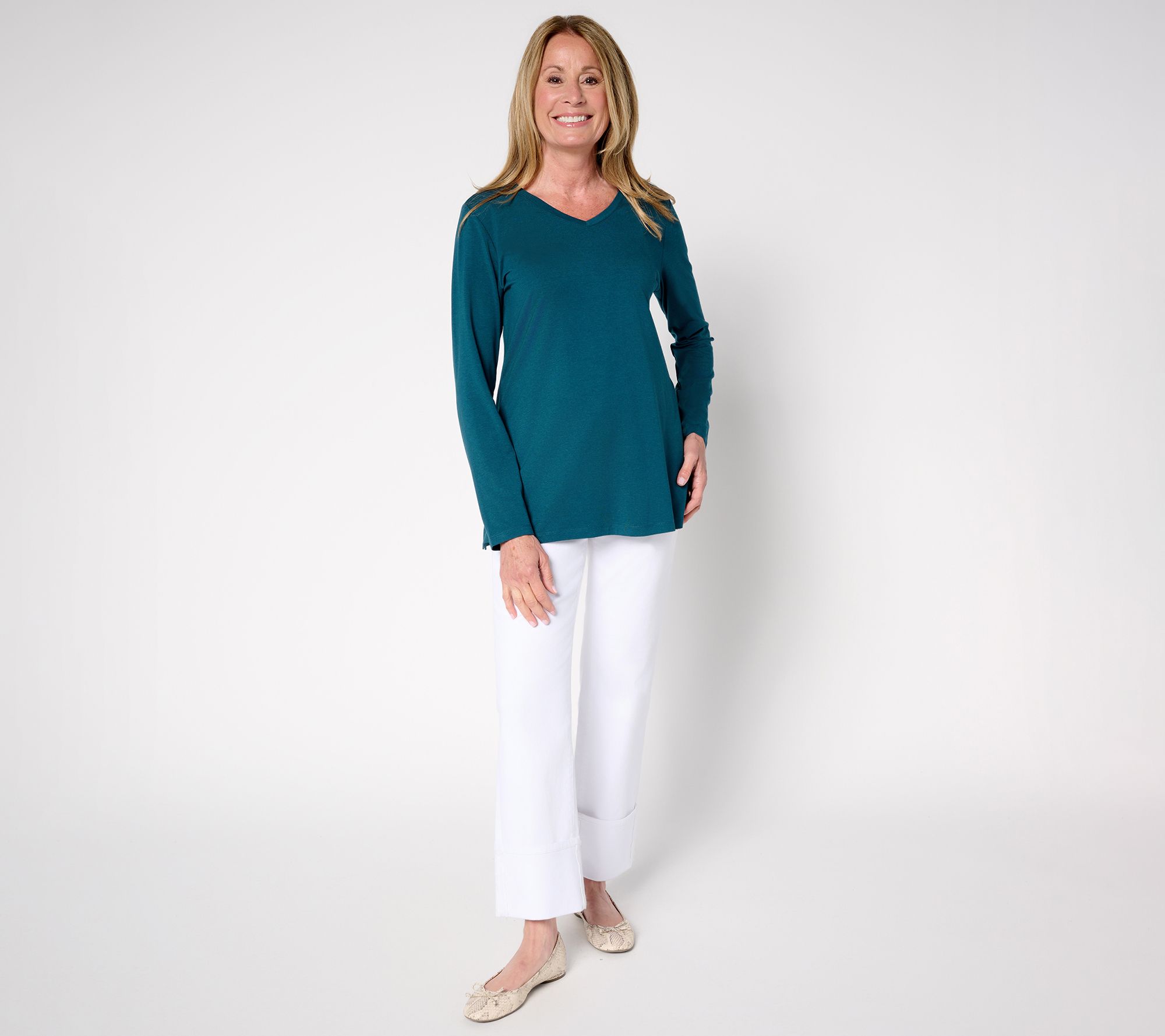 Easy style meets all-day comfort in this So Soft Jersey tunic, designed to take you from weekday errands to weekend lounging. With a flattering V-neckline, long sleeves, and side slits at the hem, this top layers seamlessly with leggings or jeans for countless outfit options. From Denim & Co.®. Fashions.