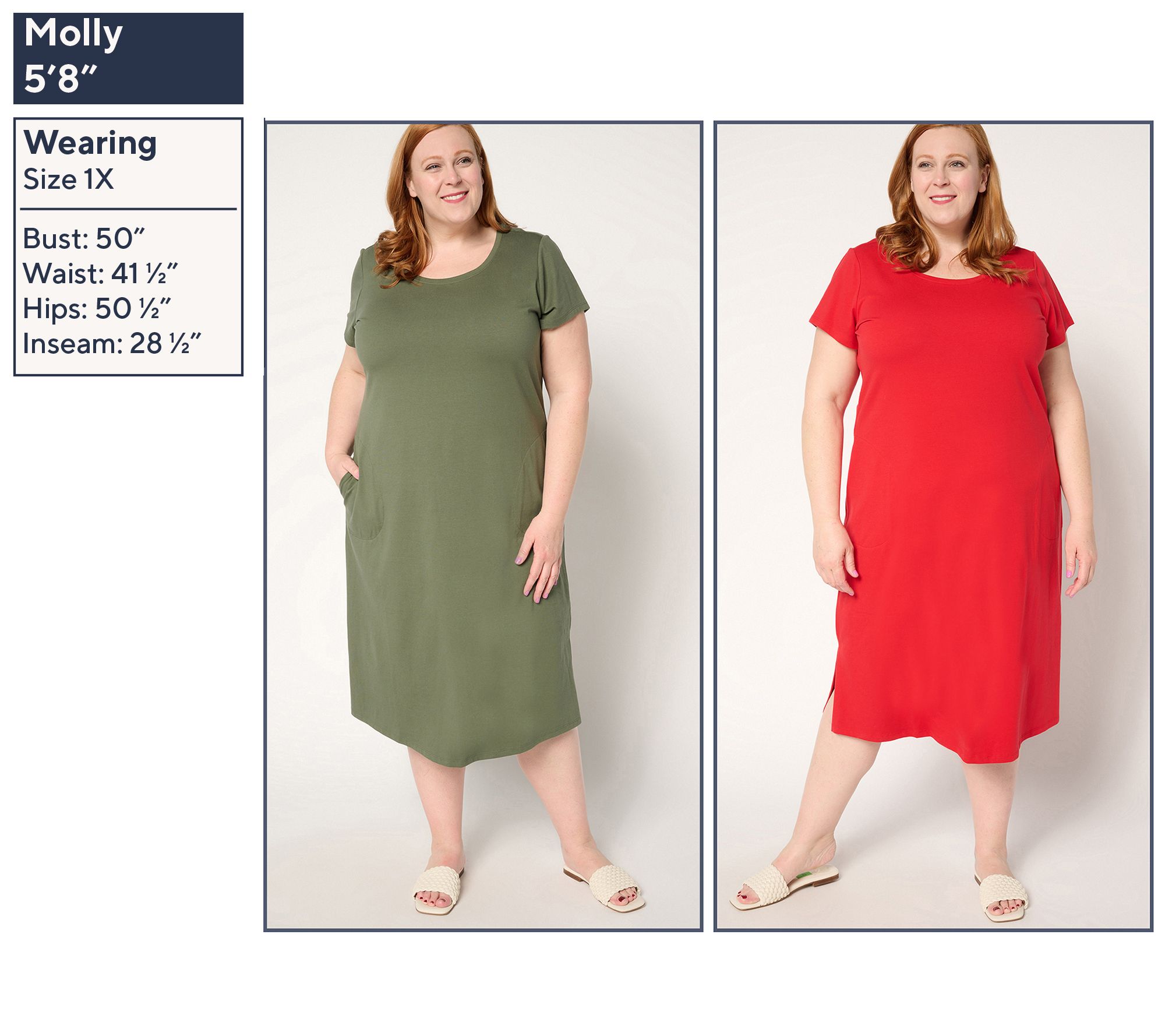 • Features: short-sleeve, scoop neck, midi length, side slits, on-seam pockets