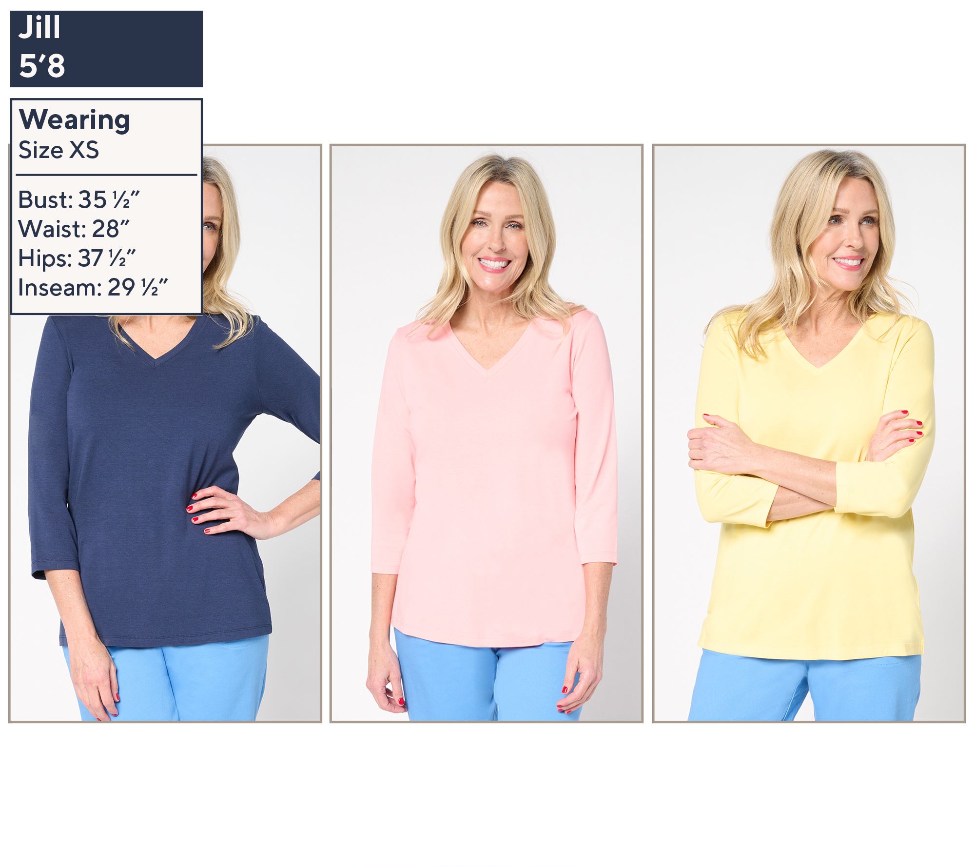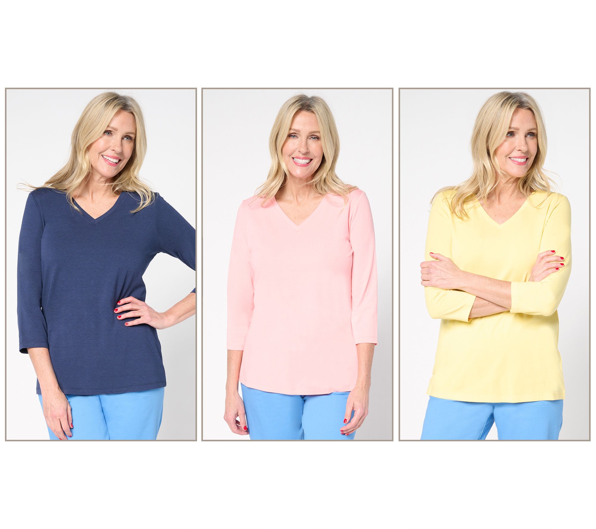 So, so, so soft! Embrace total comfort (and effortless style) with this three-pack of So Soft jersey tops. V-necklines provide a bit of a breather yet still feel classic and elegant with a necklace. Rotate the tops throughout your week and replace that need-to-do-wash anxiety with smooth, reliable style. From Denim & Co.® Fashions.