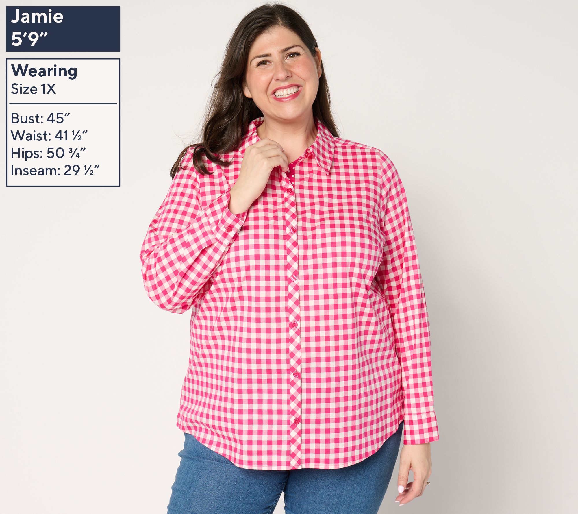 • Features: collar neckline, roll-tab sleeves, front placket, long sleeve with pleat into cuff, side slits, shirttail hem, gingham print with contrast polka dot print