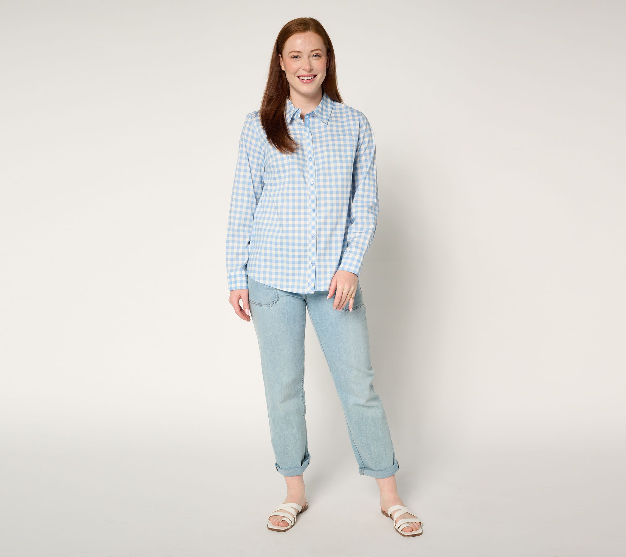Gingham style! This contrast-print top in crisp poplin keeps your vibe playful and polished, whether you're hosting a luncheon, visiting friends, or touring the countryside. From Denim & Co.® Fashions.