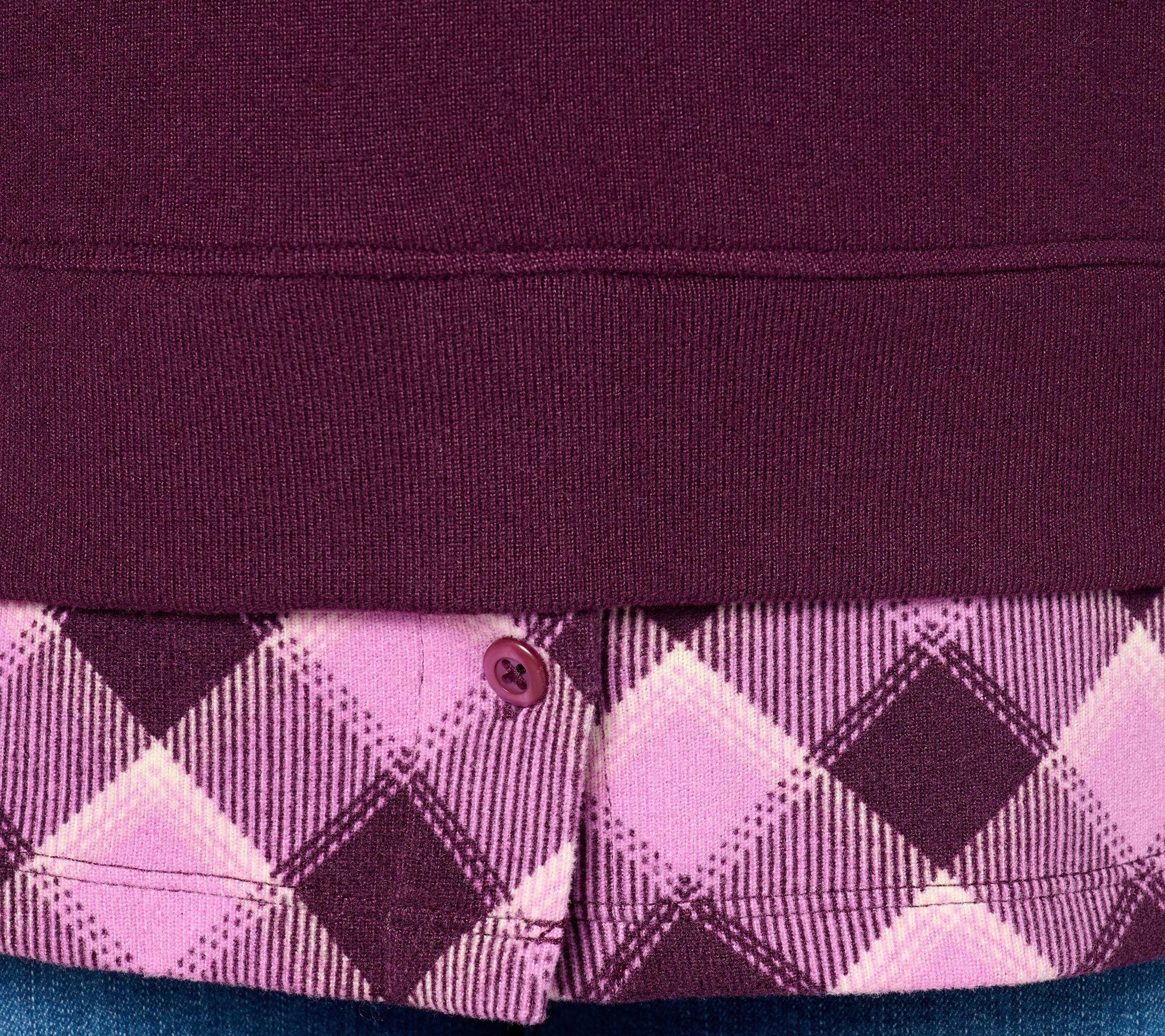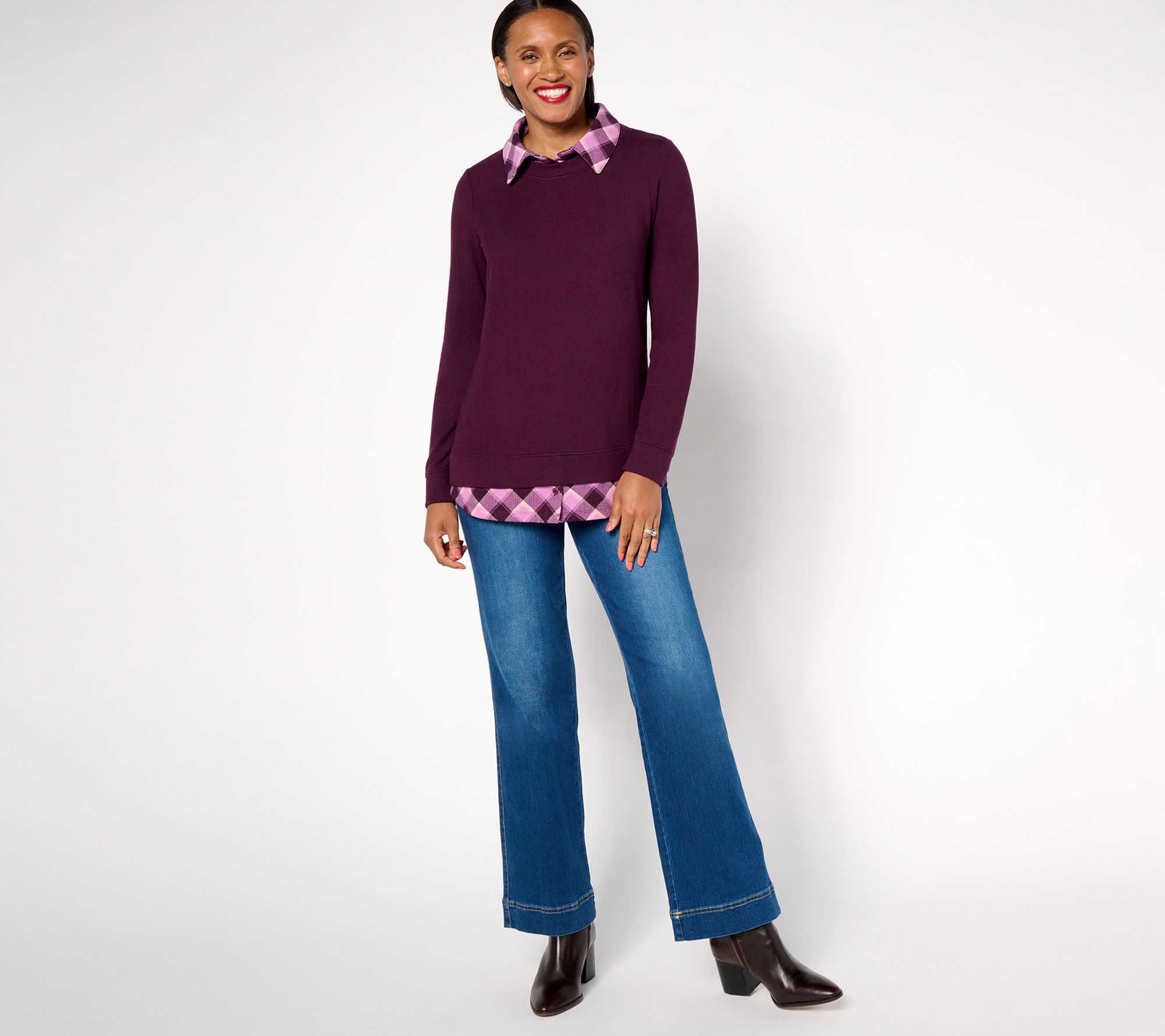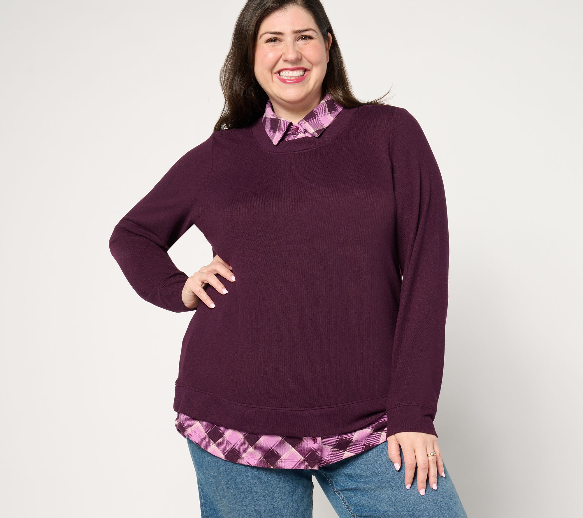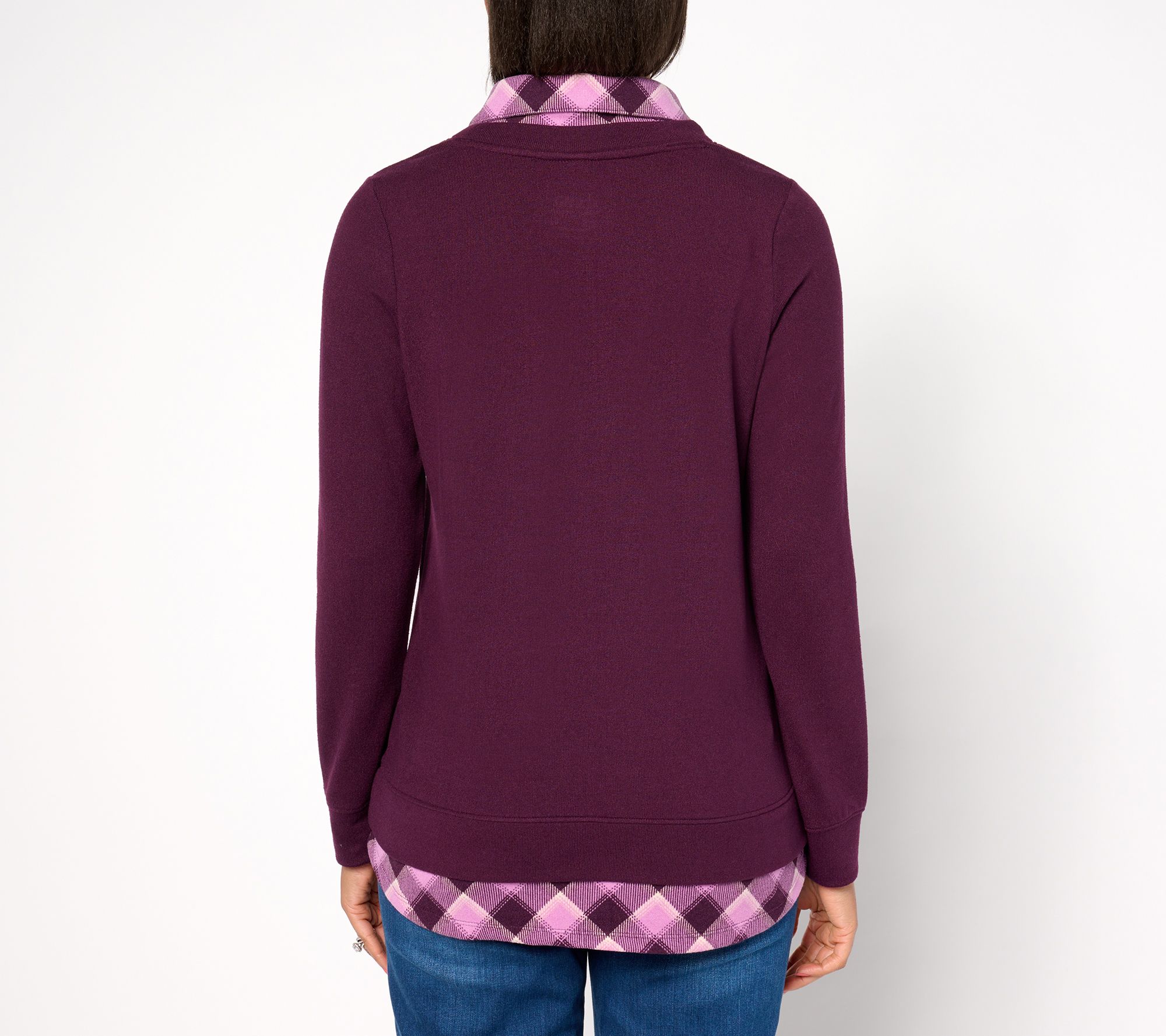 "As Is" Denim & Co. Heavenly Jersey Solid Plaid Long Sleeve 2fer Top