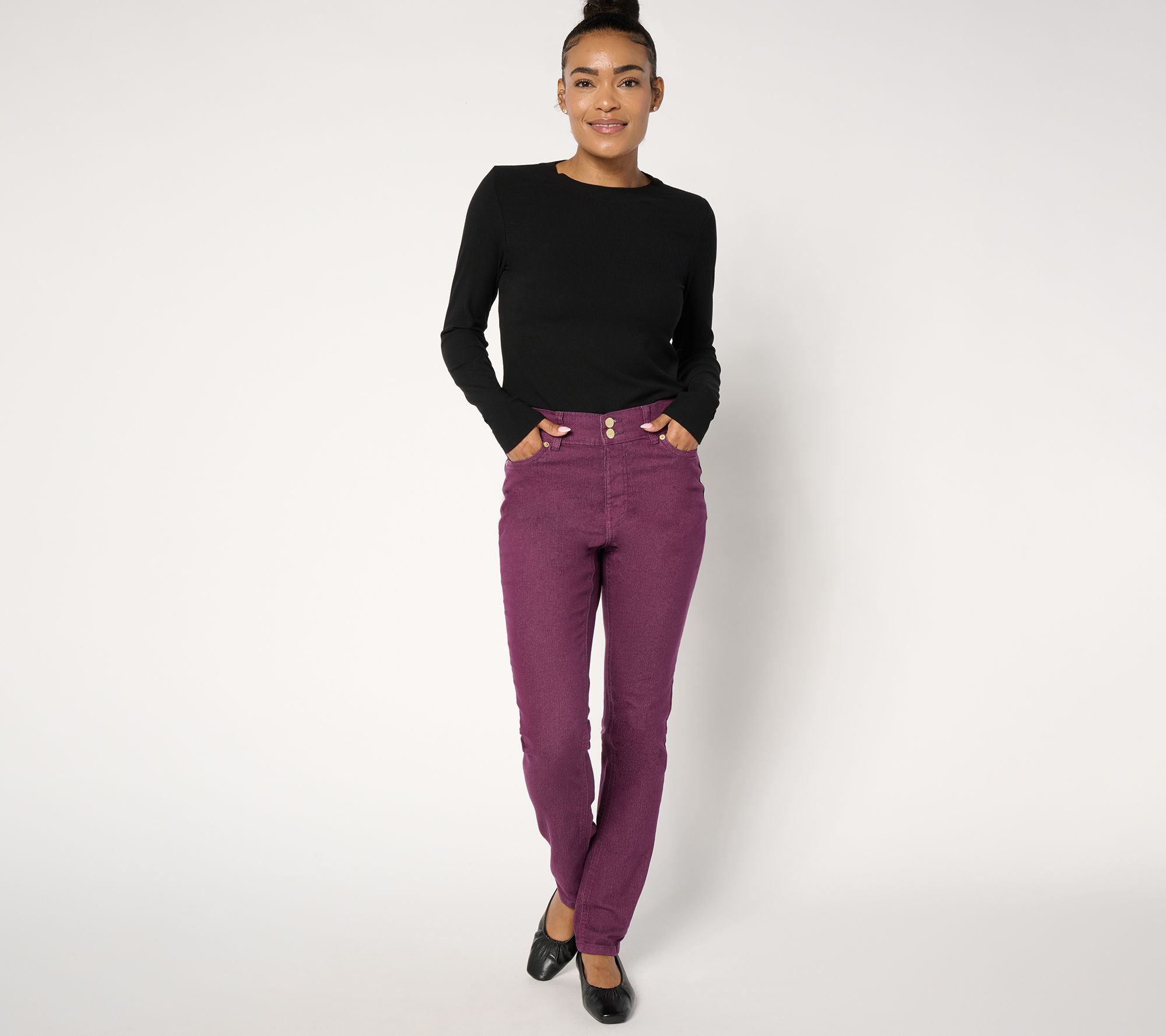 Take a zipperless approach to classic denim in these heritage-inspired jeans. Their slim straight-leg silhouette looks like a million with a button-front shirt, a slouchy sweater, or a sleek tee. From Denim & Co.® Fashions.