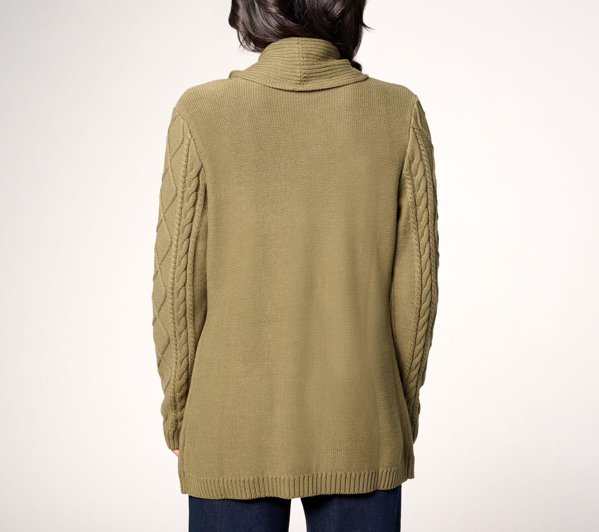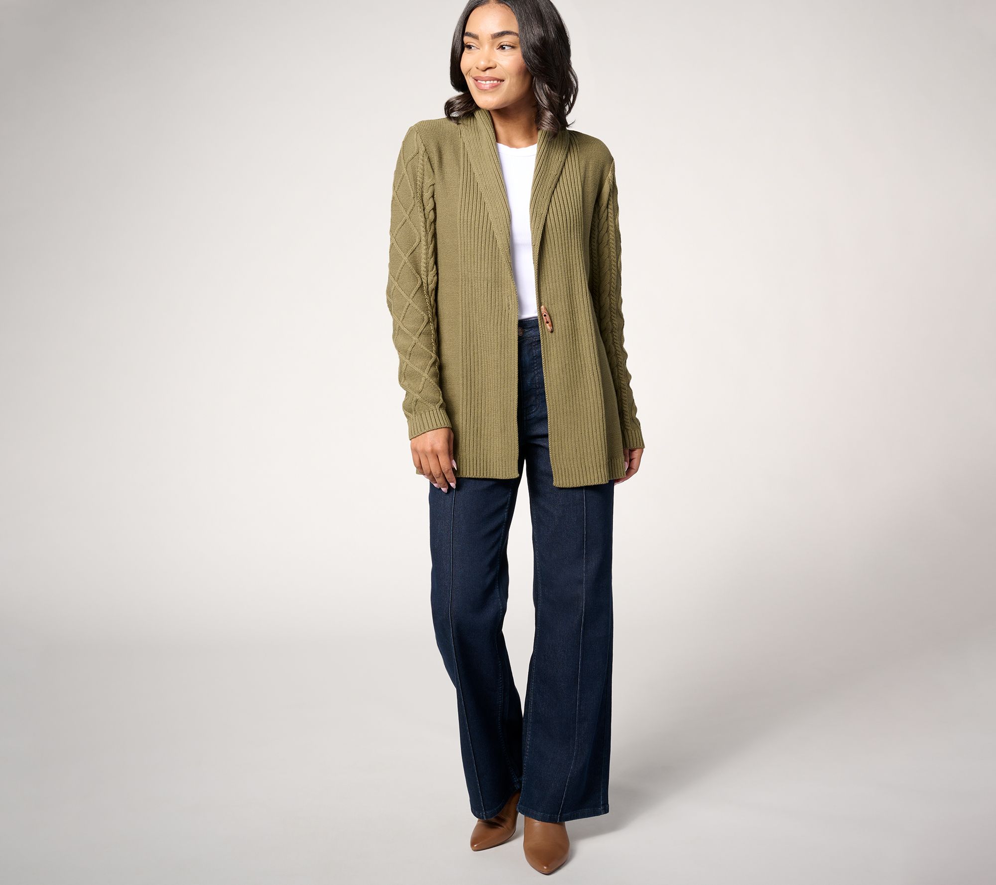 Instant classic. The rich look of this toggle-closure cardigan comes courtesy of a mix of heritage-inspired textures and a substantial shawl collar. From Denim & Co.® Fashions.