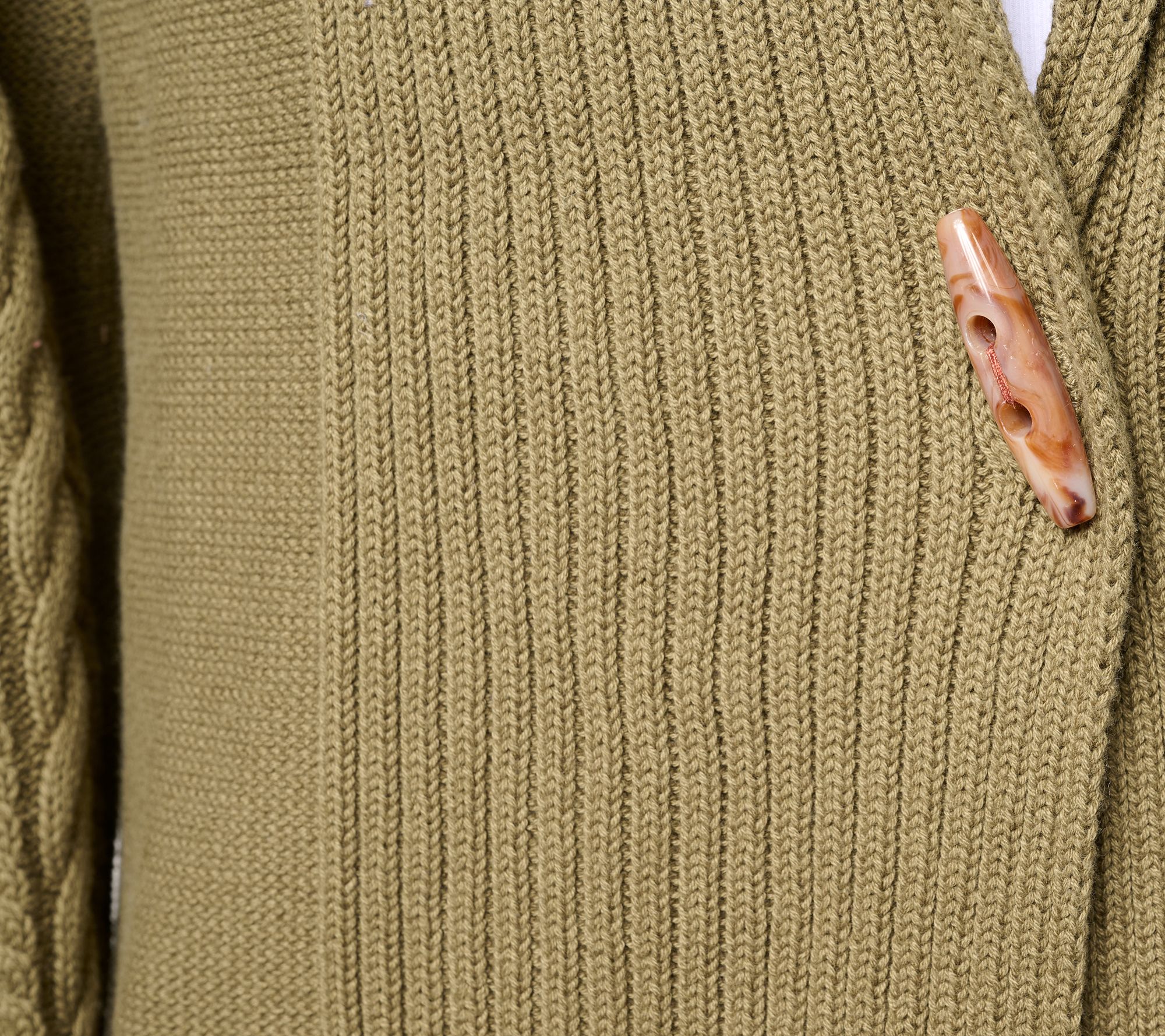 • Features: single toggle closure, vertical shawl collar rib trim, ribbing on cuff/hem, pointelle-stitched long sleeves, fully fashioned armhole seams, reverse jersey-knit body