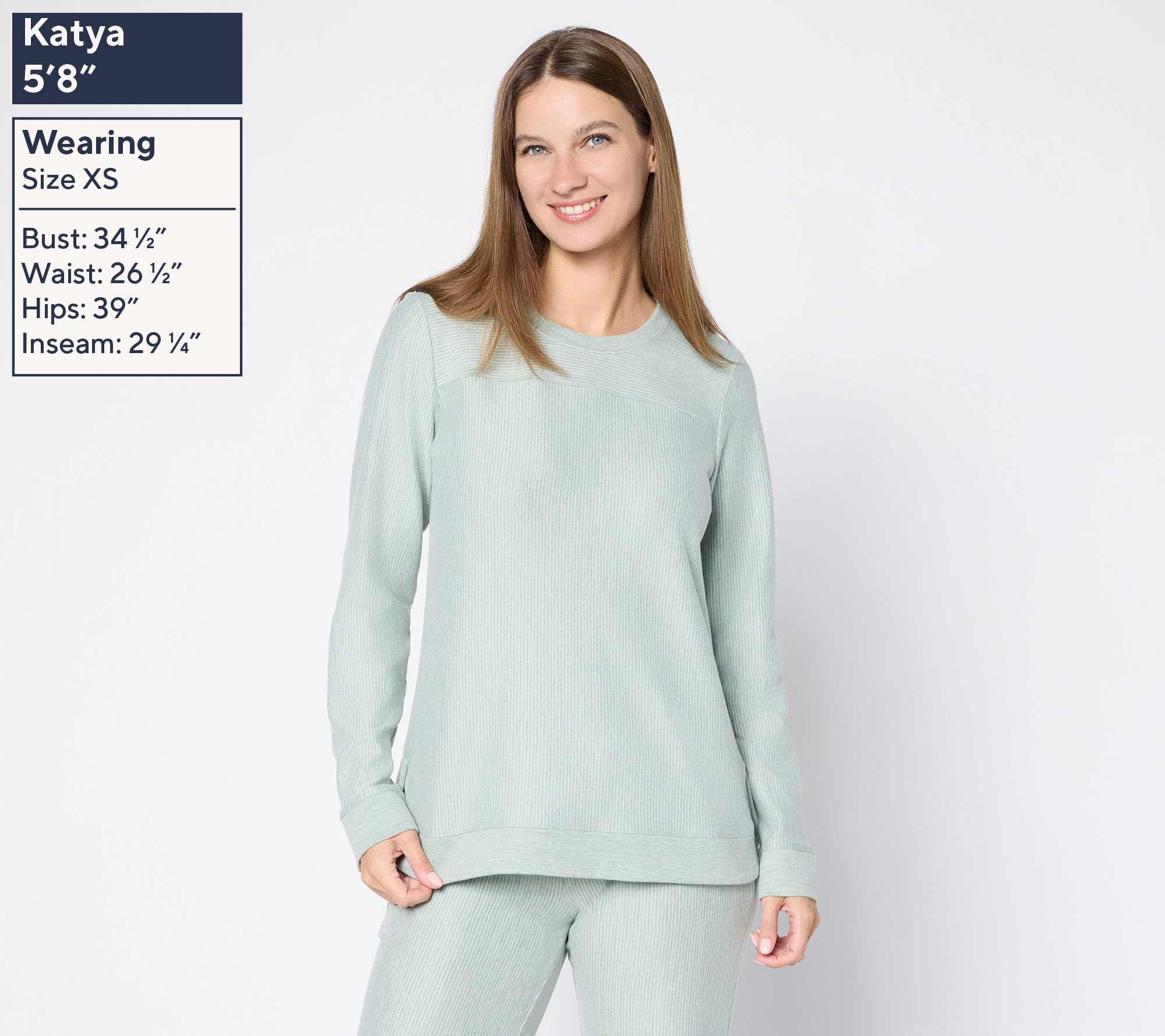 Easy mornings and cozy evenings both call for the effortless style of this interlock knit long-sleeve top. With a round neckline, curved hem, and softness in every stitch, it's designed for laid-back moments at home or casual outings around town. From Denim & Co.® Fashions.
