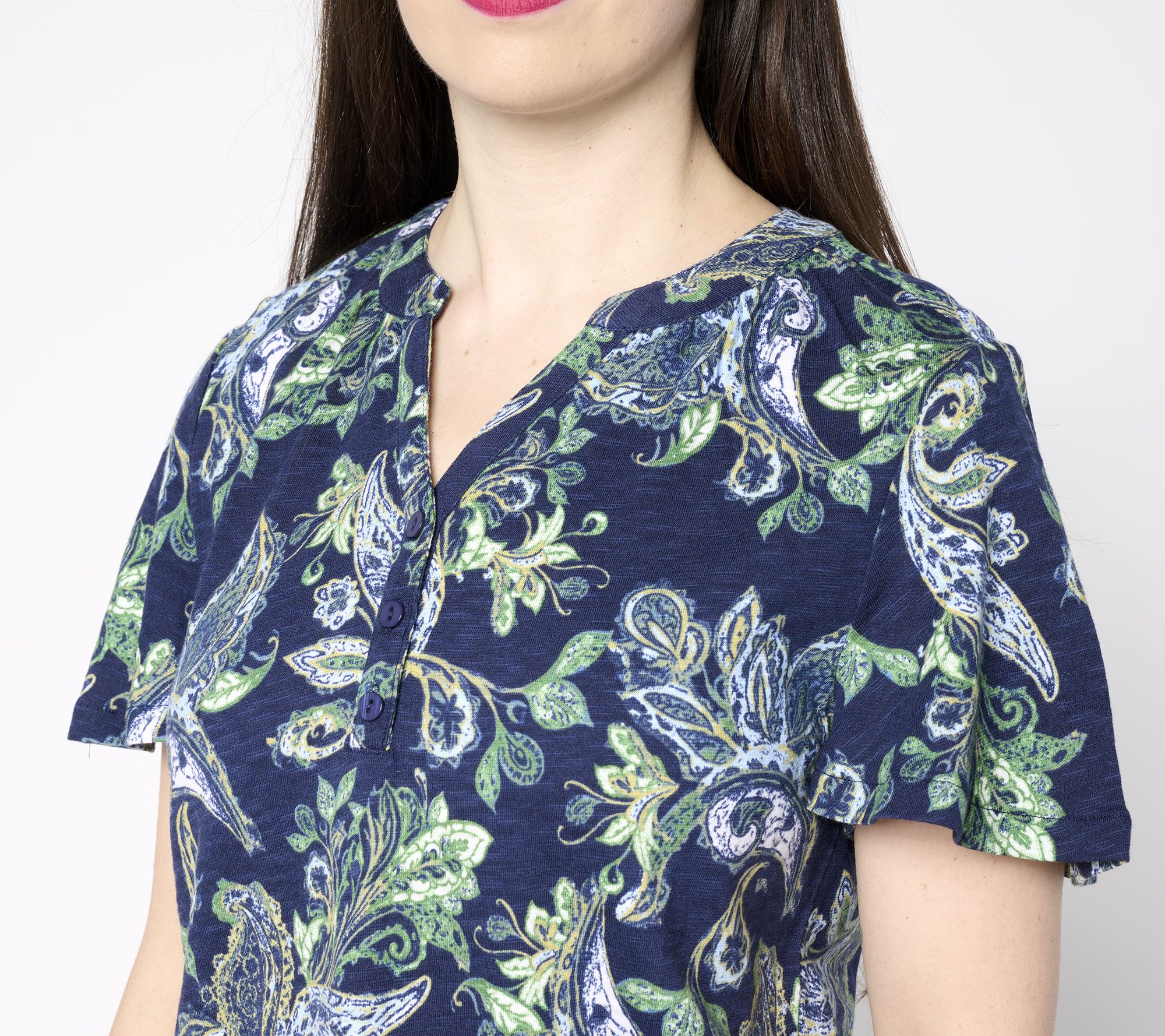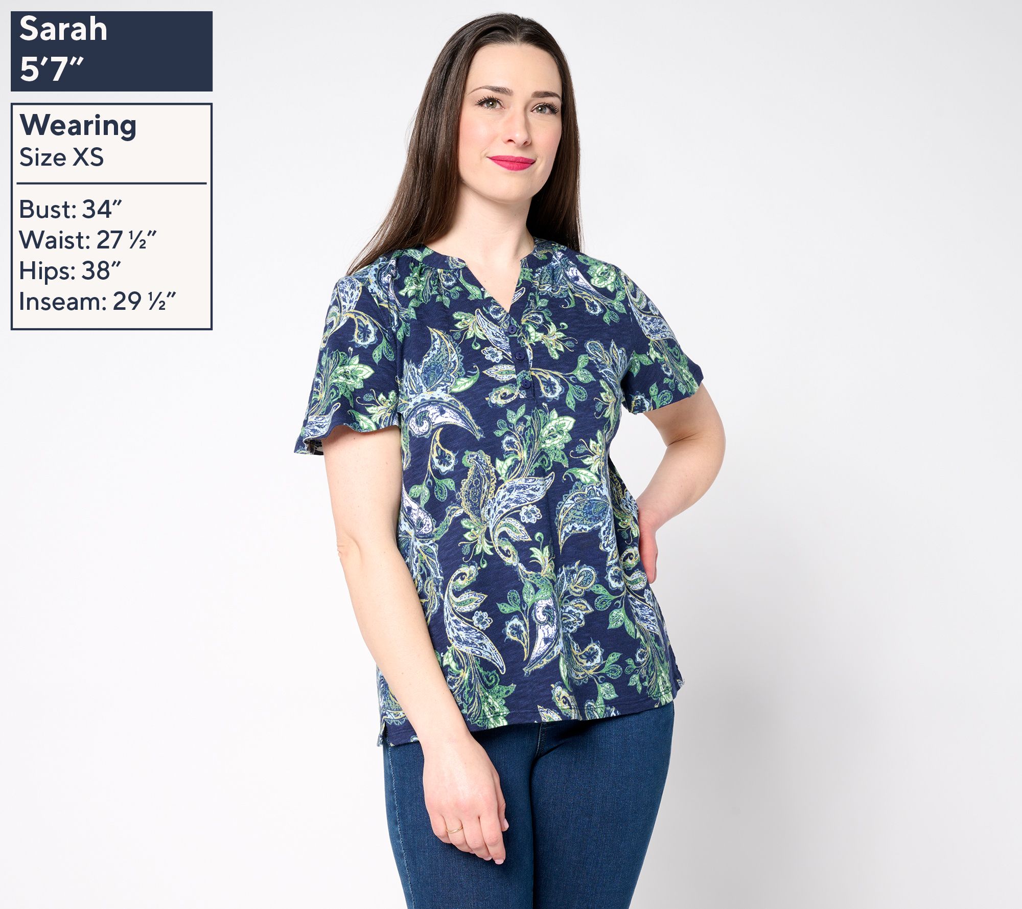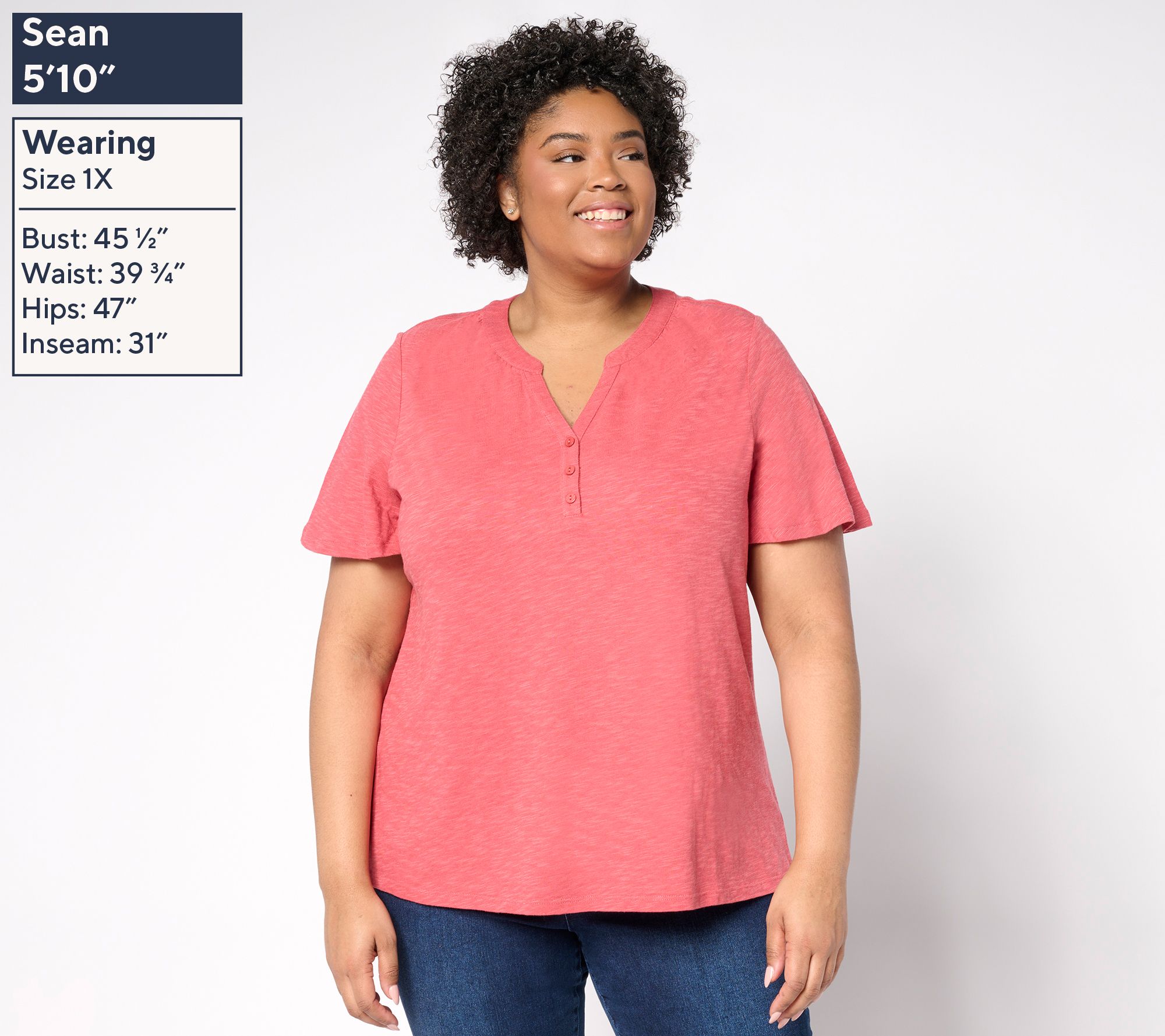 Whether it's a casual day out or a weekend brunch, this linen blend top is your go-to. The flutter sleeves add a stylish touch, while the y-neck placket with functional buttons and shirring at the neck band lend an elegant finish. From Denim & Co.
