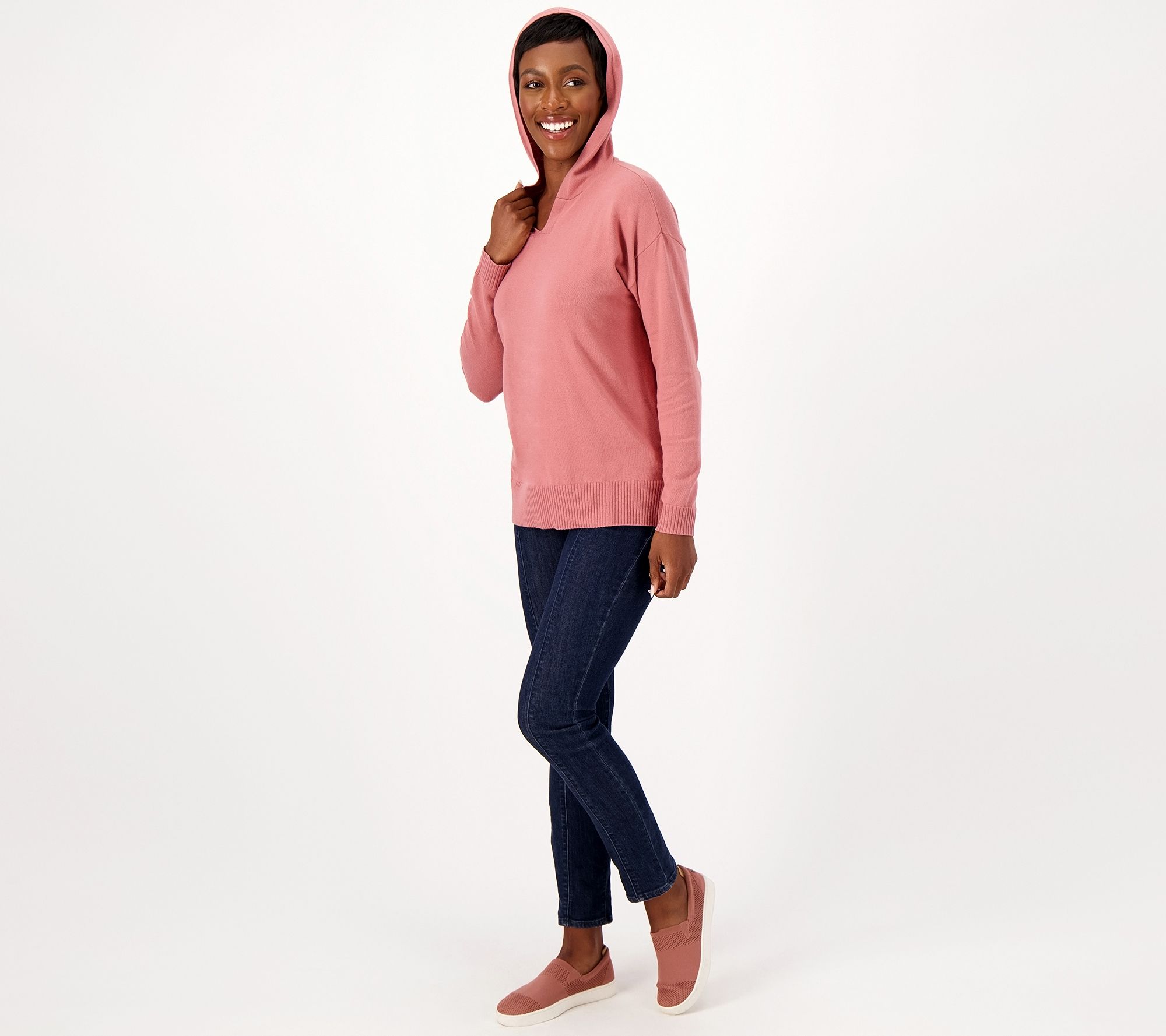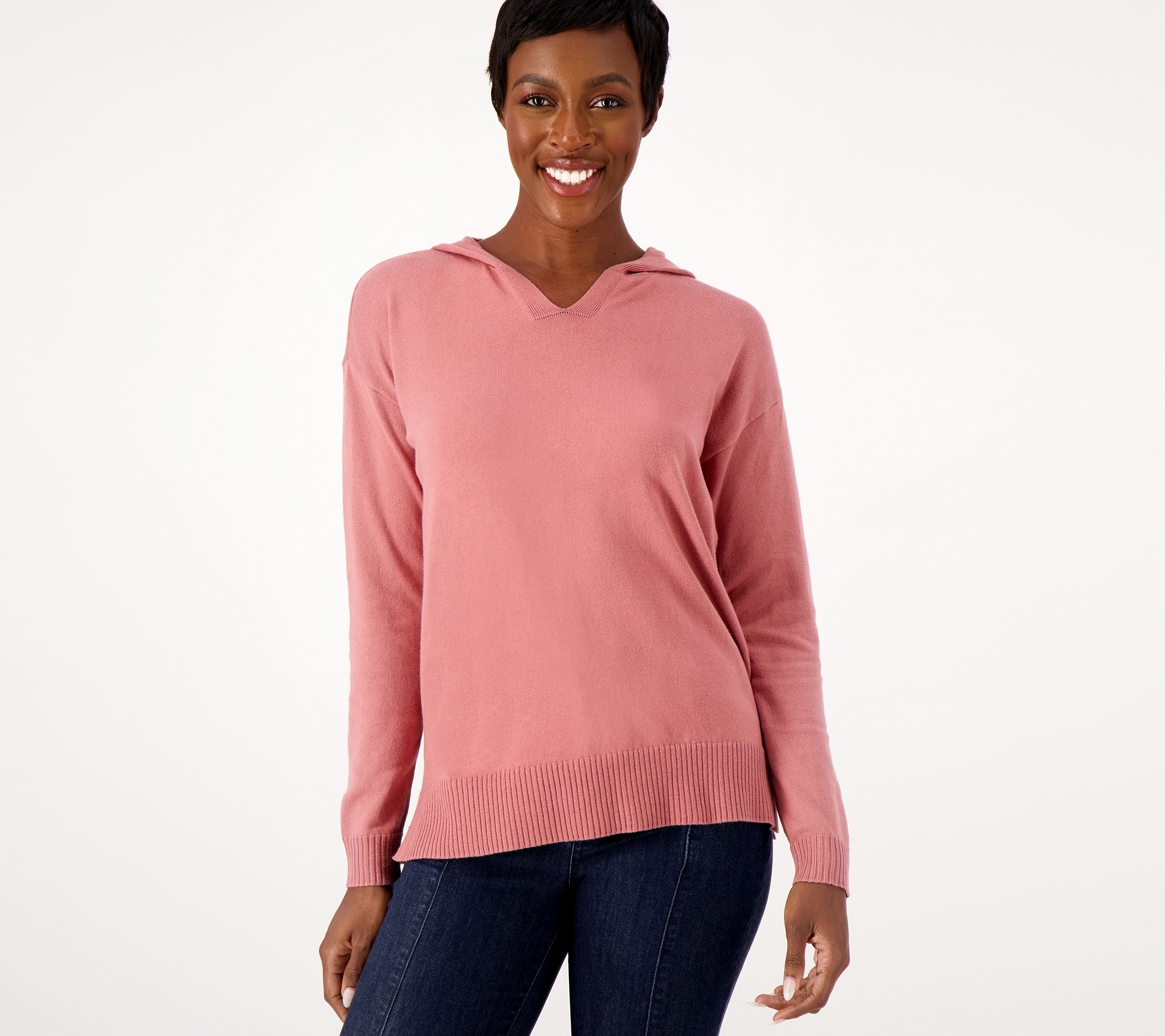 Meet your go-to top. A cozy hood and sweet details at the hem and sleeves make this a sure-fire favorite. From Denim & Co.