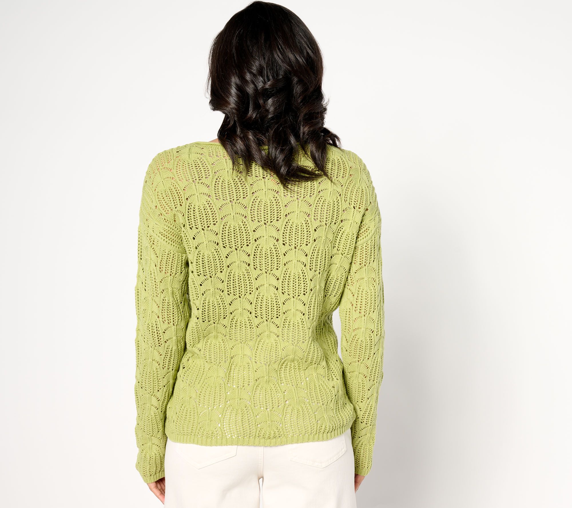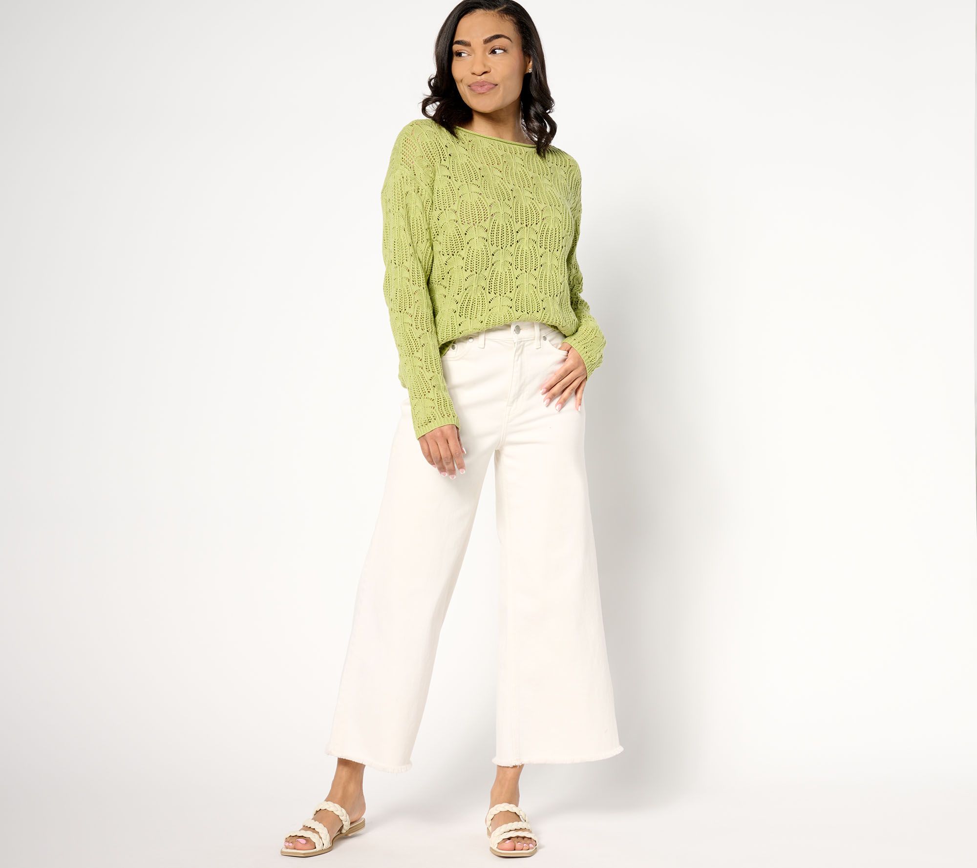 Refresh your spring/summer wardrobe with this boat neck sweater. The open work pattern looks lovely when layered over a cami and teamed with a pair of capri jeans and platform sandals. From Denim & Co.® Fashions.