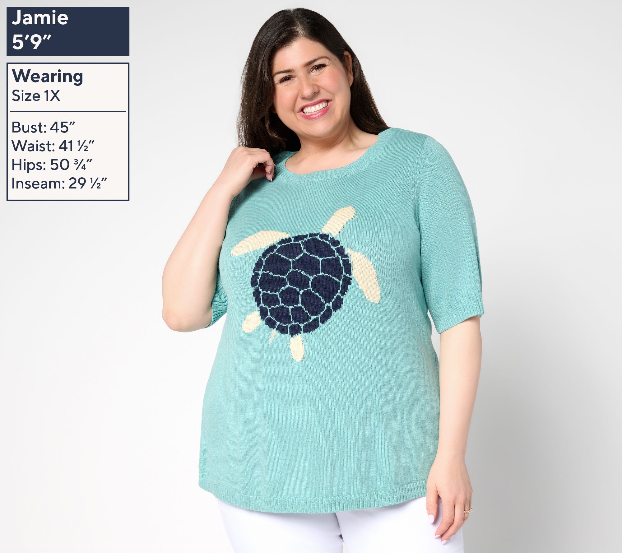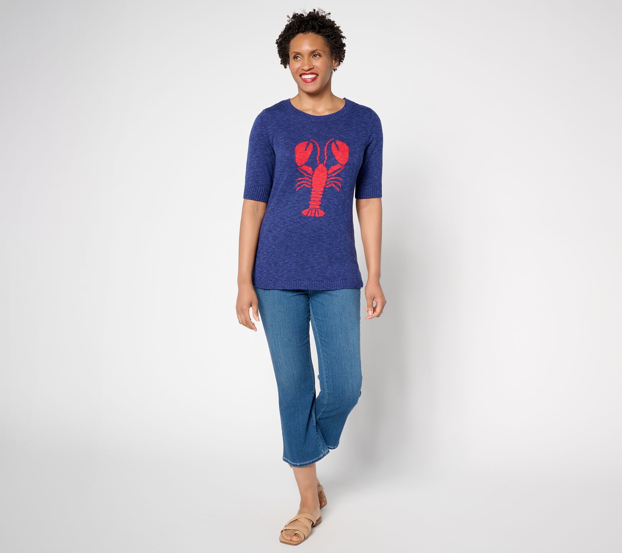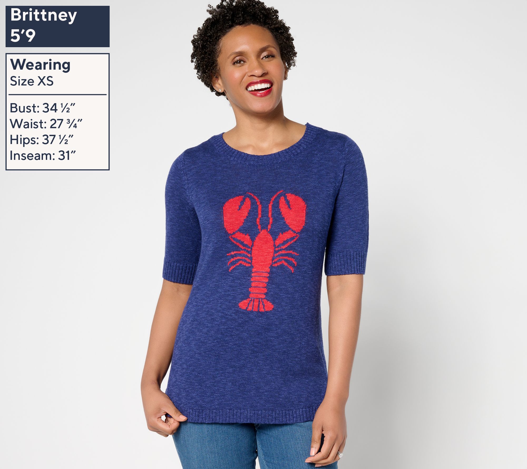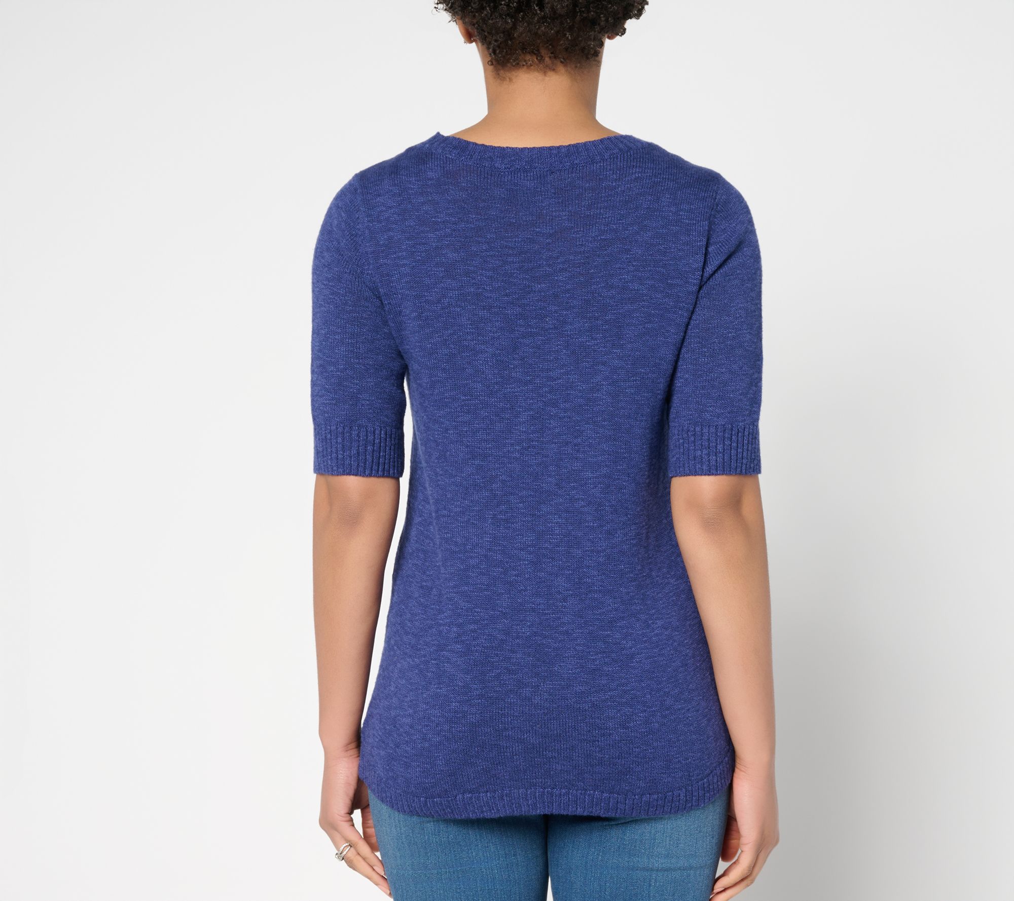 You may have a hard shell in certain situations -- but other times you're a total softie! This playful short-sleeved sweater captures both sides, in an easygoing design made for casual days by the shore or breezy dinners on the patio. From Denim & Co.® Fashions.