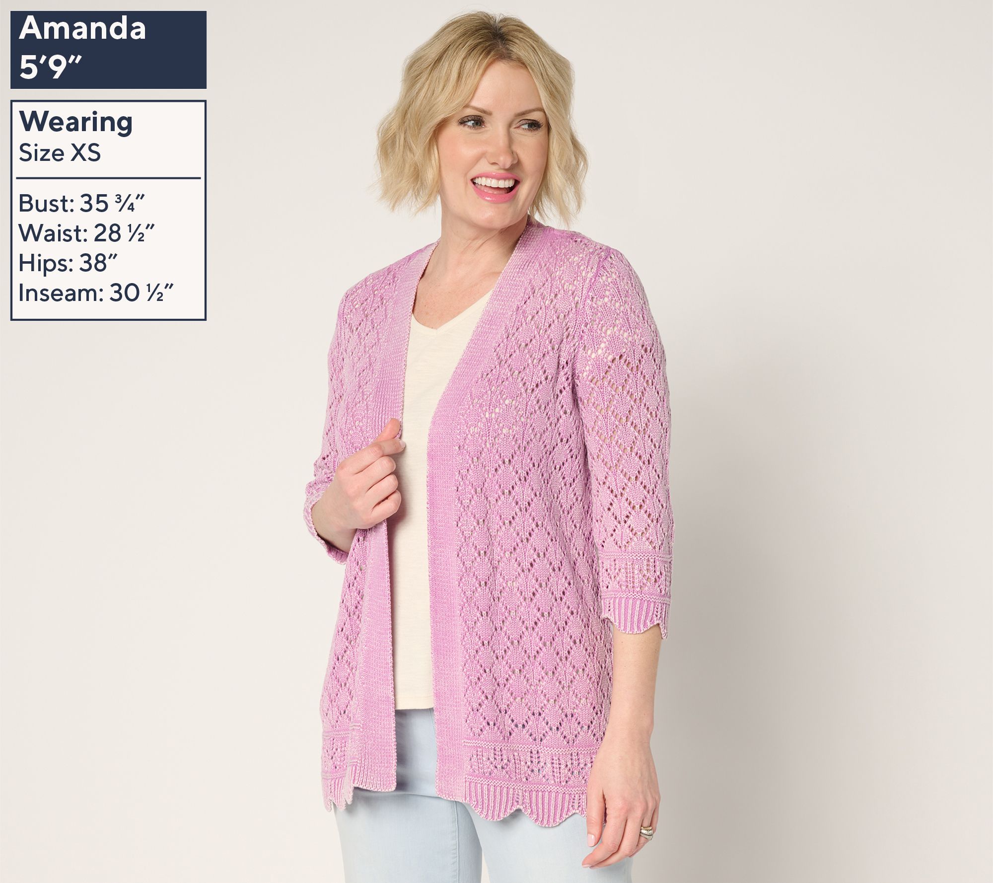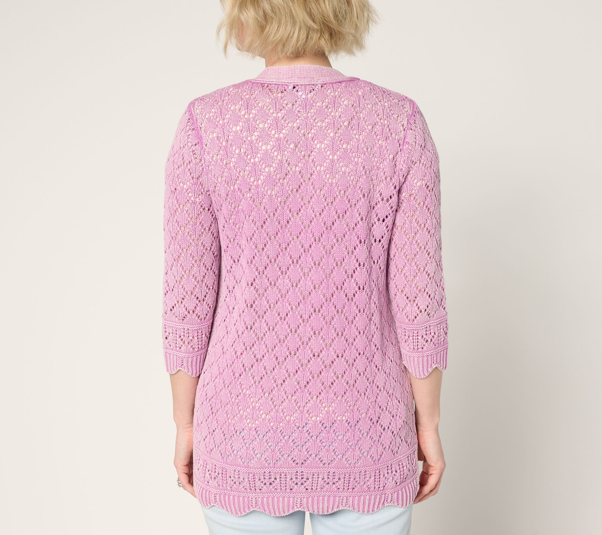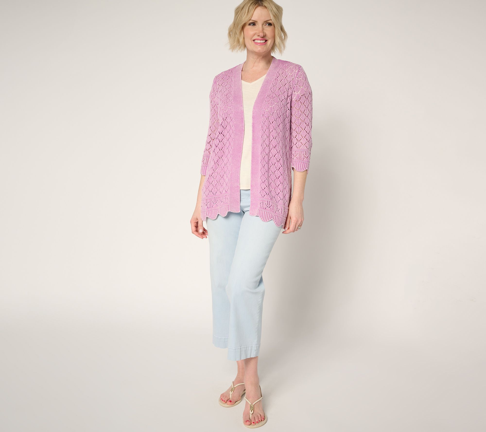 Looking for a lightweight layer to brighten up your look? This washed pointelle cotton cardigan delivers all-day comfort with openwork details, subtle scalloped edges, and an open-front silhouette. Stylish enough for brunch out, relaxed enough for everyday errands -- just pop it over a tank or tee and bring a little extra texture to the moment. From Denim & Co.® Fashions.