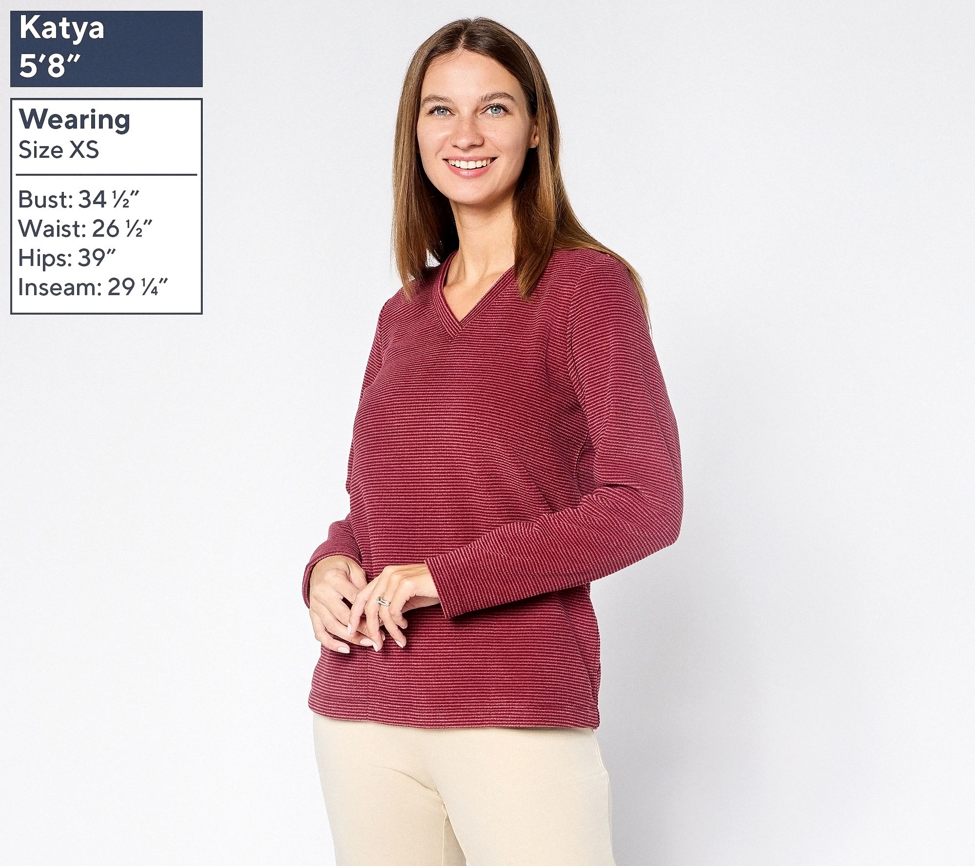 • Features: crossover V-neckline, long sleeves, on-seam pockets with stitched pocket bags, straight bottom hem