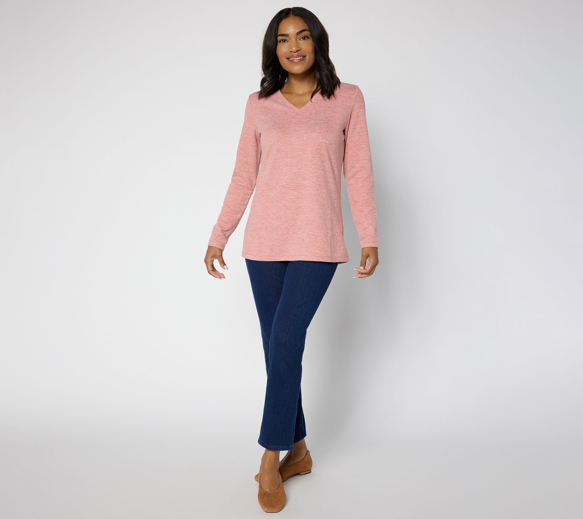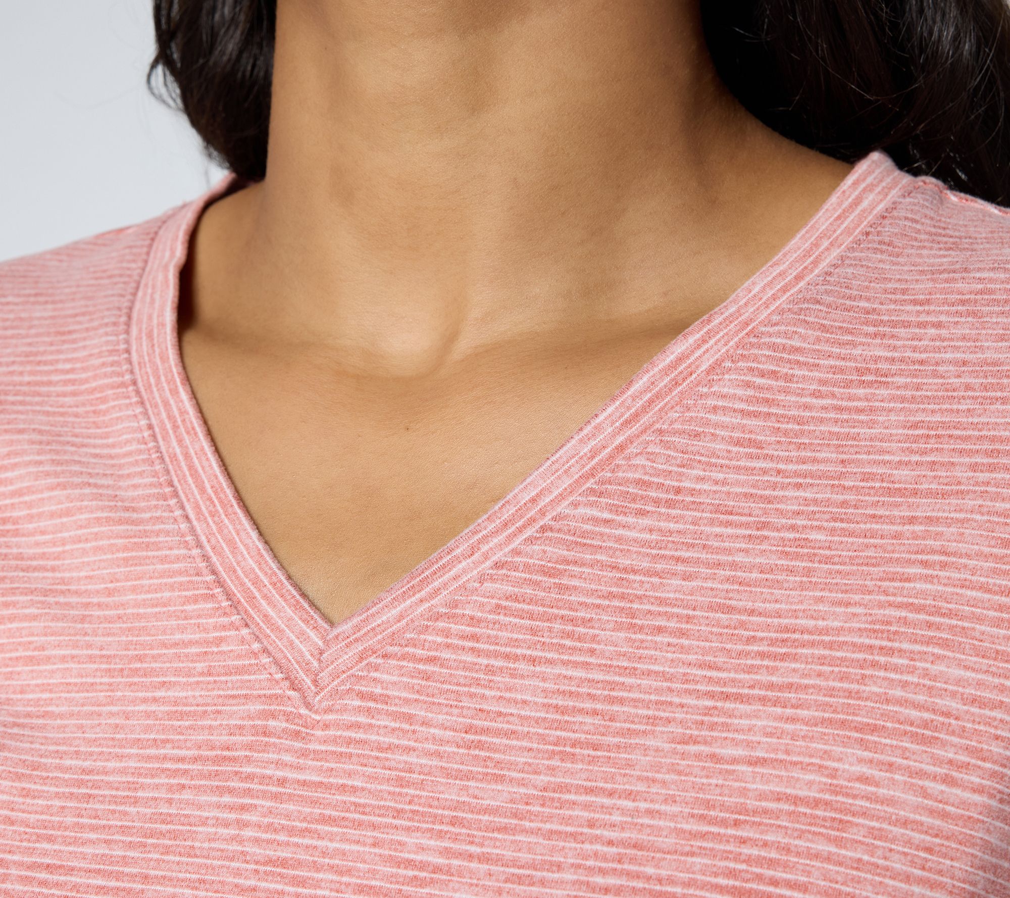 • Features: V-neckline, long sleeves, curved bottom hem, subtle stripe pattern