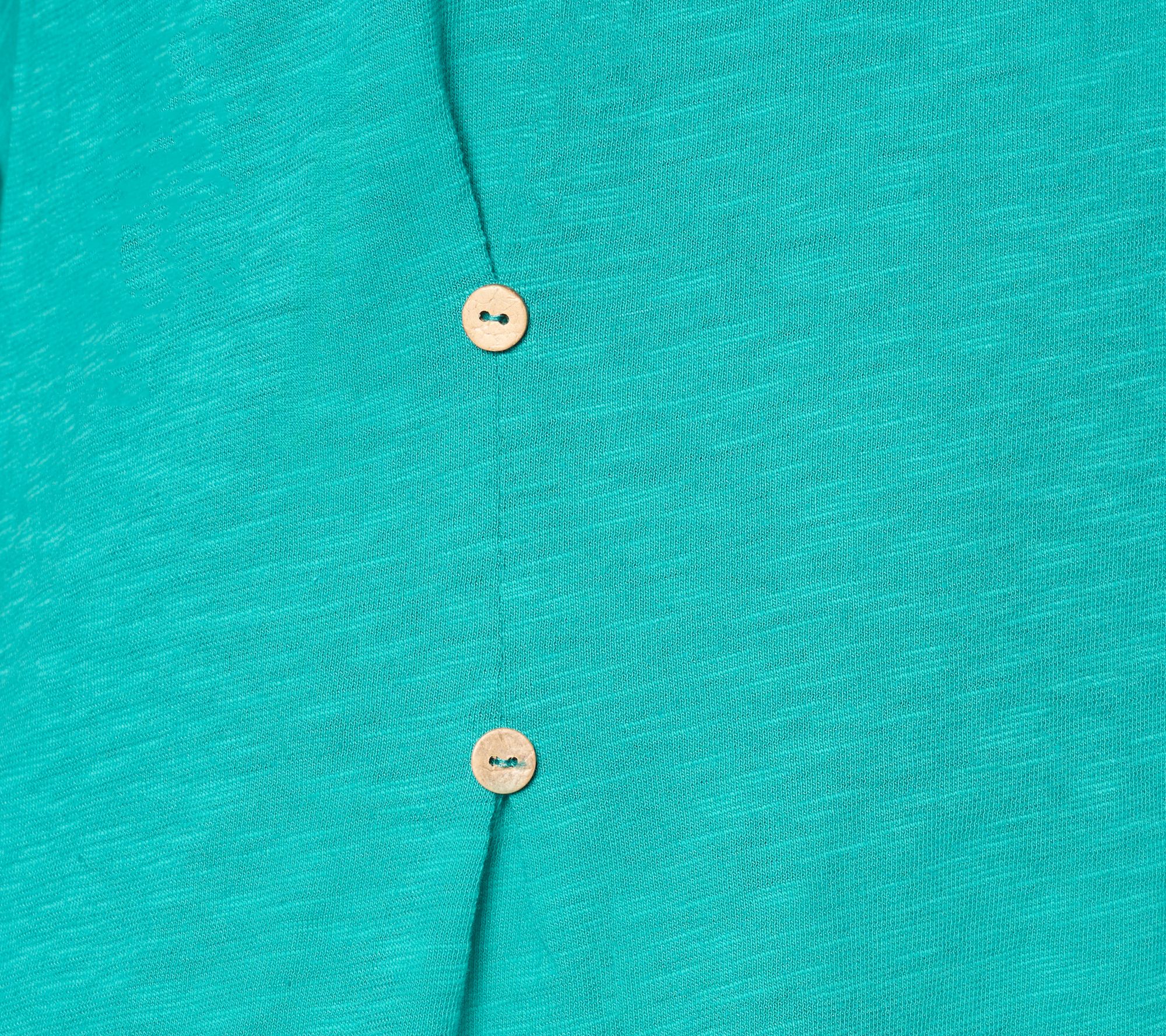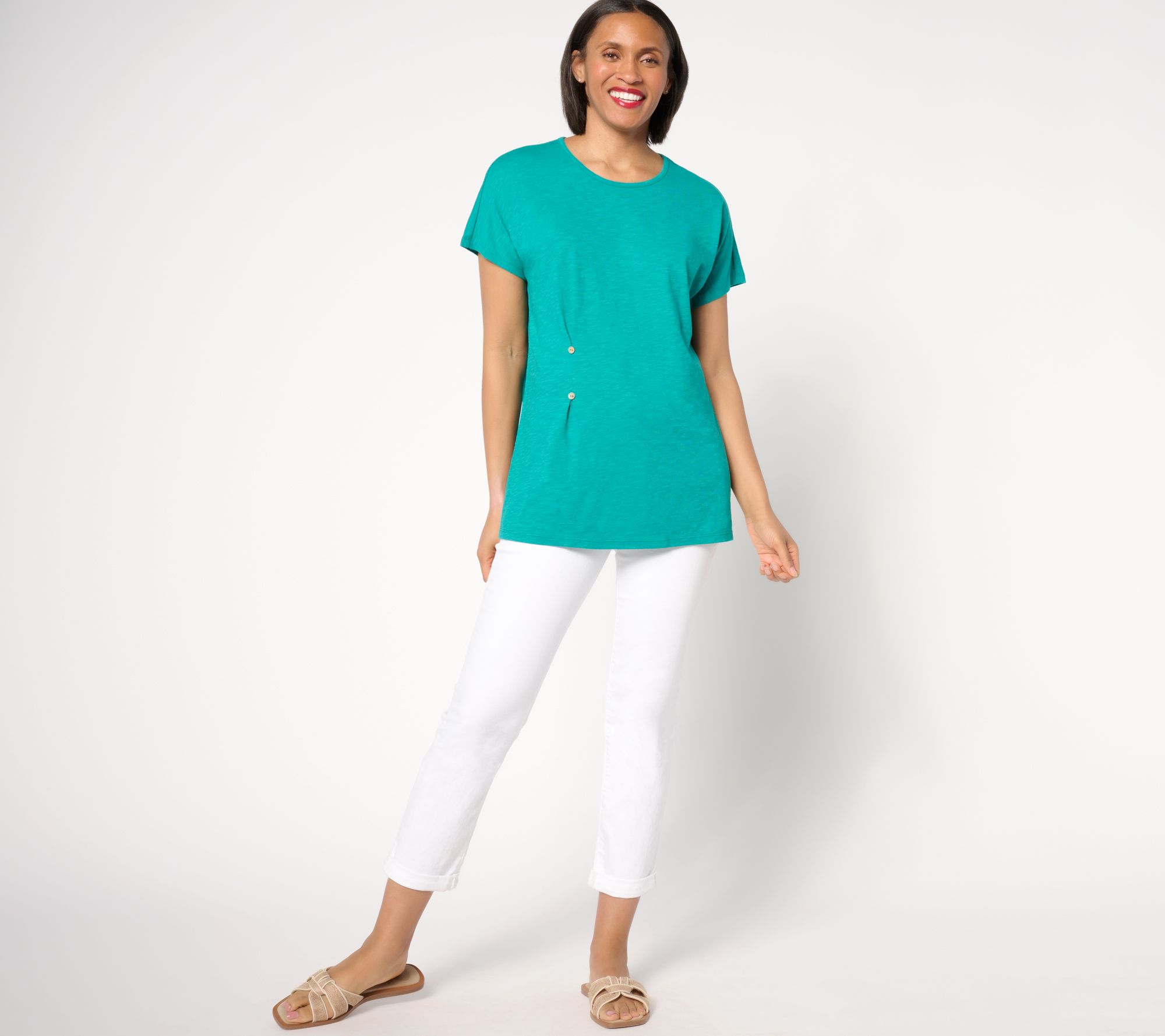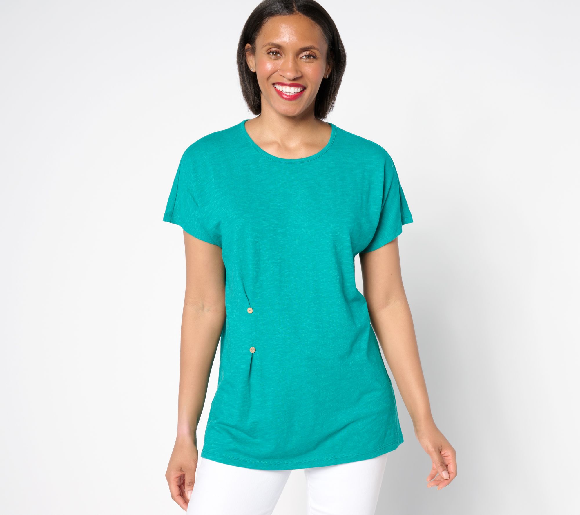 • Features: round neckline, dolman short sleeves, non-functional button pleat on wearer's right side, straight bottom hem