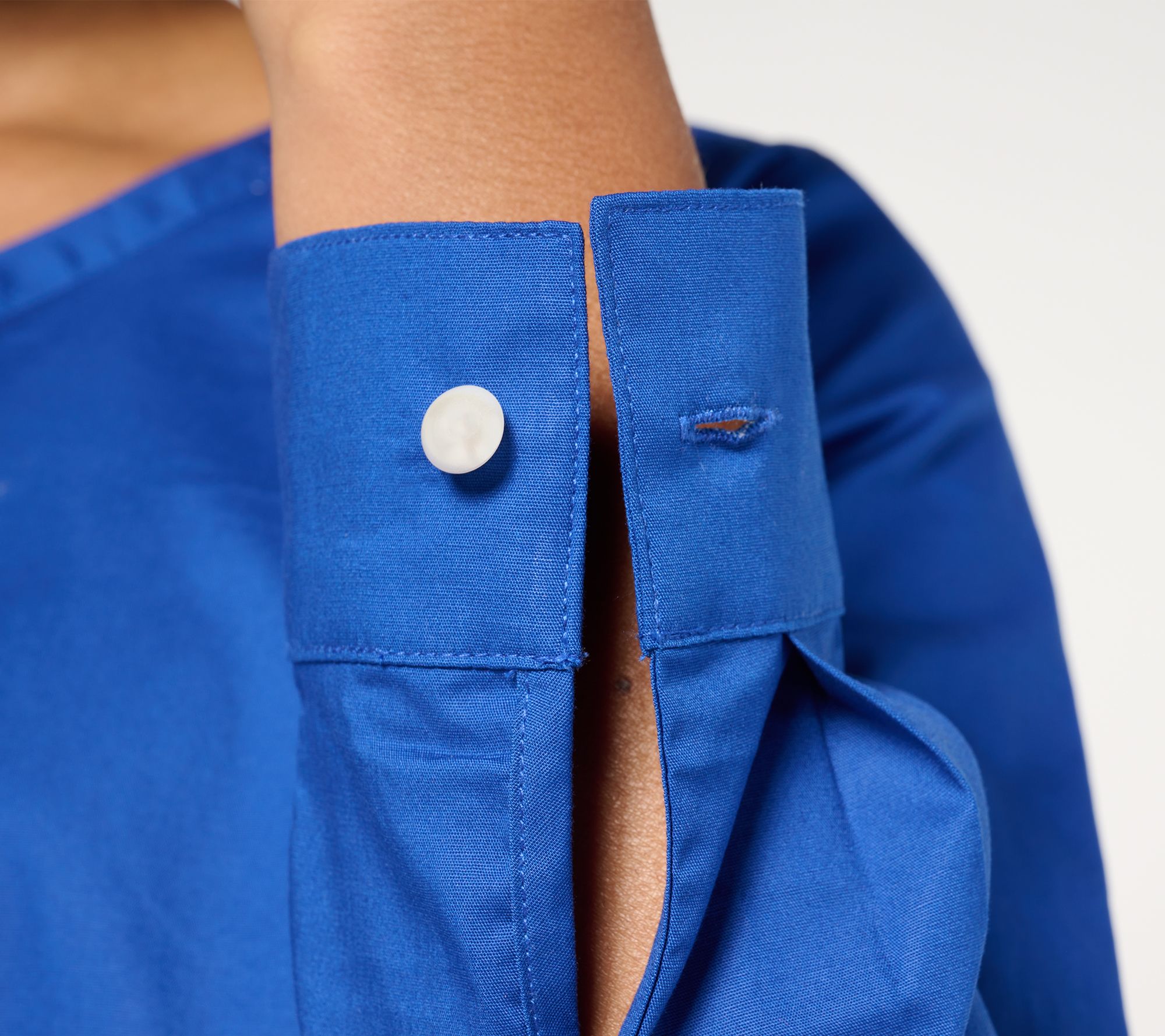 • Features: half button-front closure with simulated pearl buttons, forward shoulder seams, curved bottom hem, side slits, vented button sleeves