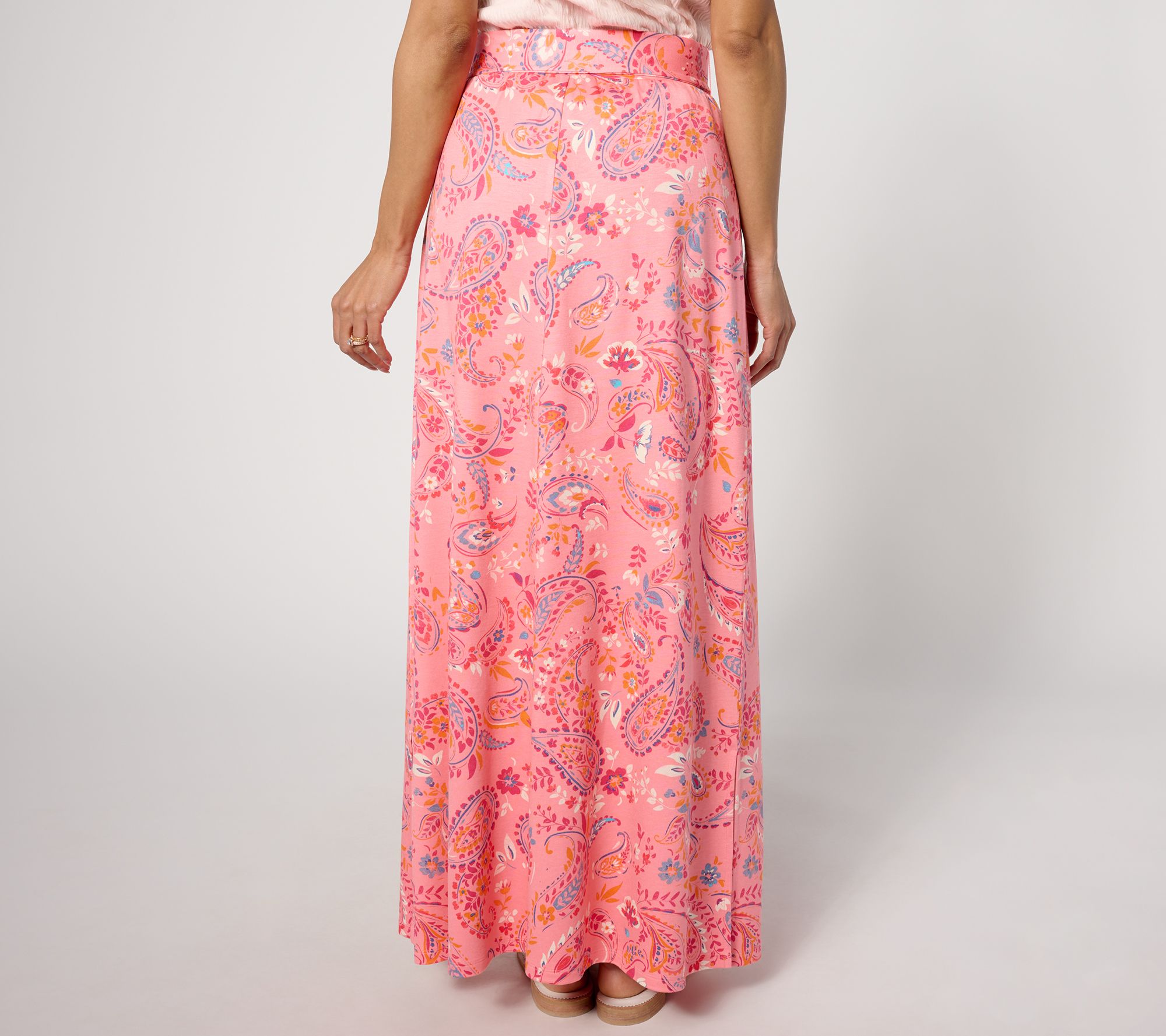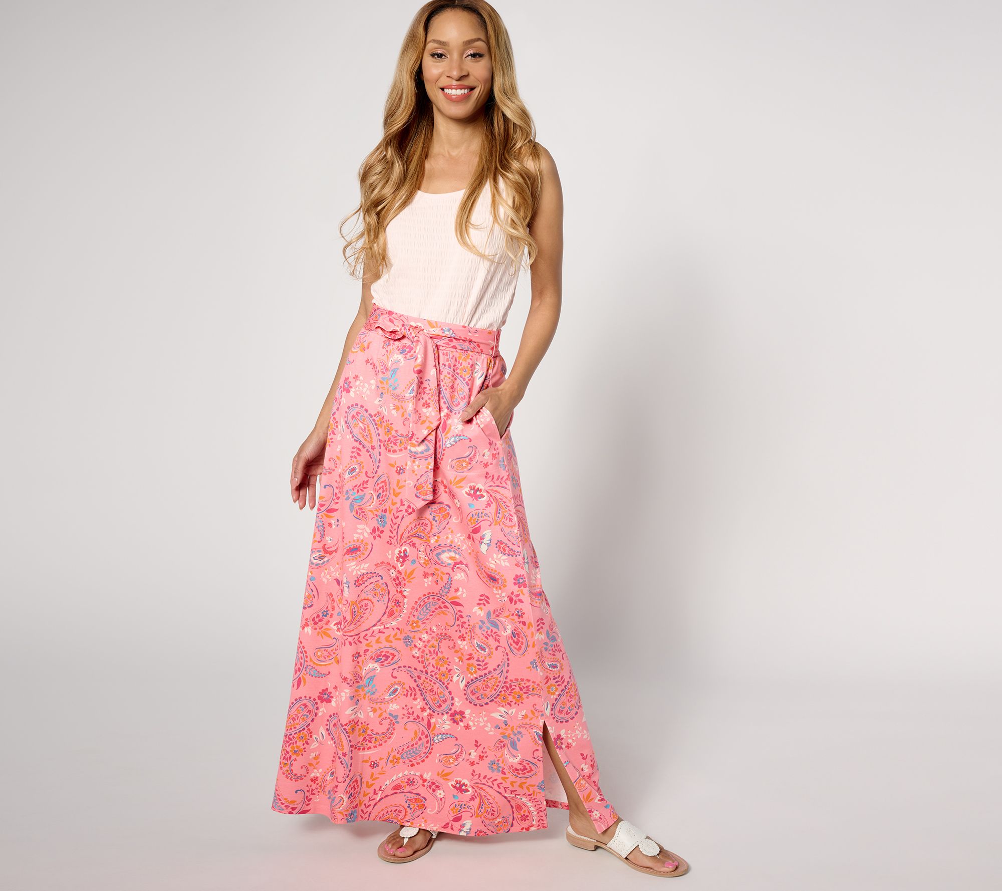 Hello, statement skirt! This printed maxi in sturdy double-knit jersey is primed for elegant brunches, Mother's Day, and family portrait sessions. Tie the belt to taste. From Denim & Co.® Fashions.
