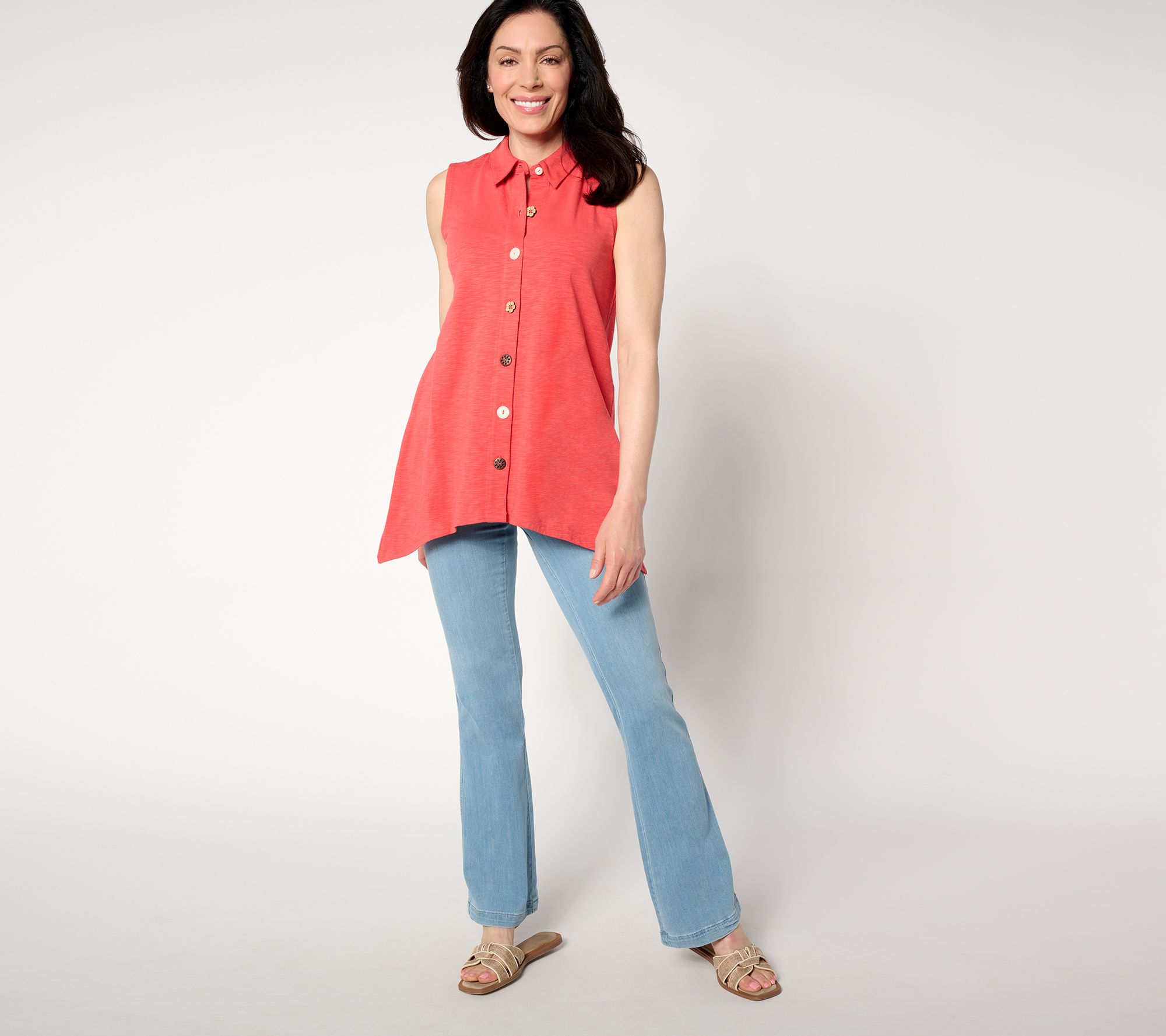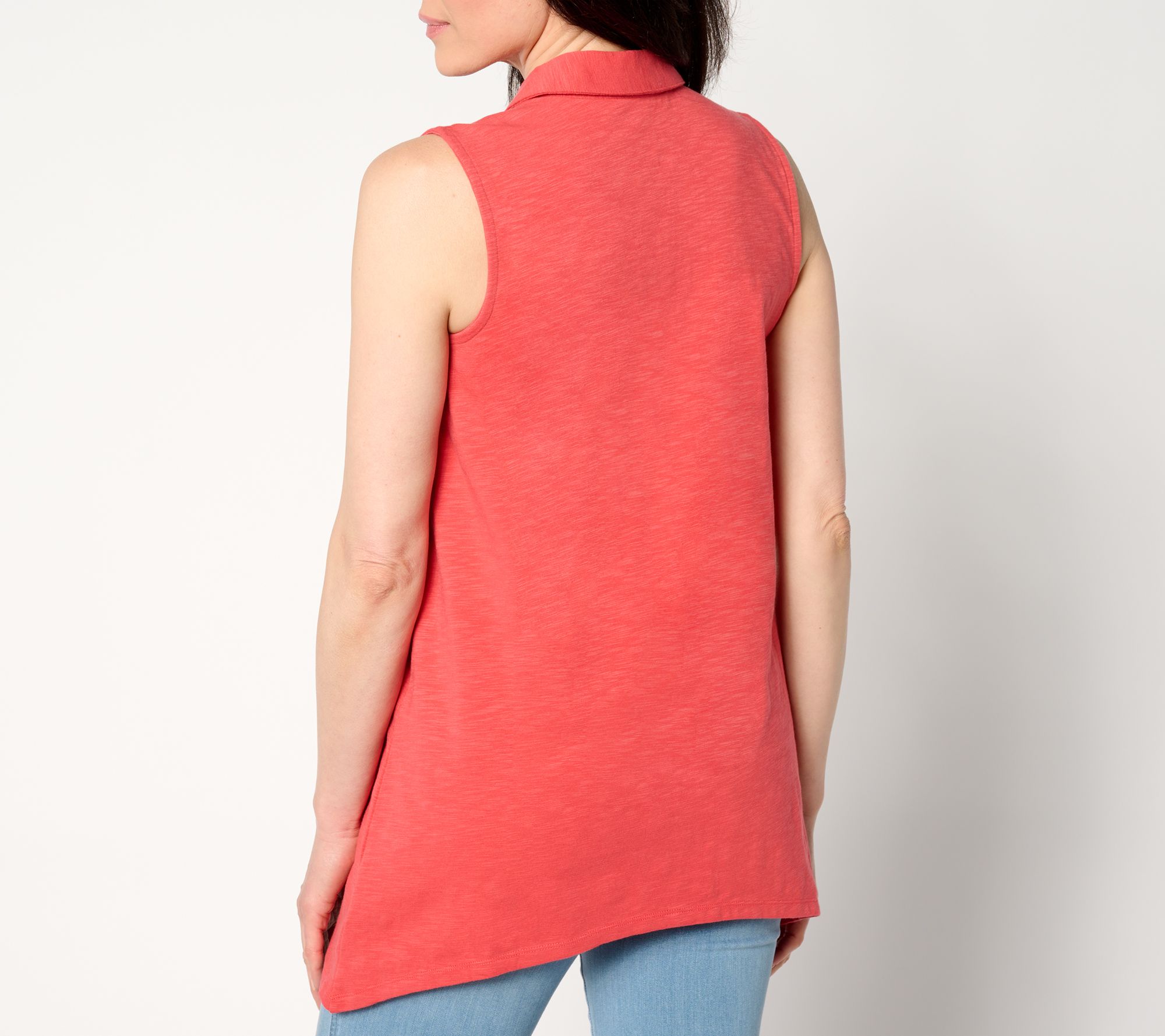 A faultless, pulled-together piece for your go-go-go days, this sleeveless sharkbite hem top works beautifully with most any bottoms -- especially when you're not feeling cropped or tucked styles. And those charming novelty buttons? Obsessed! From Denim & Co.® Fashions.