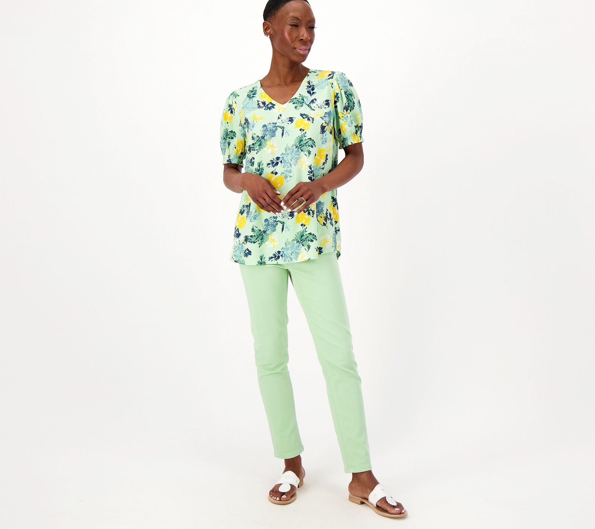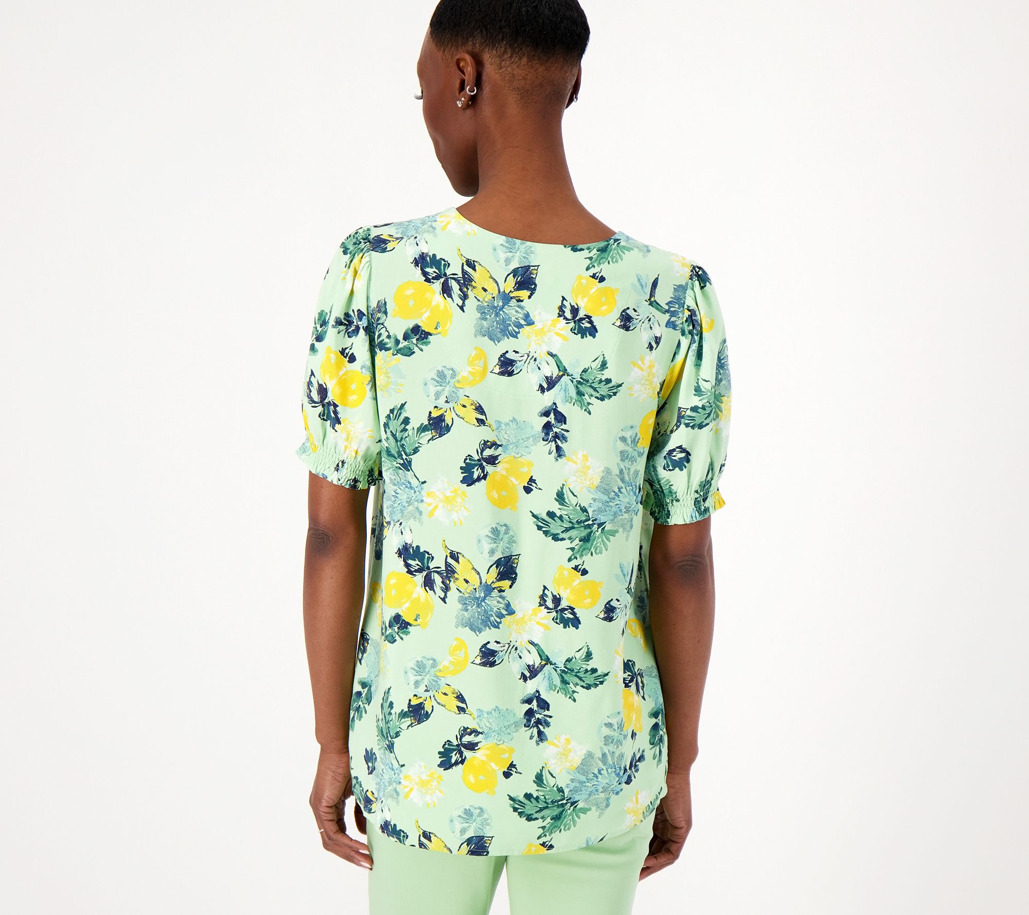 Busy day ahead? This cheerfully printed blouse will help you power through your day with pep in your step (and the smocked cuffs add subtle style points). From Denim & Co.® Fashions.