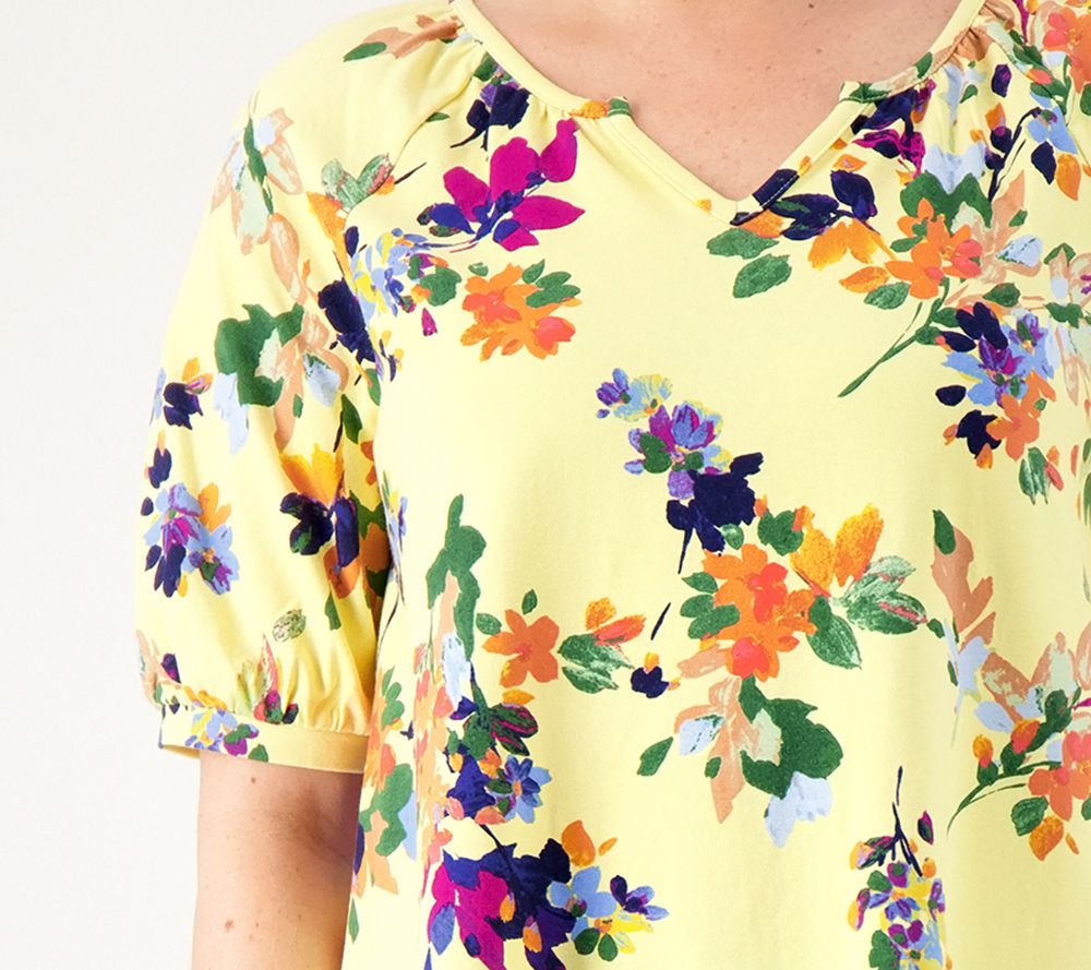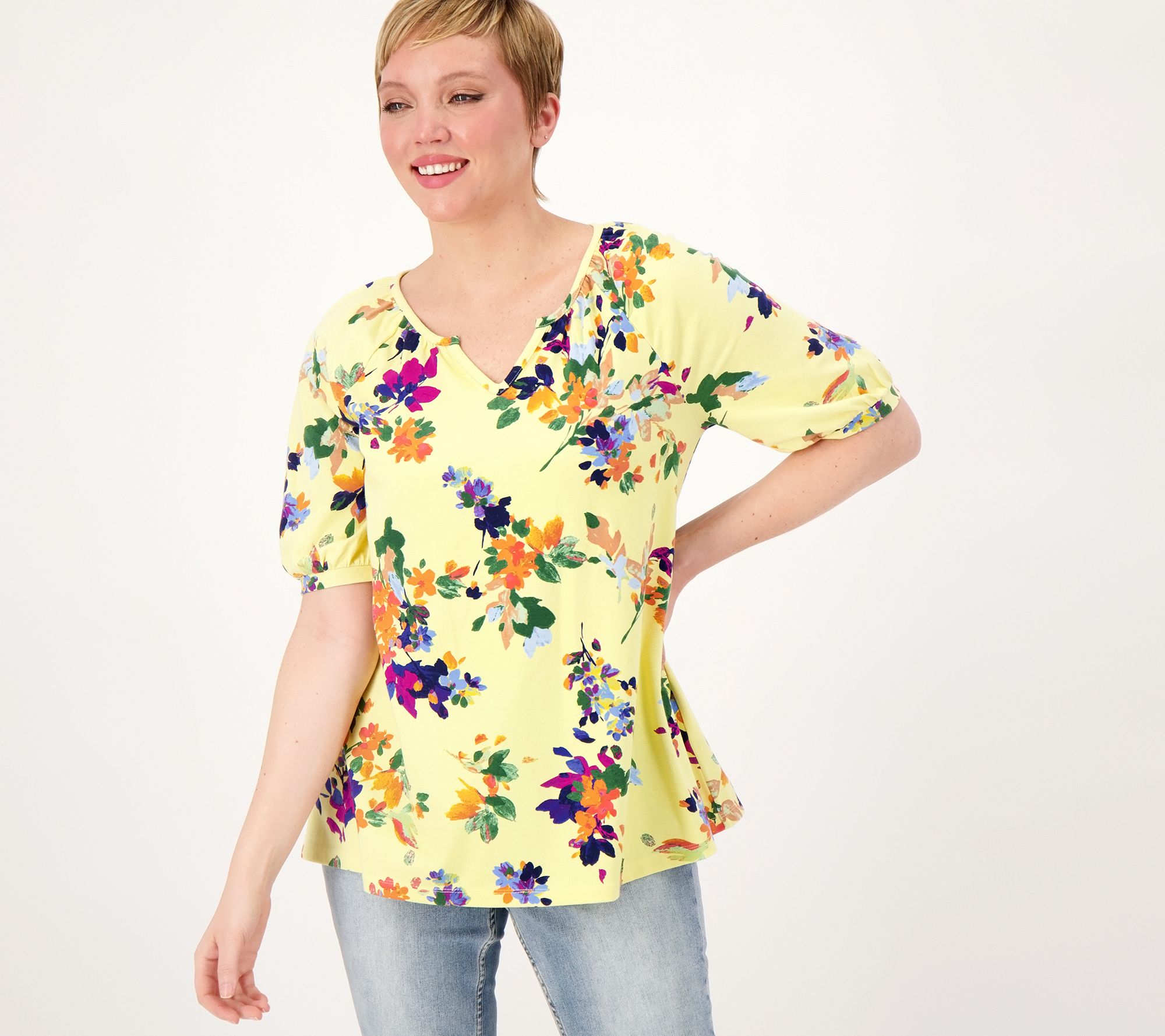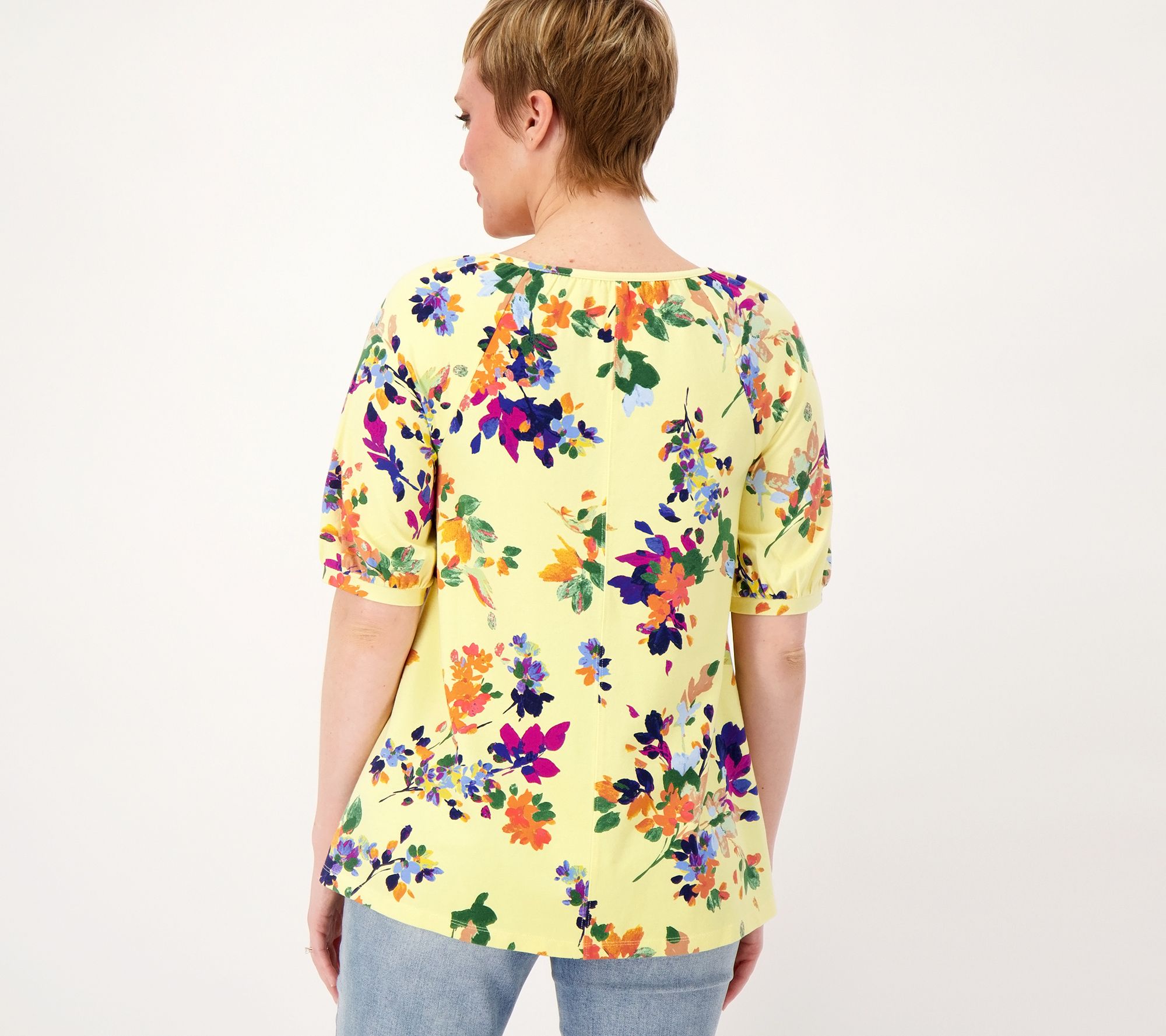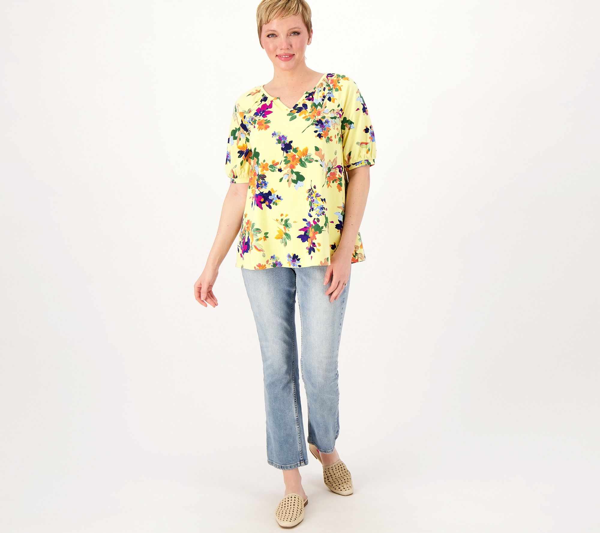 Covered in a fresh floral print, this short-sleeve top boasts cheerful springtime vibes. Wear it with jeans and slip-on flats to brighten your mood and your day. From Denim & Co.® Fashions.
