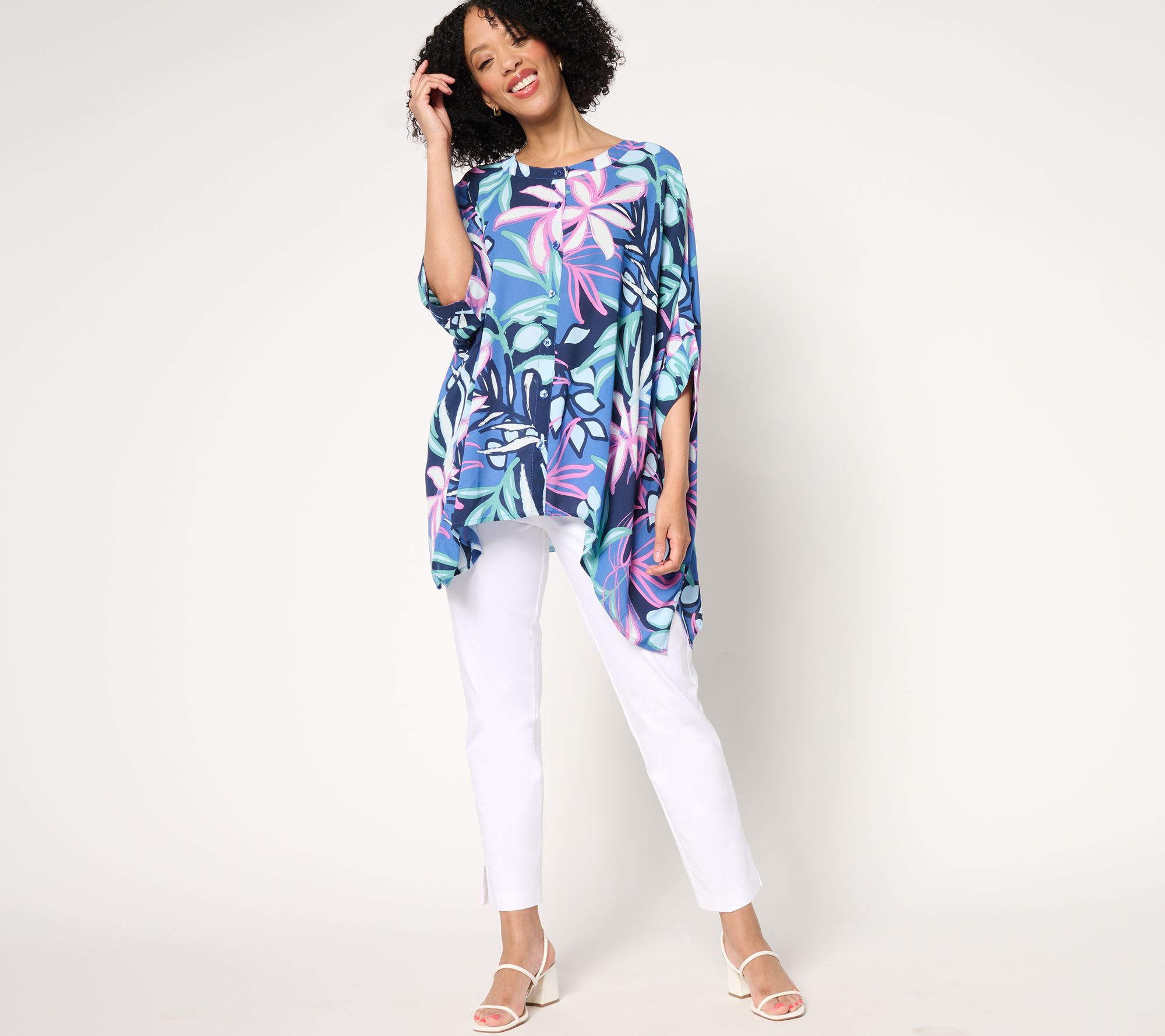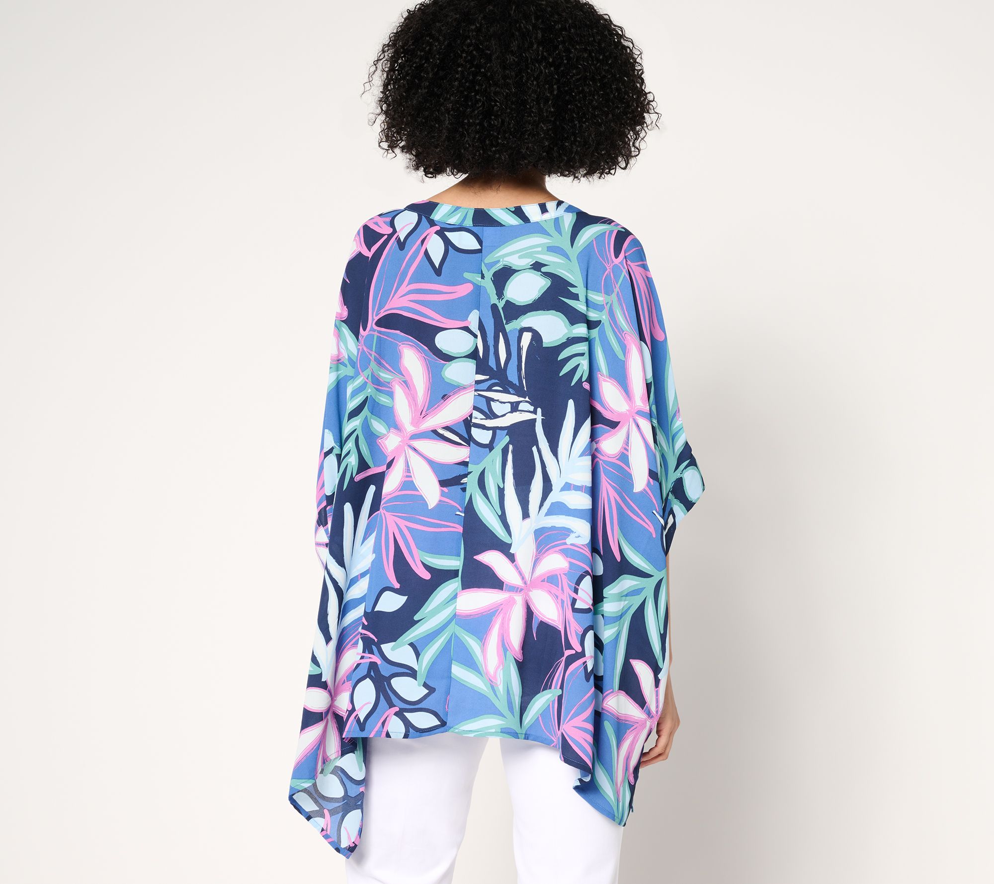 Command the room. Denim & Co.'s georgette caftan tunic owns the moment with a tropical floral print and relaxed silhouette that stands out. Head-turning attention is on the horizon. From Denim & Co.® Fashions.