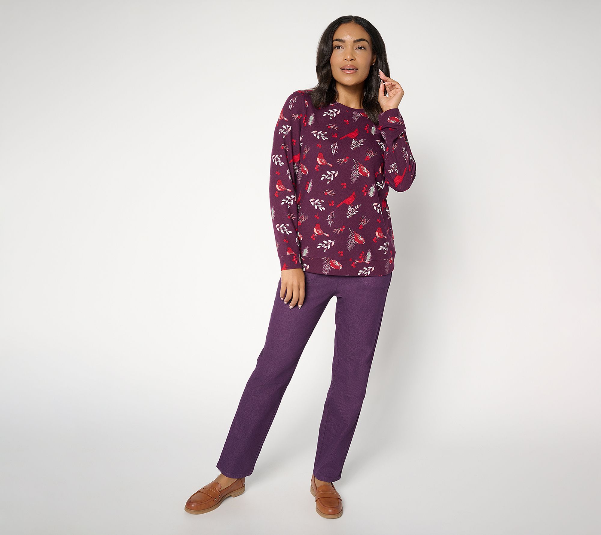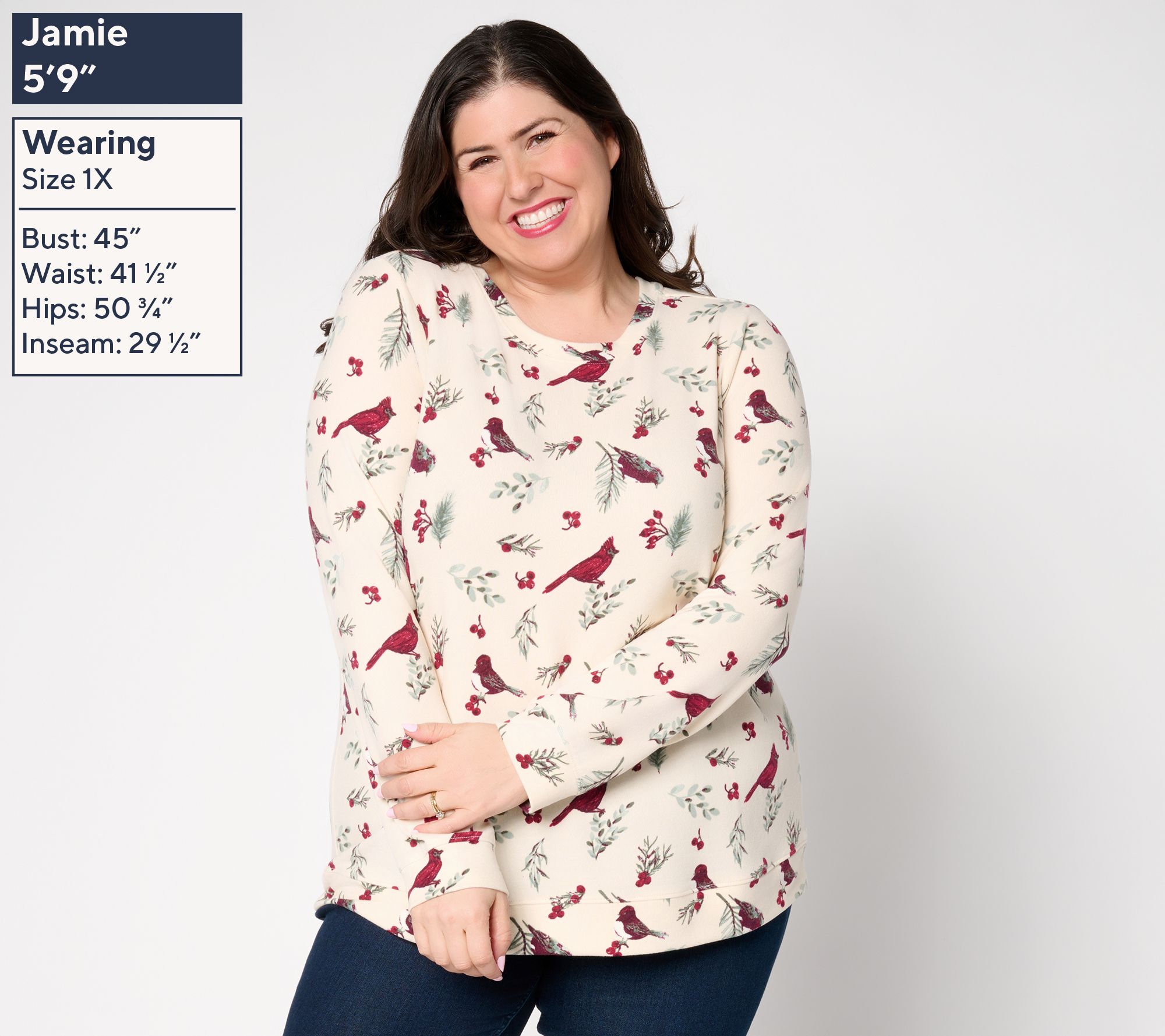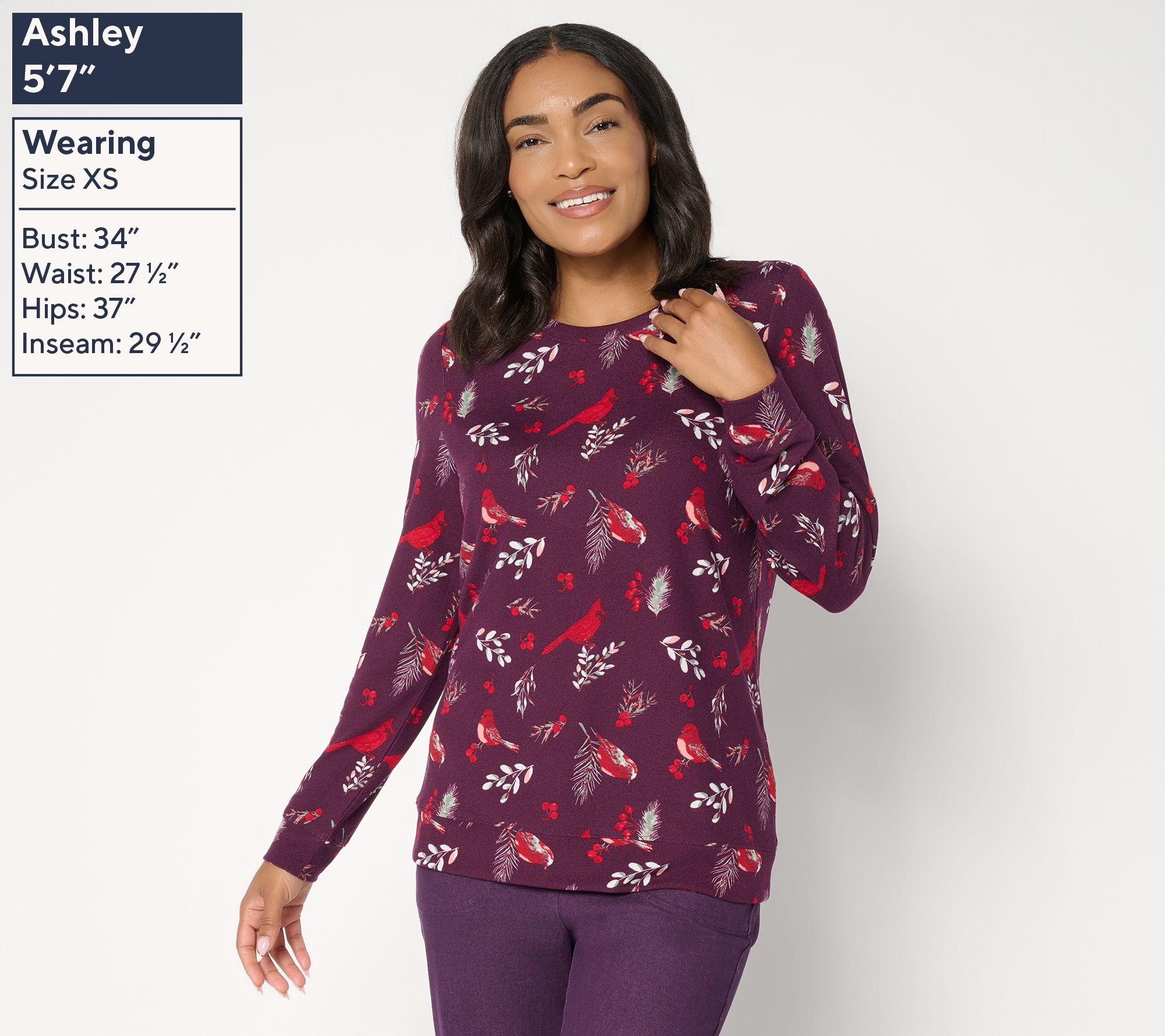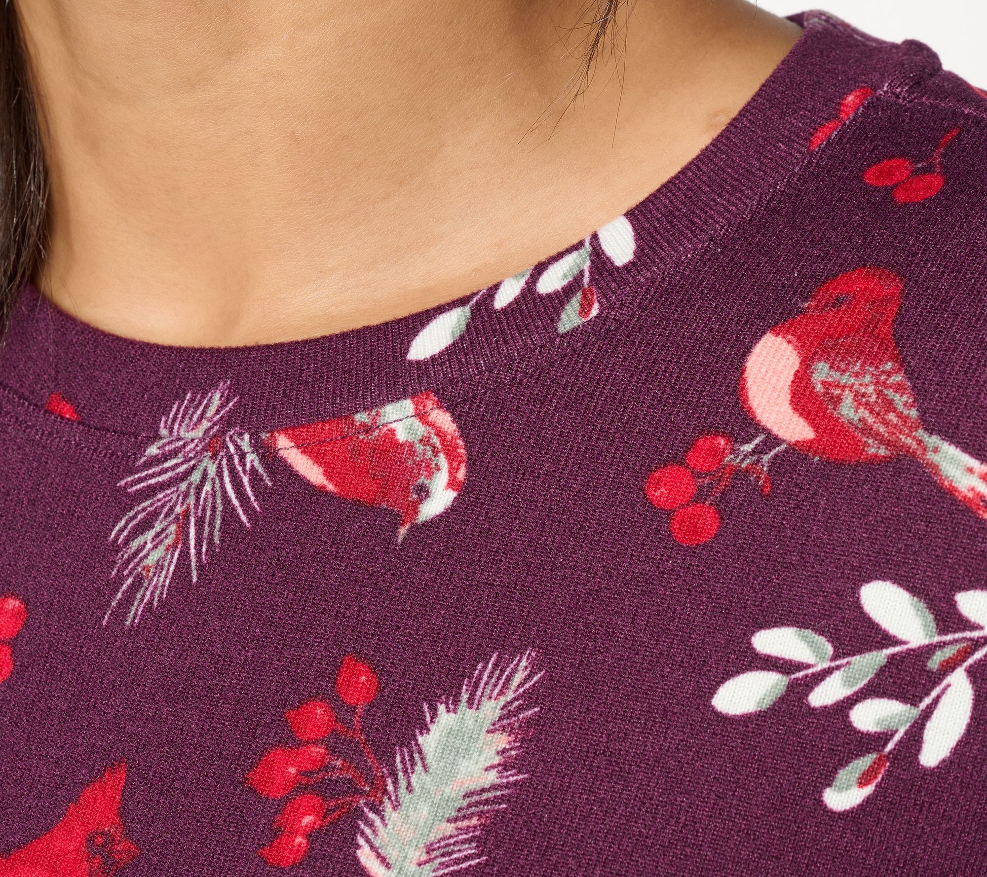 A little birdie told us you might like this printed knit pullover. Punctuated with pine branches, holly berries, and wintry warblers, this soft Heavenly Jersey long-sleeve top brings all the seasonal feels along to a stroll through the park, a casual coffee date, or even a day at the office. From Denim & Co.® Fashions.
