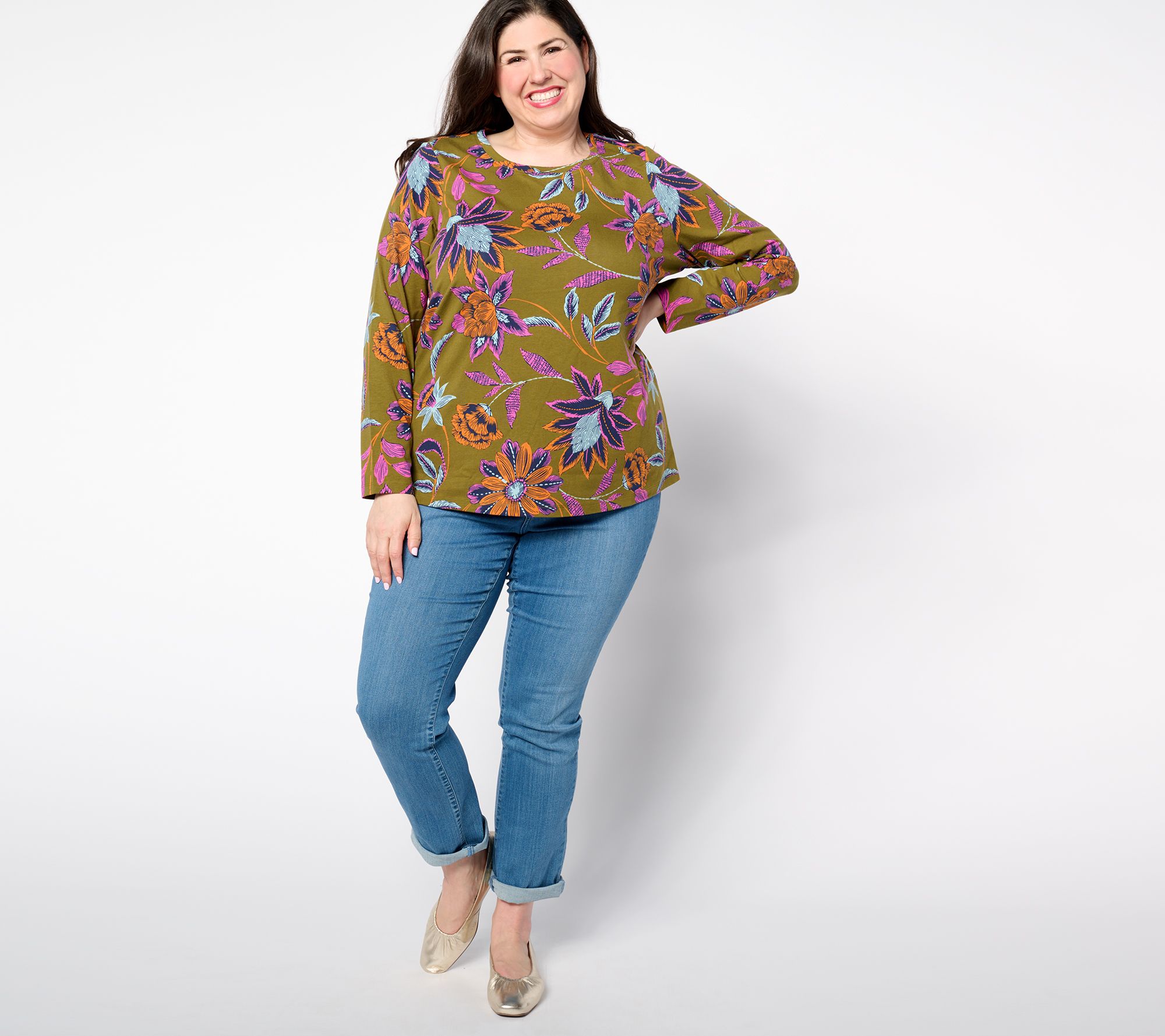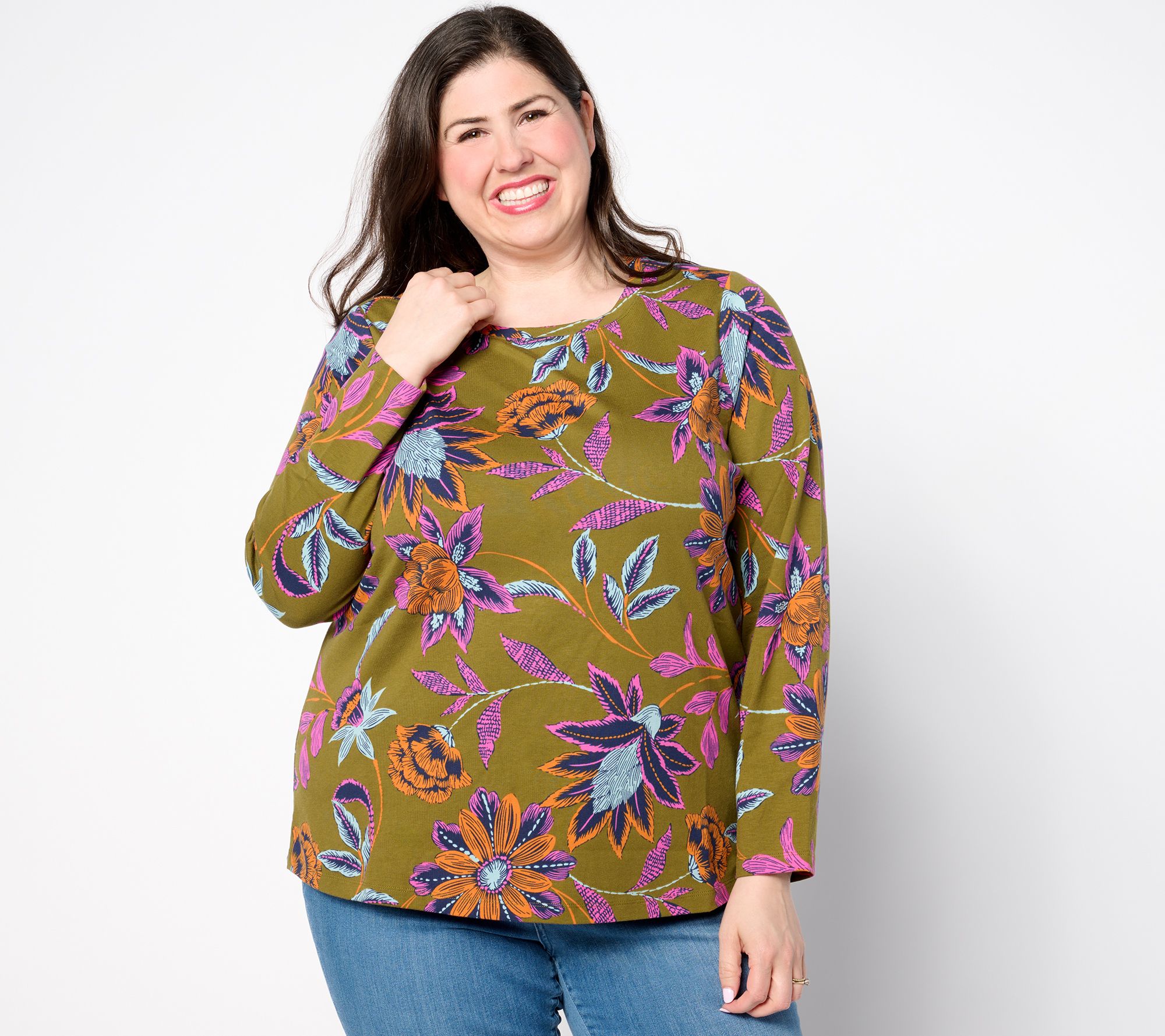 A pop of print? Yes, please! Add a touch of casual elegance to your wardrobe with this printed Perfect Jersey long-sleeve top. From Denim & Co.® Fashions.