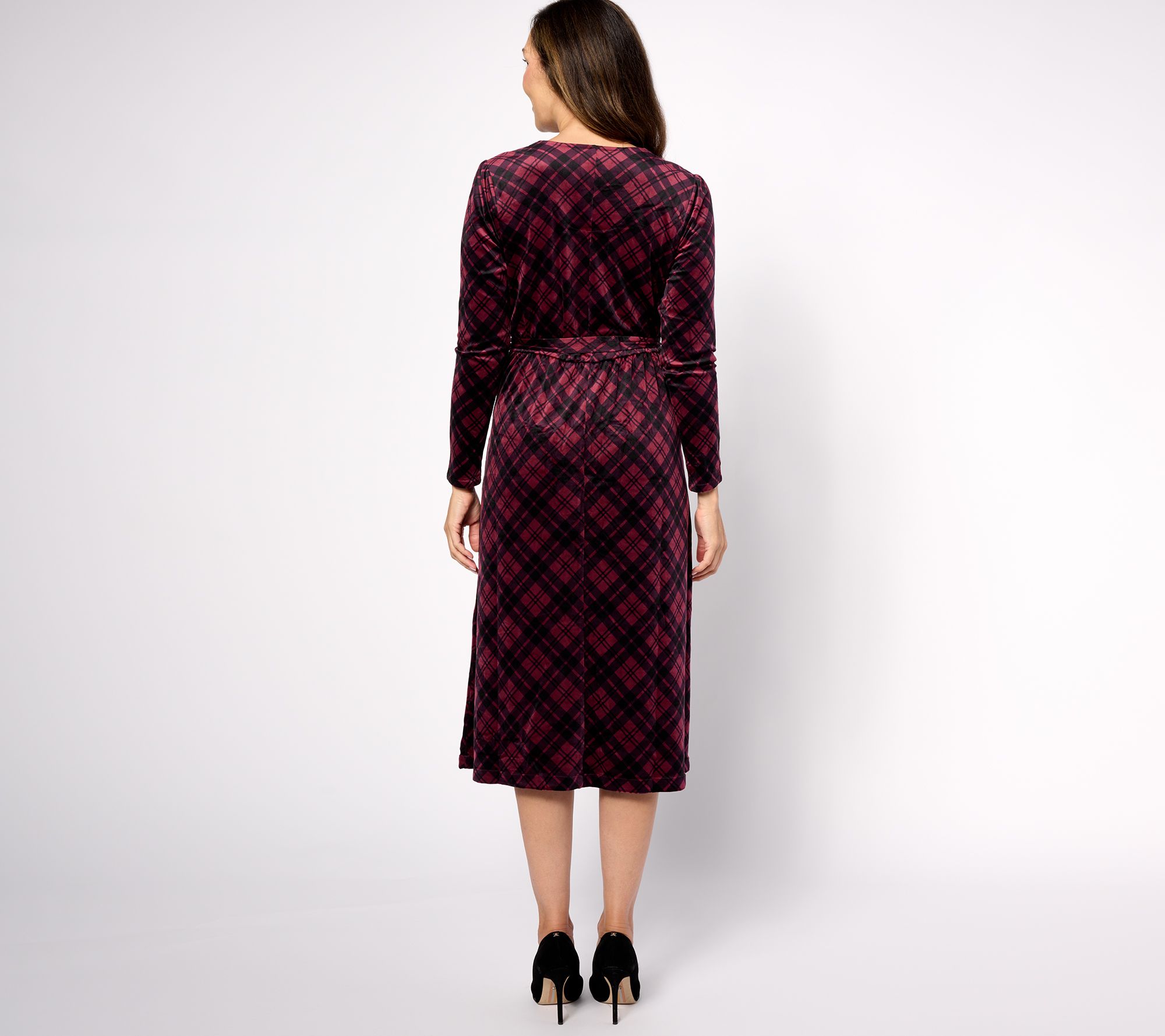 • Features: printed velour, V-neckline with stitched down faux wrap design, encased waist with self belt, side seam pockets, center-back seam with inside half-moon patch at neck