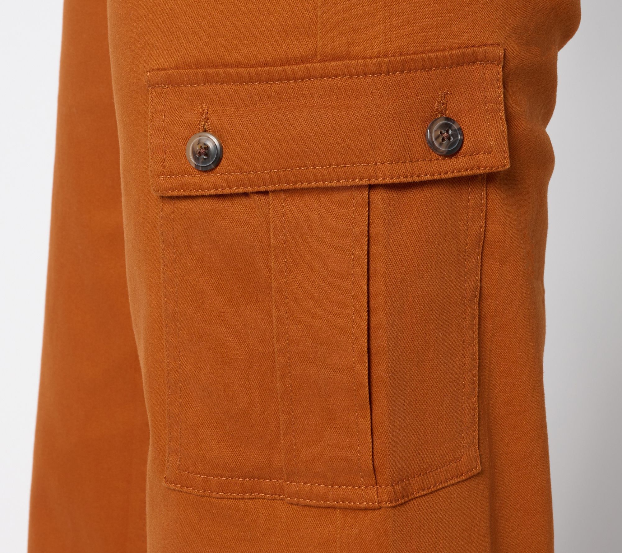 • Features: functional double-button waistband, functional fly, encased elastic at back gathered waistband, front slash pockets, top applied back pockets, top applied cargo pocket at wearer's left leg, belt loops, full length