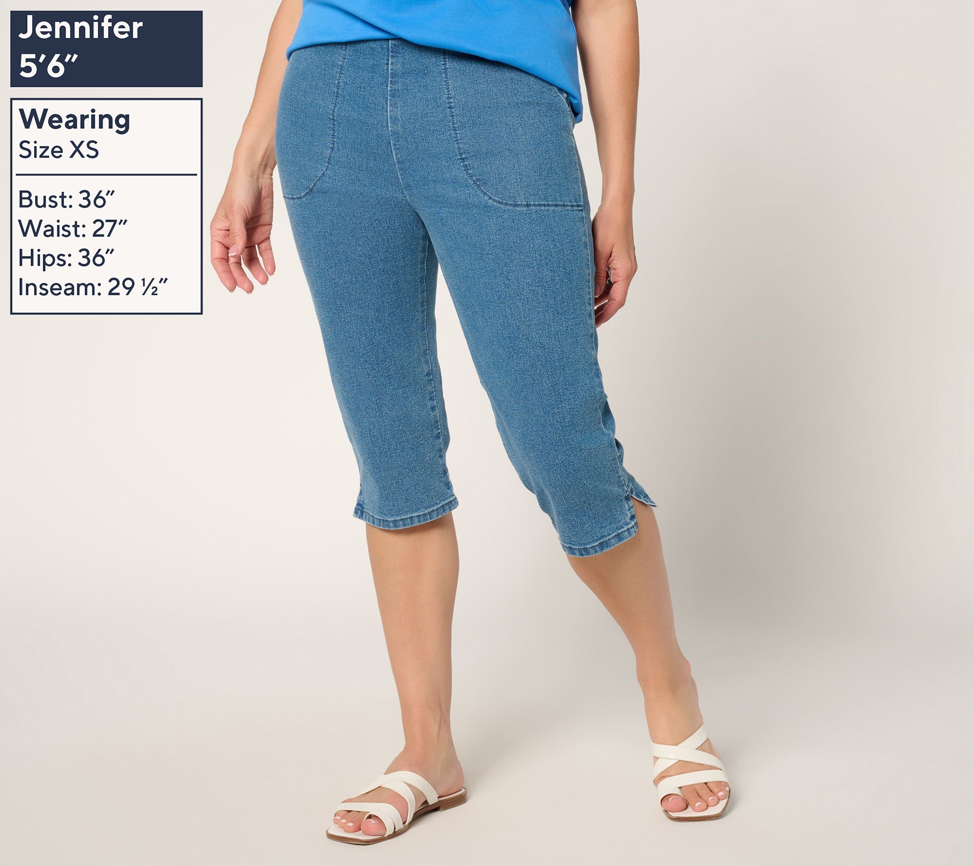 Ready for sunny-day plans? These denim skimmers offer pull-on ease and a smooth silhouette, thanks to a flat front waistband and stretchy elastic at the back. Spacious side pockets and breezy side slits keep you comfortable and practical -- just add your favorite sandals and you're set for weekday errands, lunch al fresco, or vacay adventures. From Denim & Co.® Fashions.