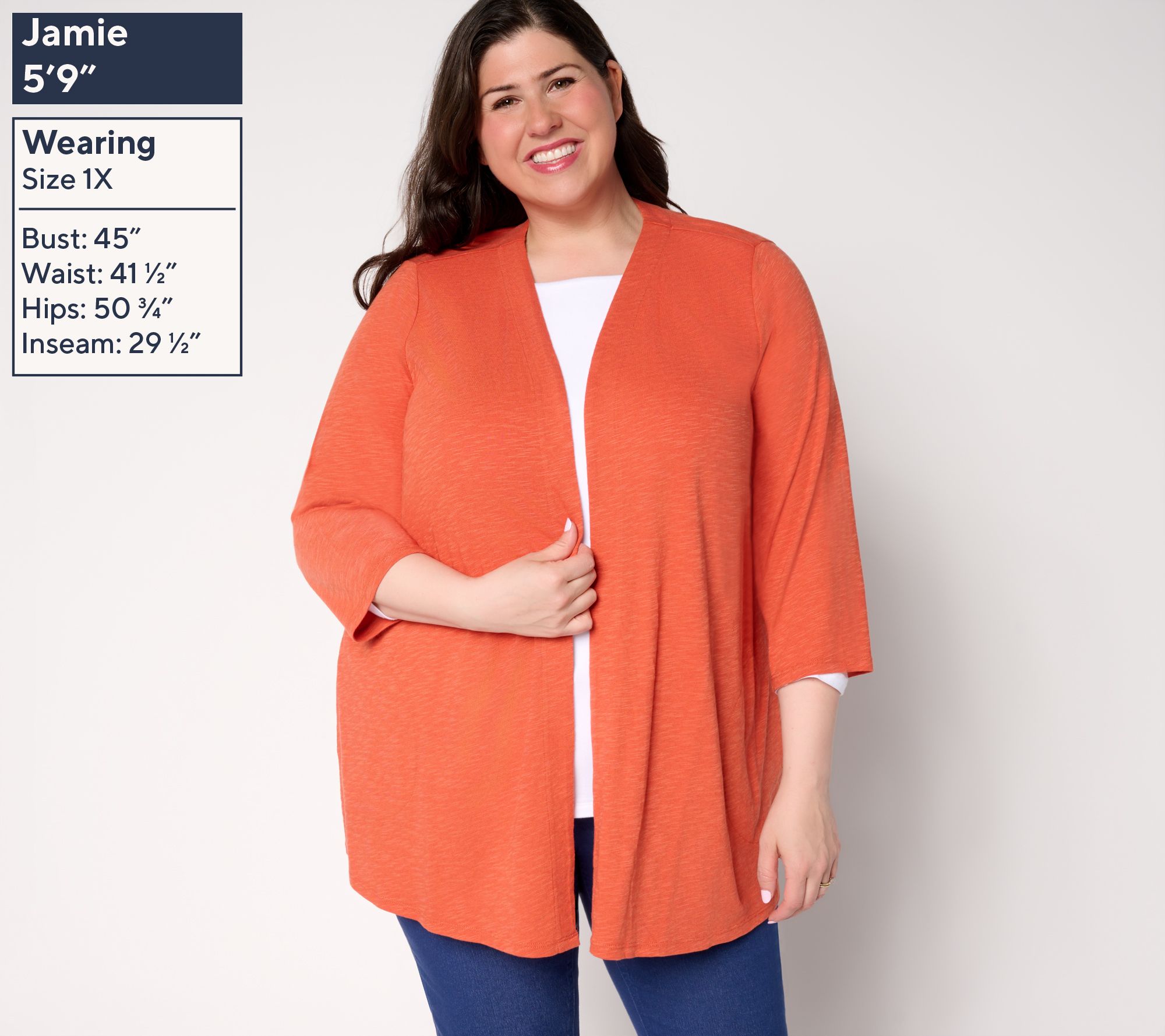 • Features: 3/4-length sleeves, open front, side seam pockets