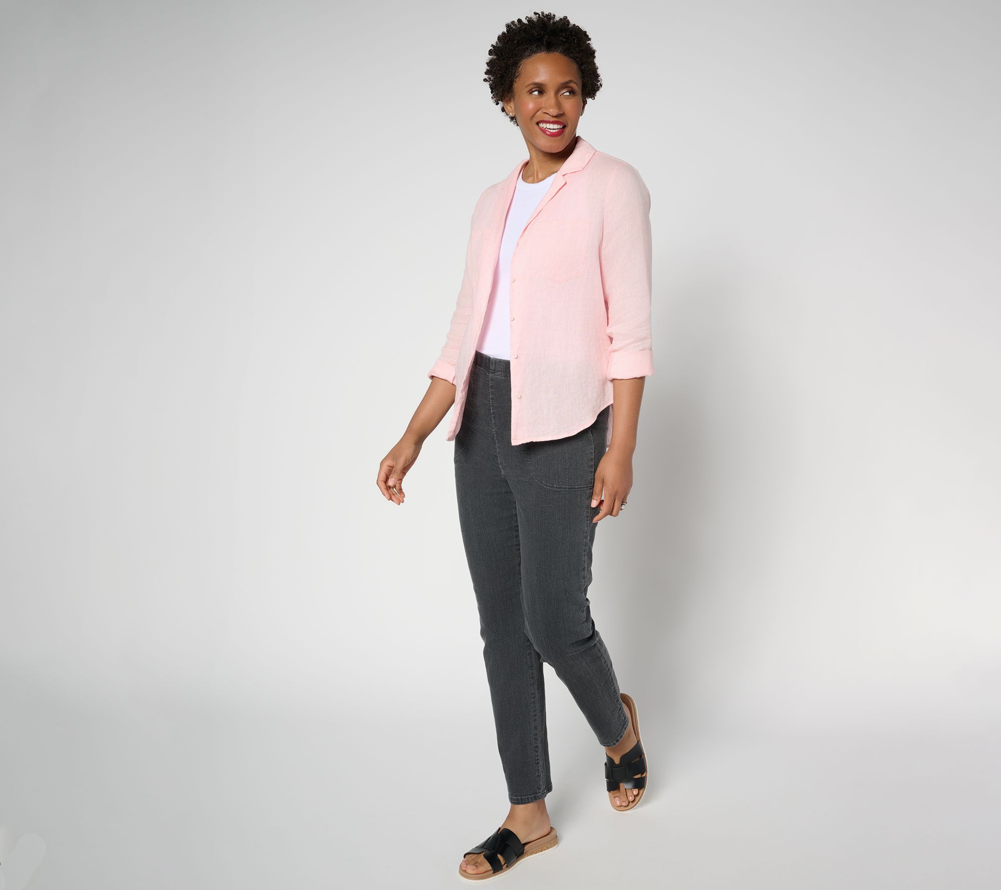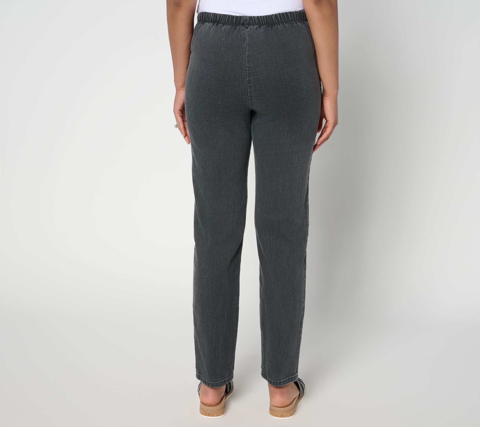 Lounge looks, step aside. Add a lift to your everyday look with these Denim & Co. pull-on pants. Comfortable for casual days at home thanks to cotton-rich denim, their flat front design and ever-popular straight leg transition seamlessly to more polished occasions with no-fuss style. Confidence + comfort = the perfect collab. From Denim & Co.® Fashions.