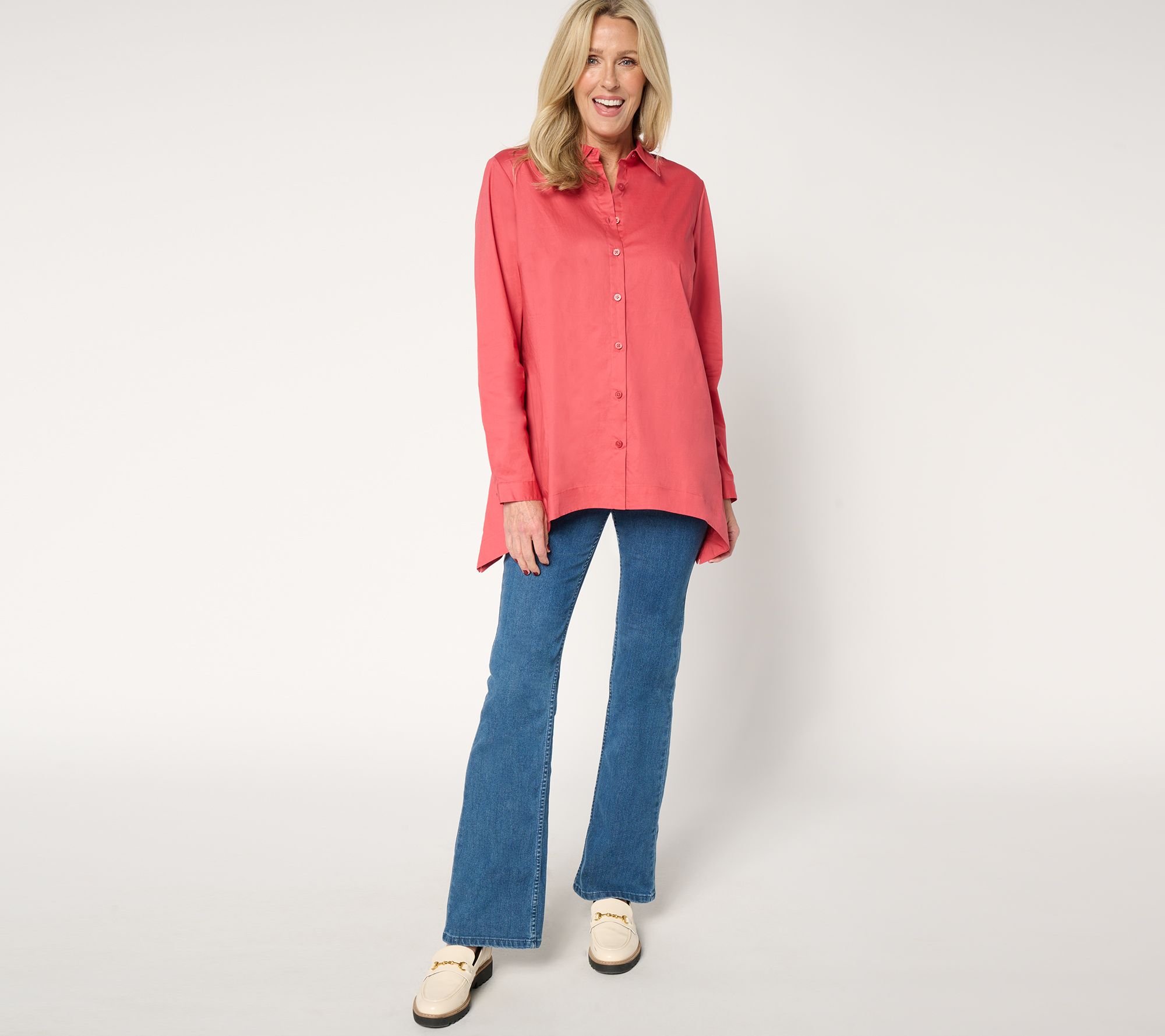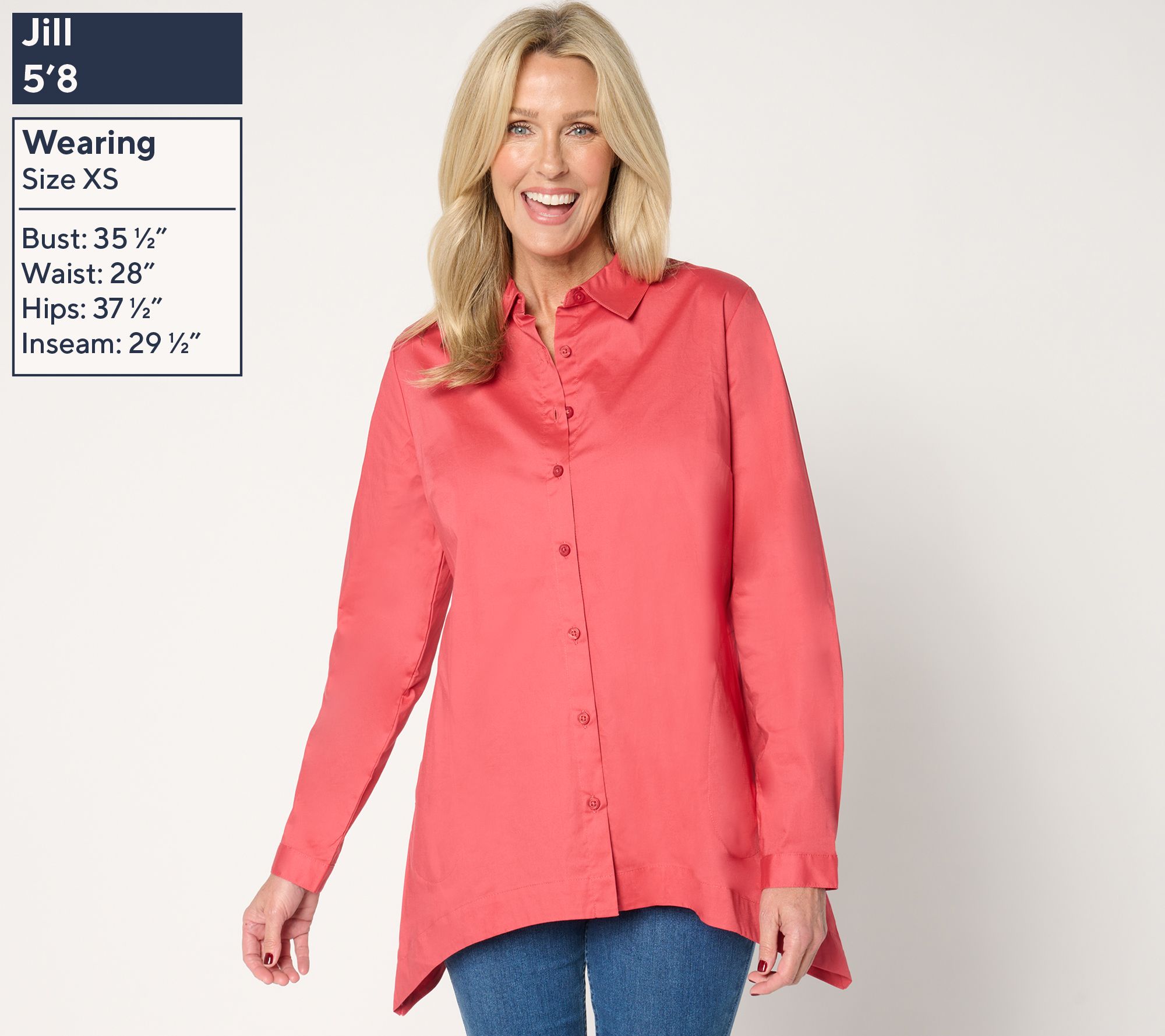 Playful yet polished, this poplin tunic combines a classic button-up silhouette with more modern touches (such as the slight sharkbite hem and side seam pockets). From Denim & Co.® Fashions.