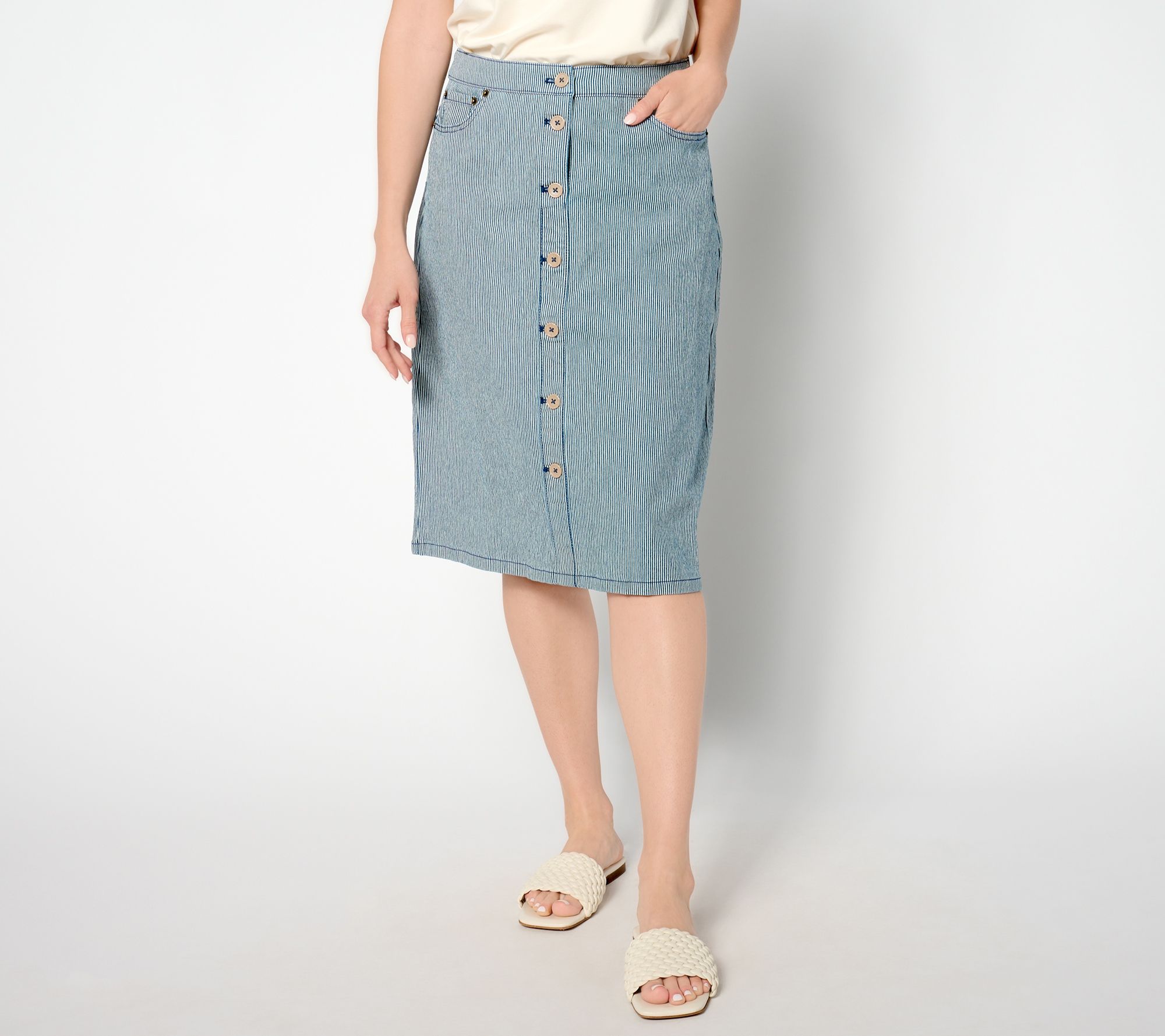 "As Is" Denim & Co. Regular Button Front Striped Denim Midi Skirt