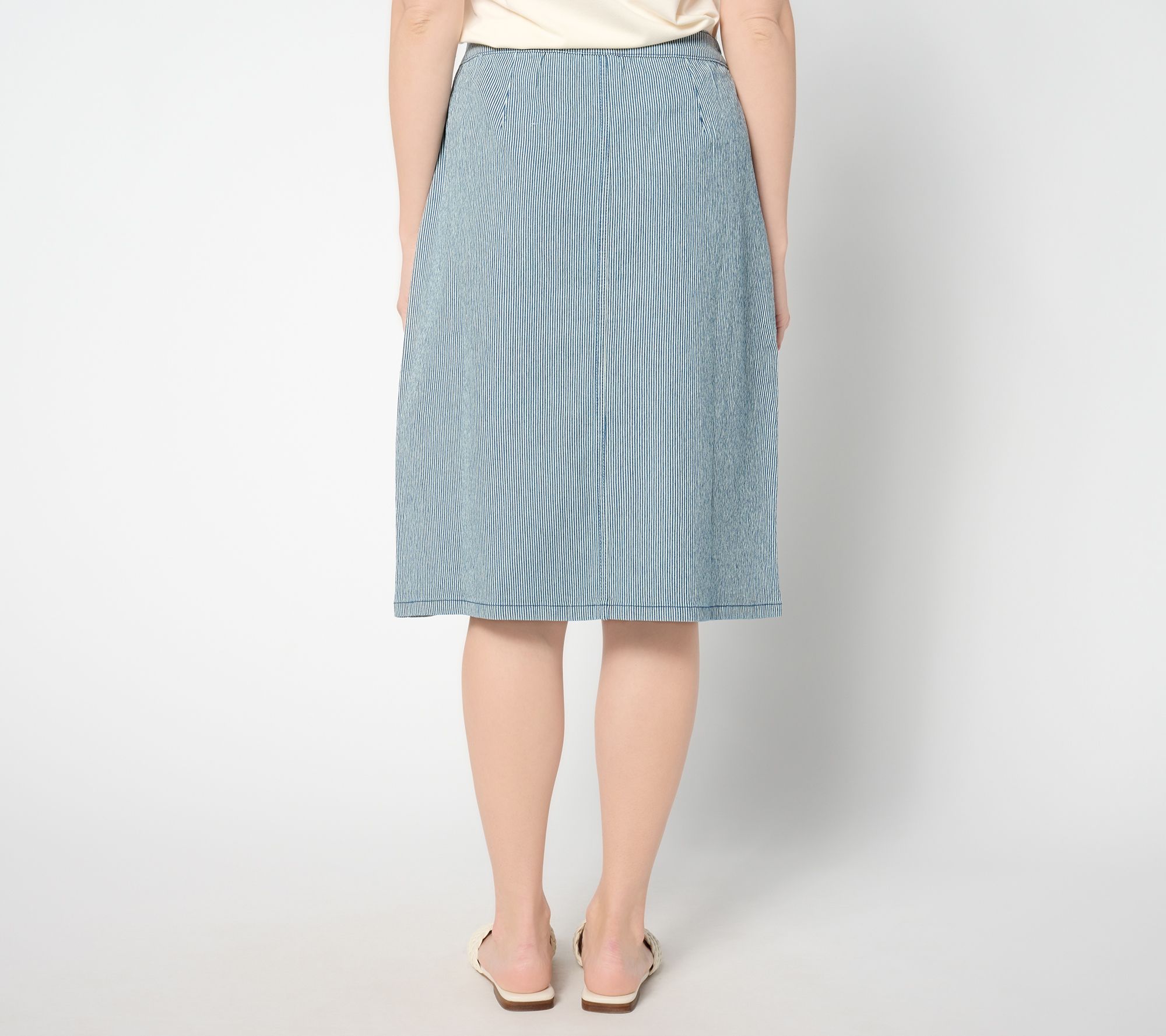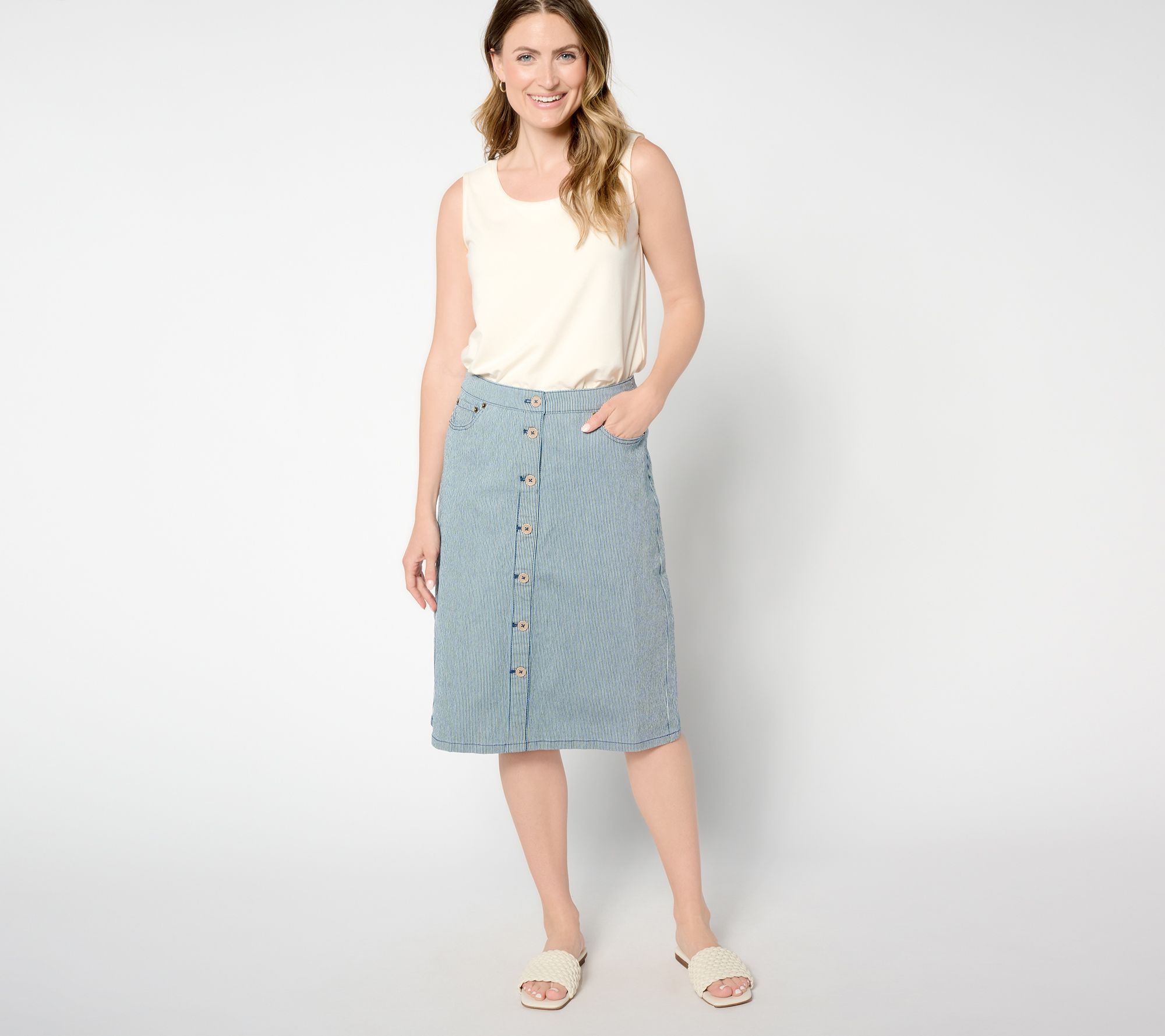 With buttons down the front and a yarn-dyed striped design, there's nothing basic about this denim skirt. Wear it when you want to elevate your everyday looks (and leave behind those stiff-legged jeans!). From Denim & Co.® Fashions.