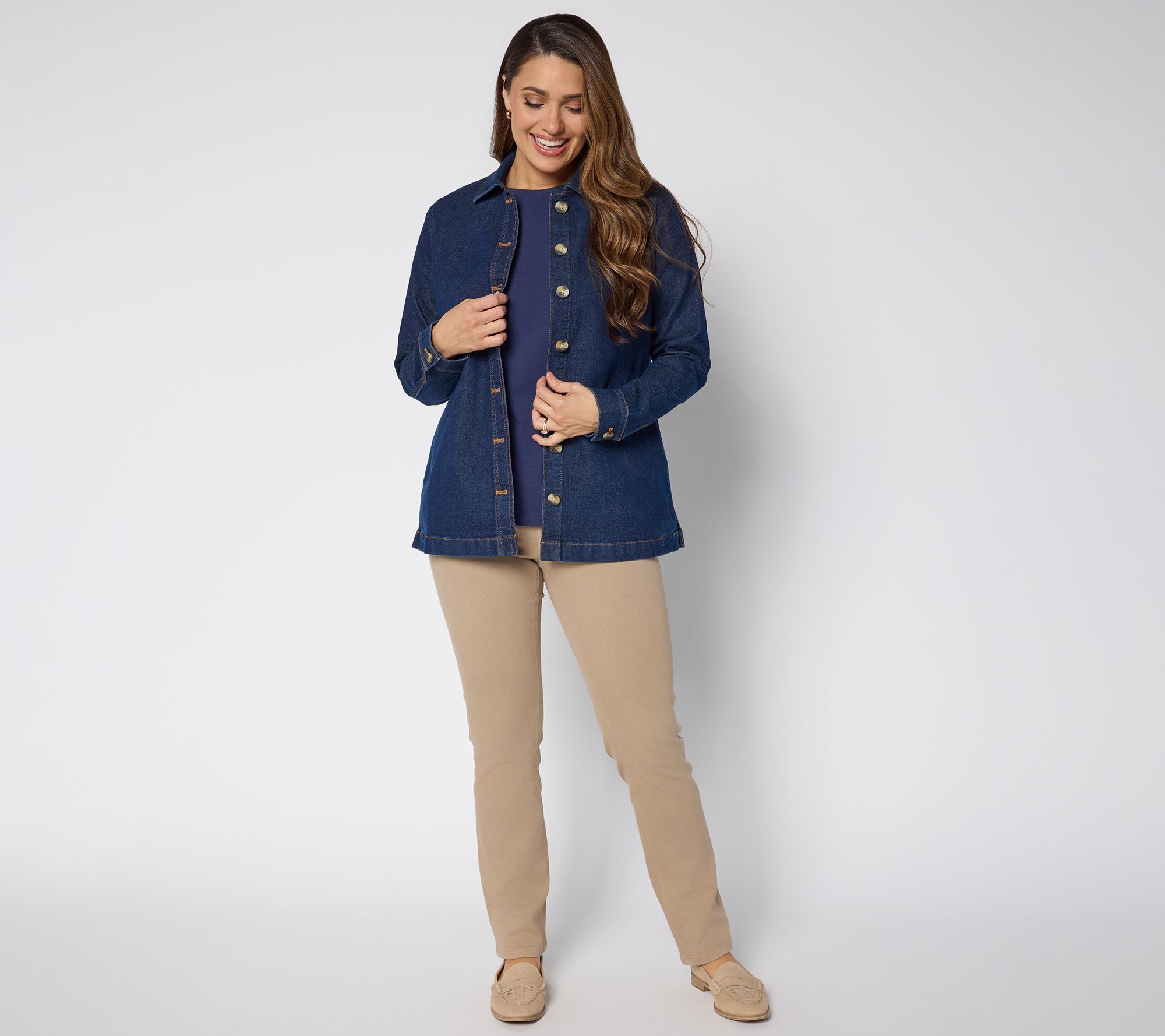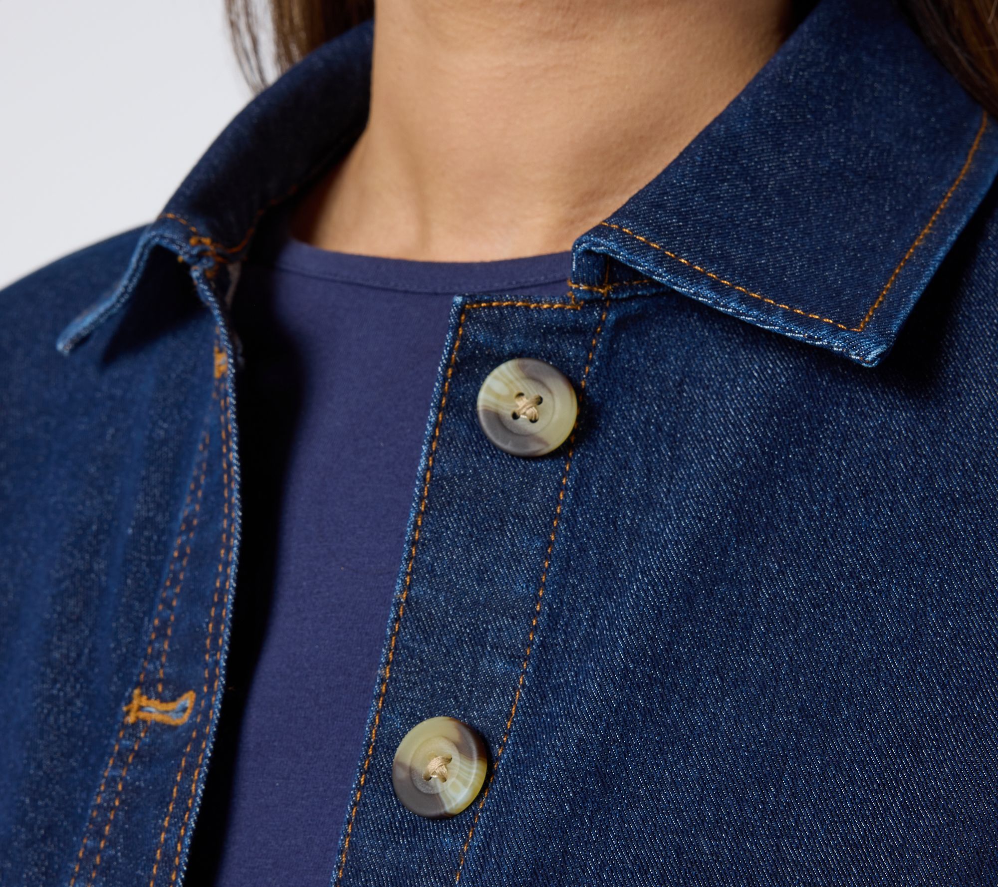 Effortlessly take your look from the farmers' market to lunch in this Classic Stretch denim jacket. Its streamlined chore jacket styling is a winner over all your favorite tees and tunics. Handy side pockets make stashing essentials simple when you're on the go. From Denim & Co.® Fashions.