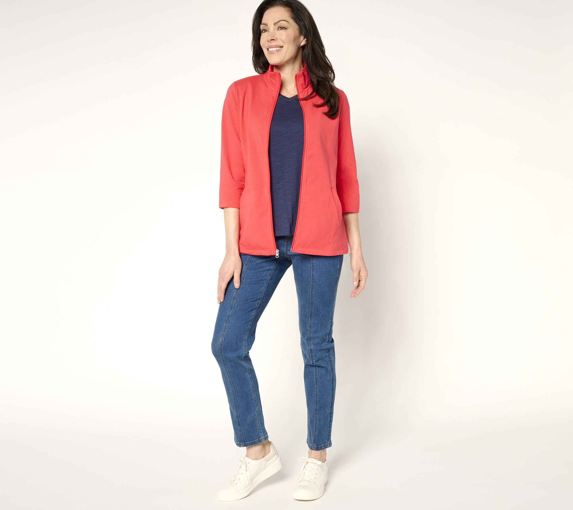 Get ready to slip into something effortlessly chic -- this versatile Duo-Stretch knit jacket. Perfect for layering over tees, tanks, or blouses, the zip-up jacket features a 3/4-sleeve design that's ideal for showing off your favorite bracelet. You'll always be stylish and comfortable with this pocketed piece on hand! From Denim & Co.® Fashions.