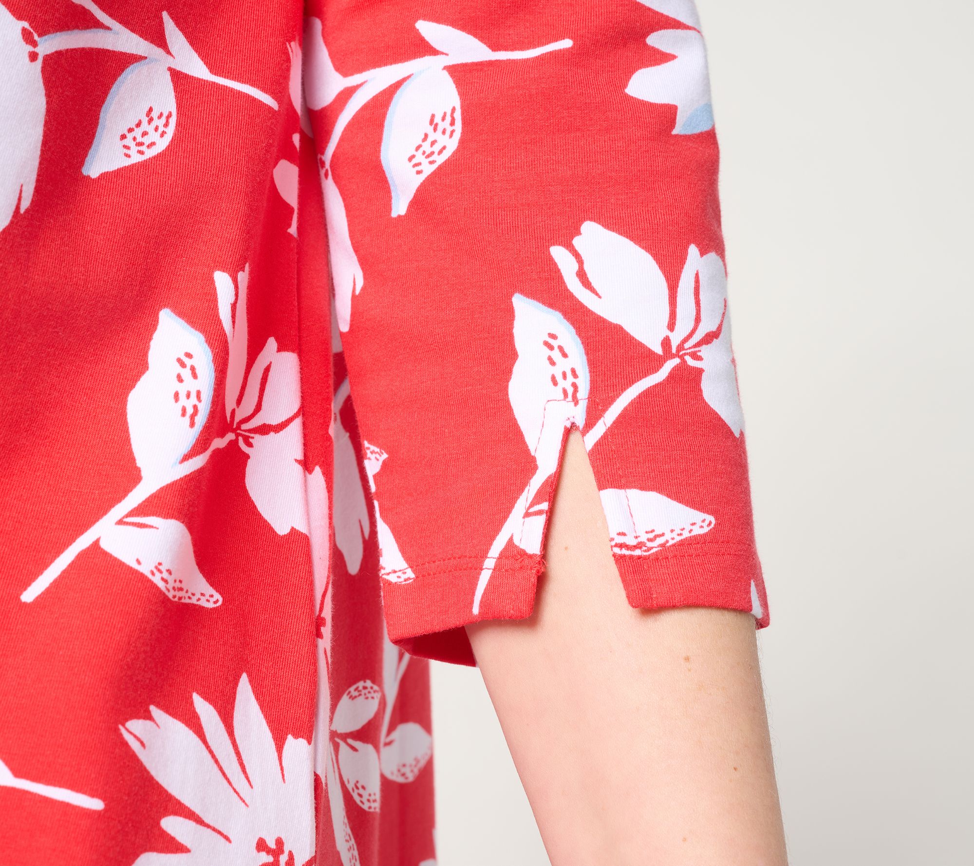 • Features: allover print, boat neckline, 3/4-length sleeves with front slit, straight bottom hem with side slits, swing silhouette