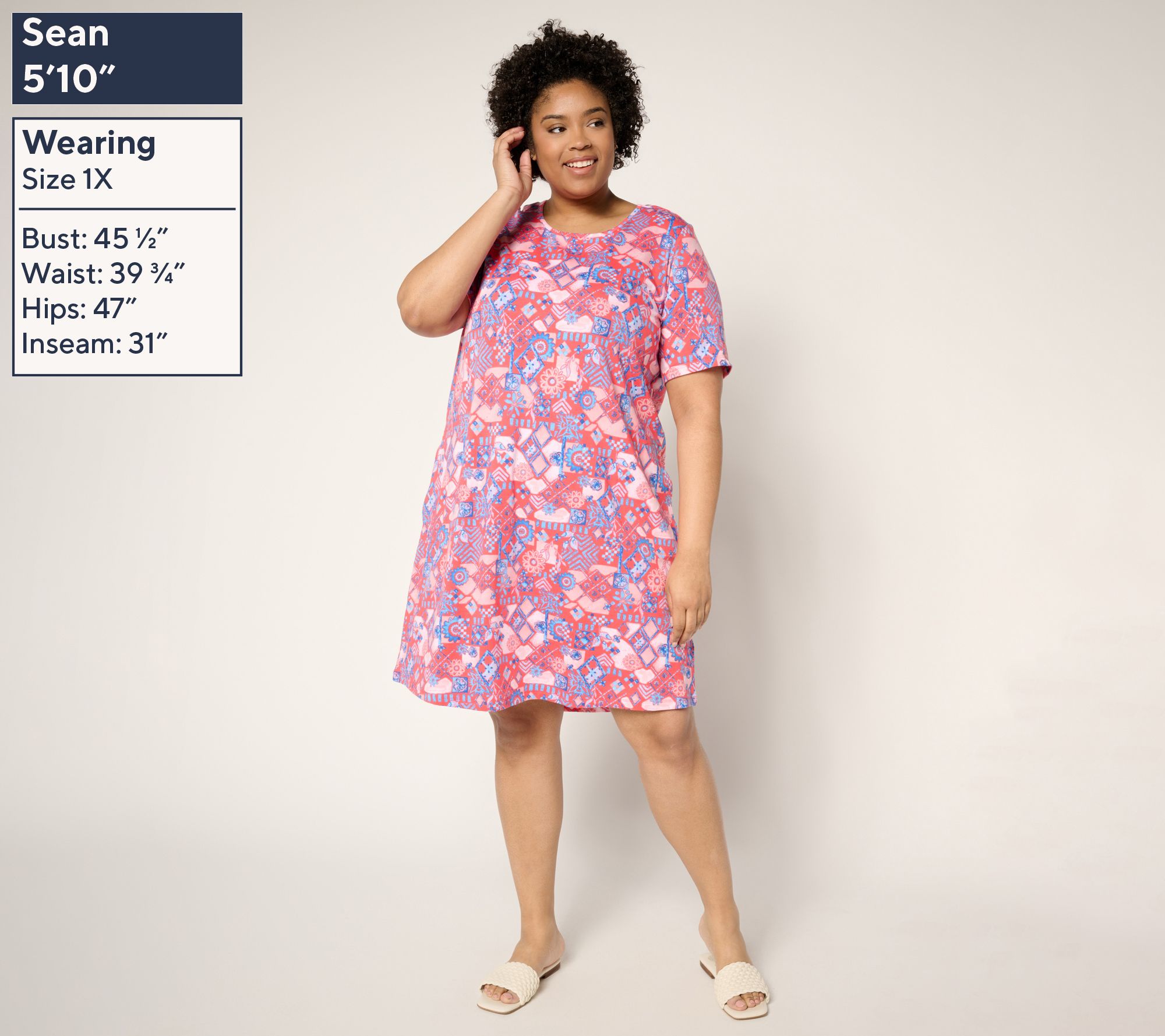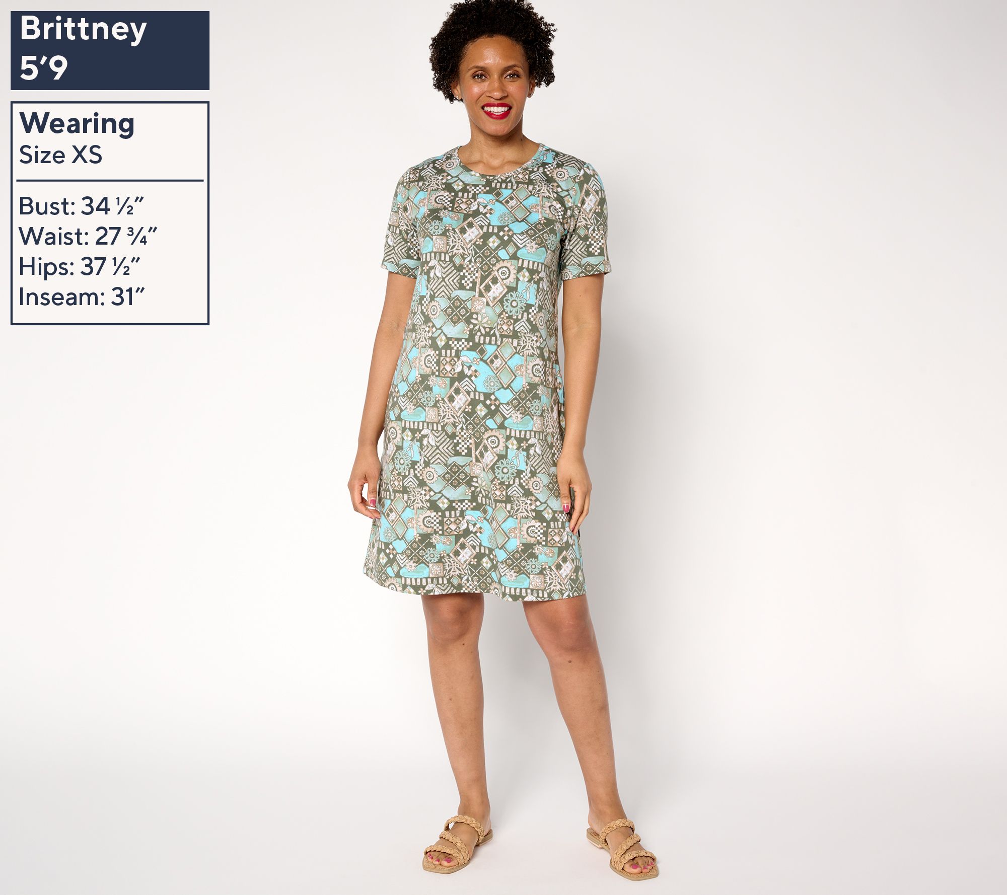 • Features: crew neckline, short sleeves, knee length, side-seam stitched-down pockets