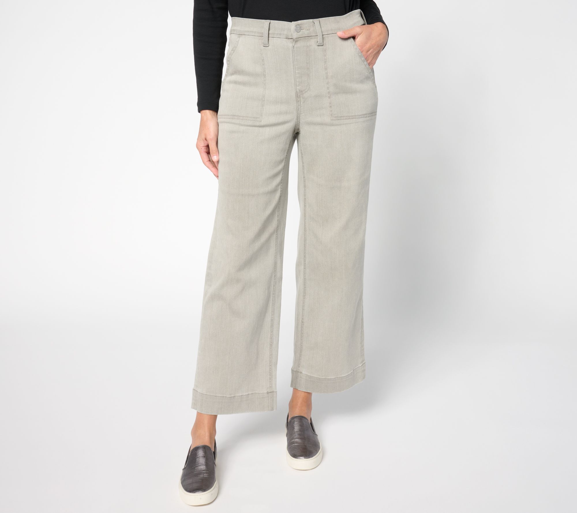 Elevate your everyday style with the Denim & Co. regular grey easy stretch wide leg ankle jean. These jeans offer a comfortable fit with a slightly below-the-waist rise and a wide-leg shape, perfect for pairing with your favorite tops and shoes. From Denim & Co.