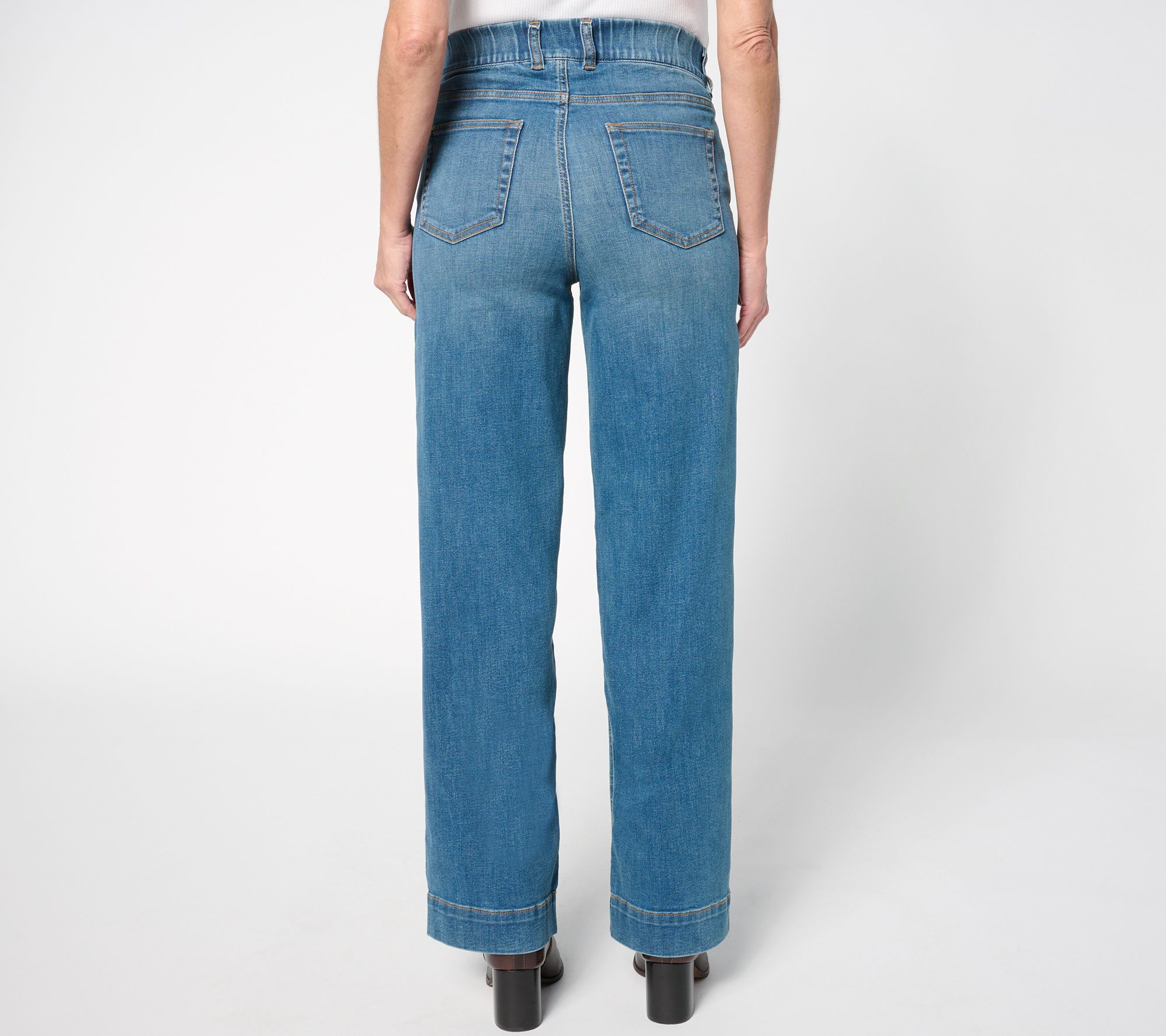 Updating your denim? Take the easy path to a trendy trouser style with these full-length jeans in Easy Stretch woven. A twin-button waistband and wide leg silhouette create a WOW moment with the season's cutest boots and blouses. From Denim & Co.® Fashions.