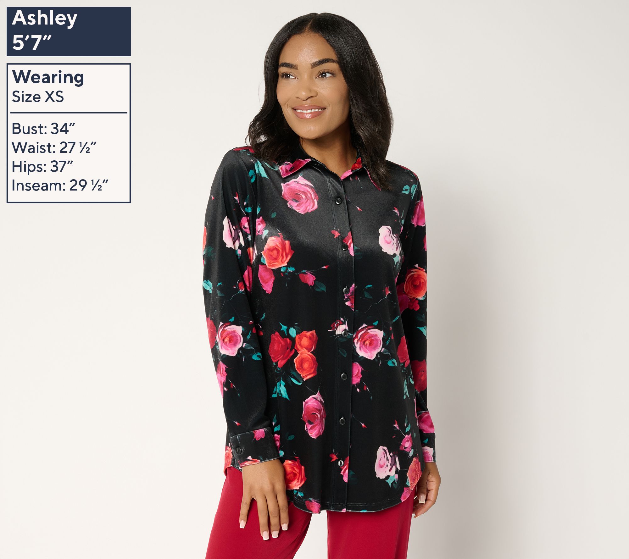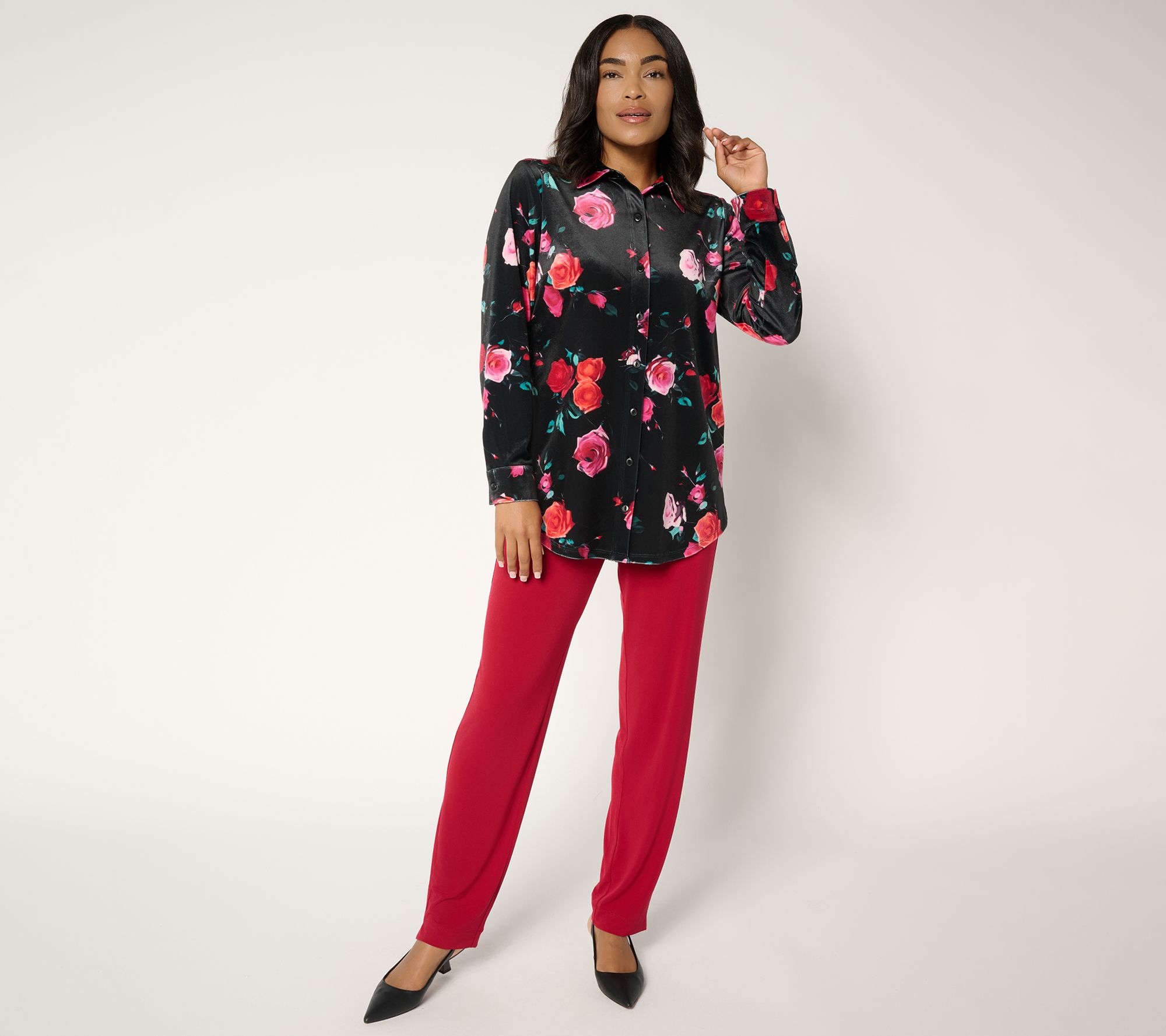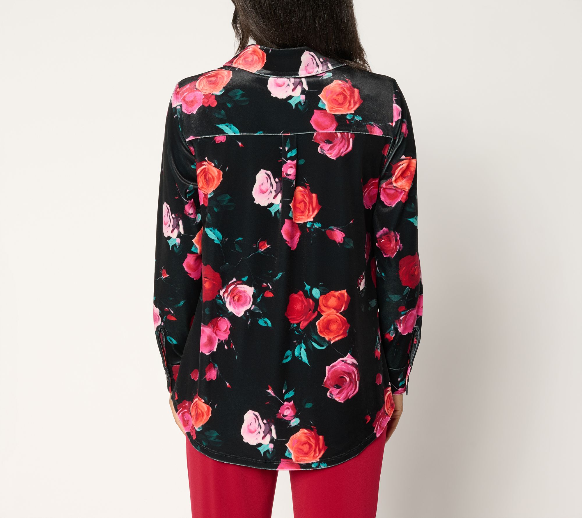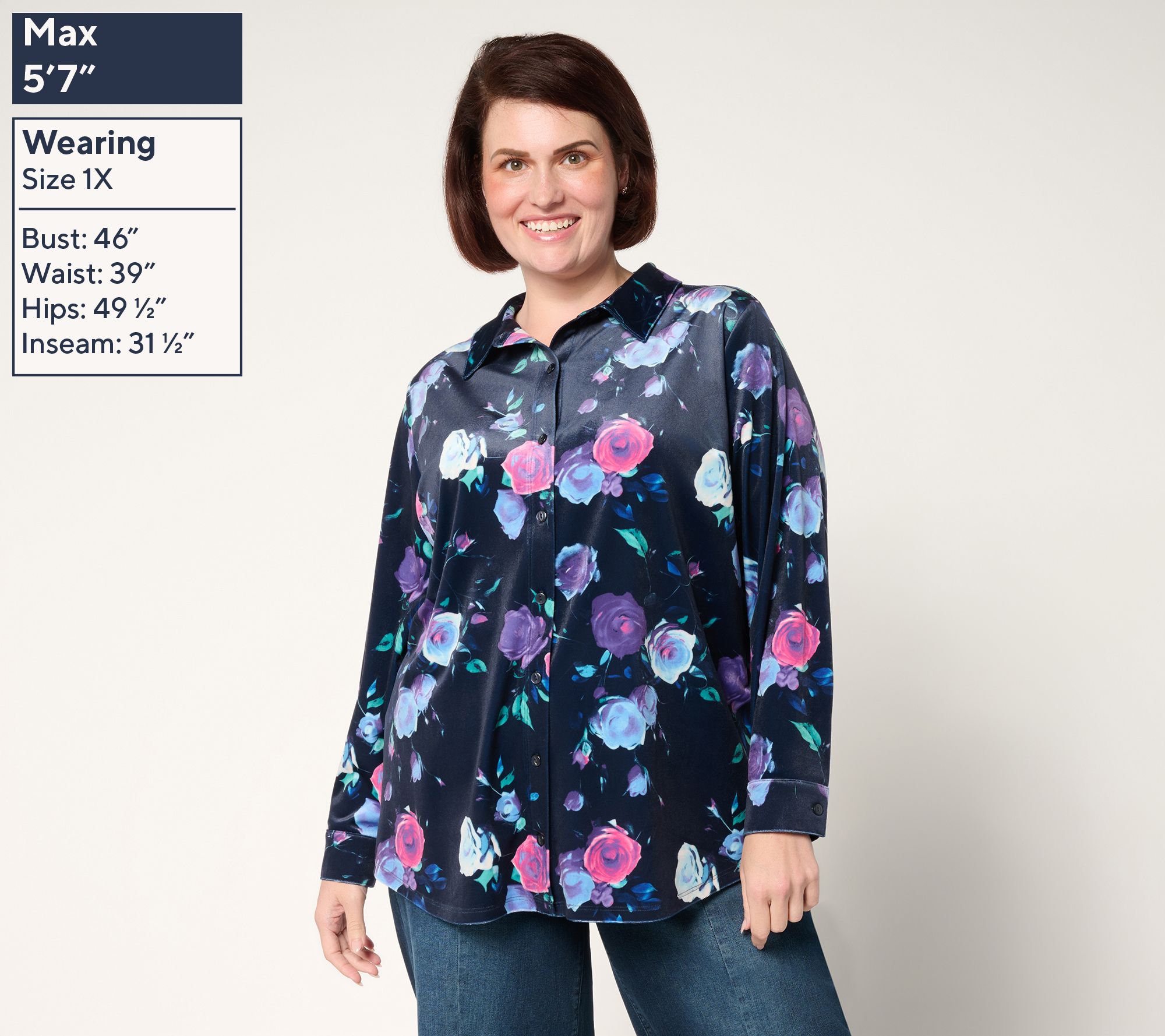 Soft knit velvet brings a lush vibe to this big shirt, designed for those moments when comfort and confidence matter -- think crisp mornings at the office or evening meetups. A bold fall floral print and relaxed fit create plenty of styling options, from layering over tees to buttoned-up work looks. From Denim & Co.® Fashions.
