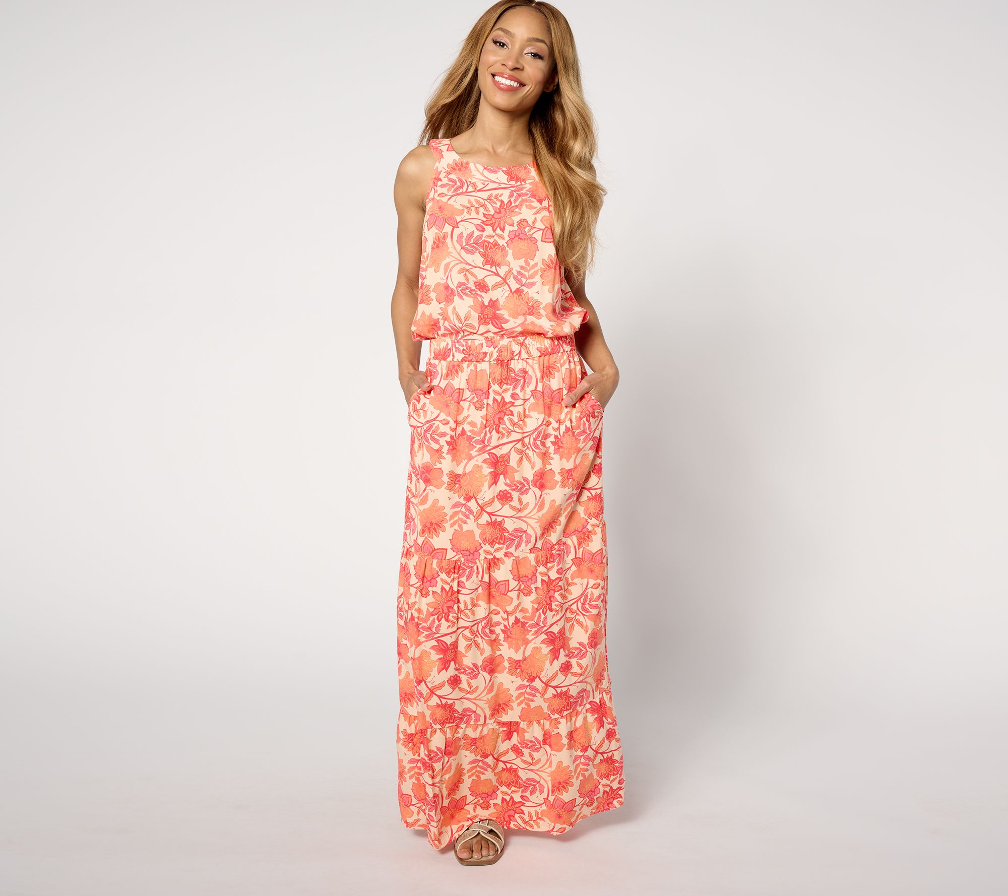• Features: encased elastic waistband, side-seam pockets, tiers with full sweep hem and straight hem line